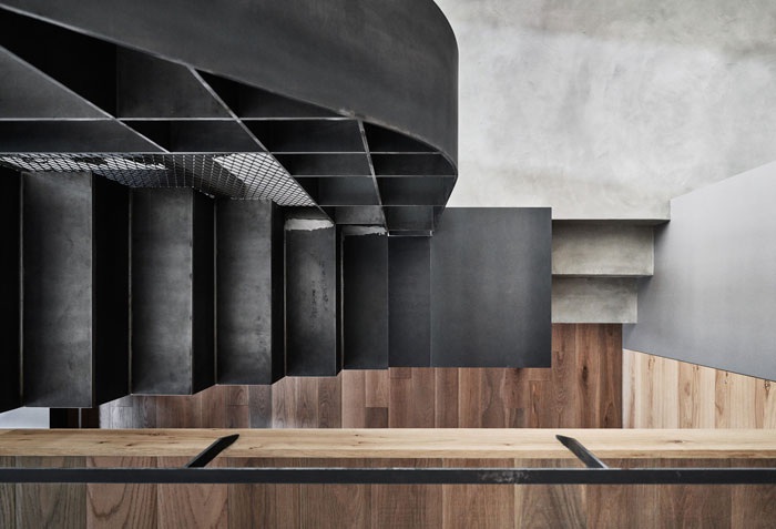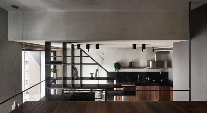 A kis méret ellenére ebben a lakásban minden funkció megtalálható, mégsem zsúfolt az összhatás. Ezt a nagy belmagasságnak köszönhetjük, ami lehetővé tette a galéria kialakítását. De nem csak függőlegesen, hanem vízszintesen osztották a teret: egy burkolat váltással illetve kis mértékű szinteltolással oldották meg a szeparációt. A galéria alatt helyet kapott az otthoni iroda, felette pedig a hálószoba,- a harmadik részben a nappali-konyha. A szín használata nagyon egyszerű, mégsem unalmas. Monokróm színek keverednek meleg - és kissé naturális - fa elemekkel.