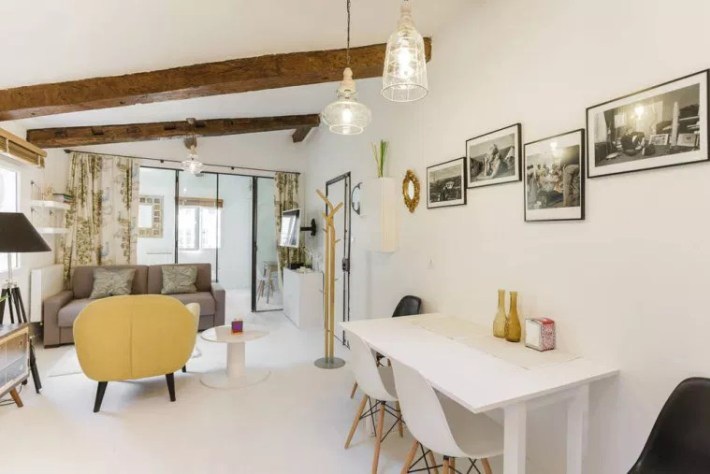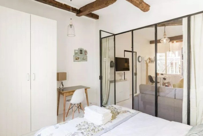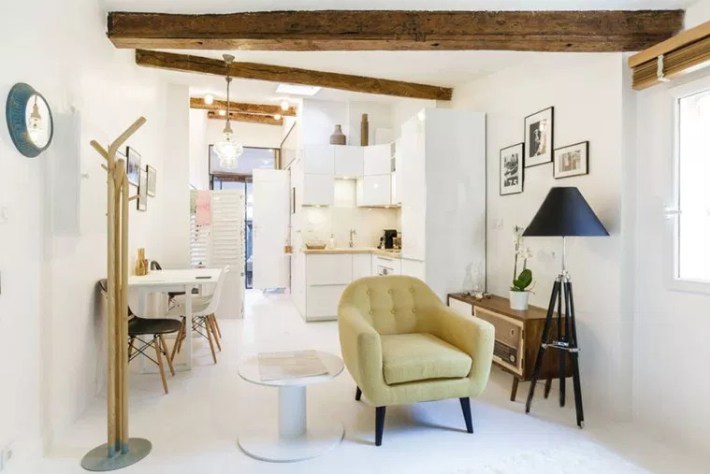 Az Atelier Pelpell céghez tartozó Céline Pelcé és Géraud Pellottiero tervezték ezt a kis, Párizs közepén található otthont. A lakást egy párnak tervezték akik rövid időt töltenek a fővárosban, ezért a régi épület hangulatát megőrizve a dekorációt is semlegesre hangolták, hogy minél könnyebben befogadható legyen. Az építész páros a kis terek bájára támaszkodott, ezért a nappali gerendájának megőrzése mellett a kortárs designt ötvözték némi párizsi hangulattal. A fehér és natúr színek mellett a világításnál hangsúlyosan megjelenő üveg teremti meg ennek a kis lakásnak a különleges atmoszféráját.