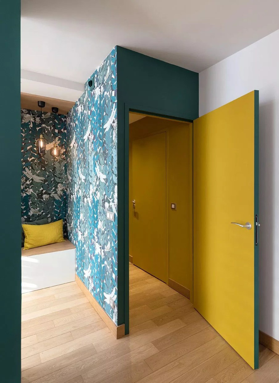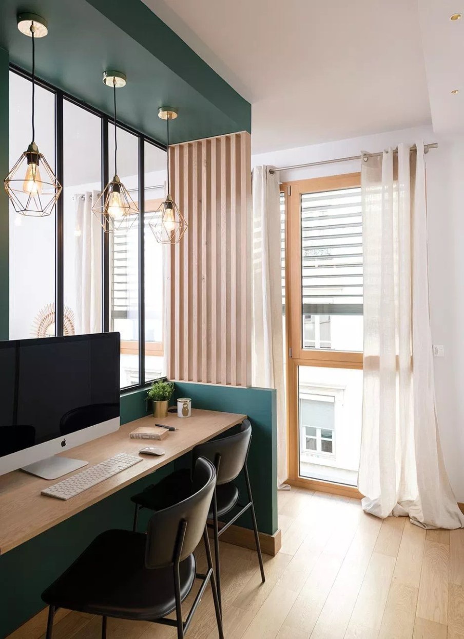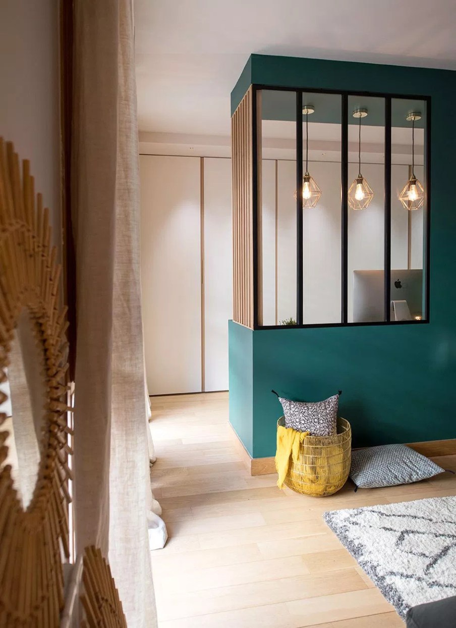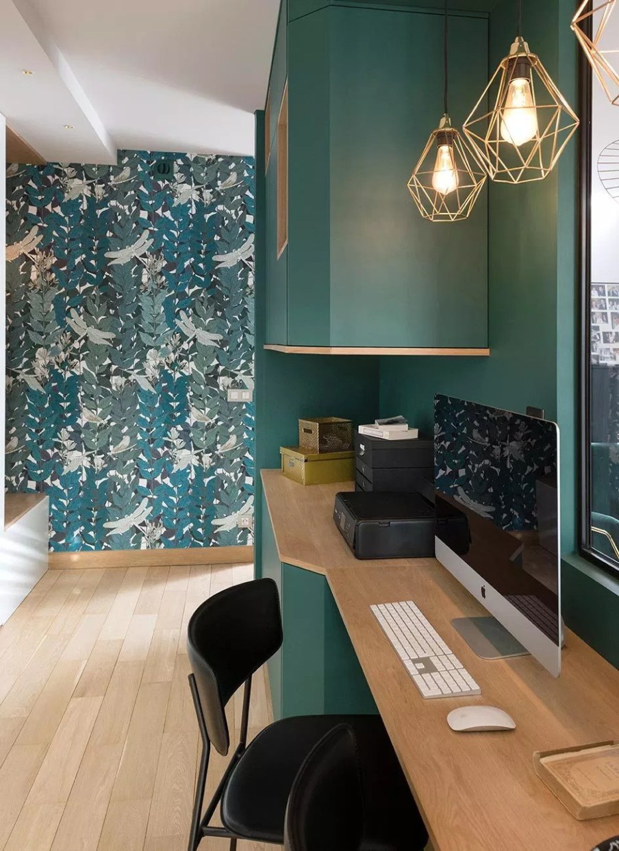 Marion Lanoë tervezte szalon praktikusan elrendezett, hangulatos kis hely. A tulajdonos számára átalakítottak egy nappalit ahhoz, hogy fogadni tudni a klienseit. Szüksége volt egy iroda részre, ahol nap közben dolgozhat és egy kanapéra, ahol az ügyfeleivel tárgyalhat. Így alakította ki Marion a teret, izgalmas, merész tapétával, kellemesen erős színekkel, bordázott térelválasztókkal. A tér teljesen körbejárható, kényelmes, napsütötte. Az esti órákban a világítás pedig hangulatossá válik az állólámpa és a függesztékek összhatásától.