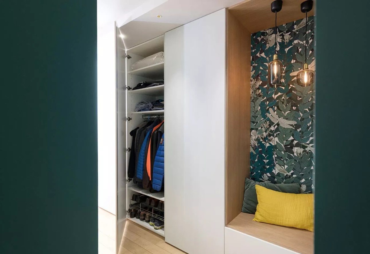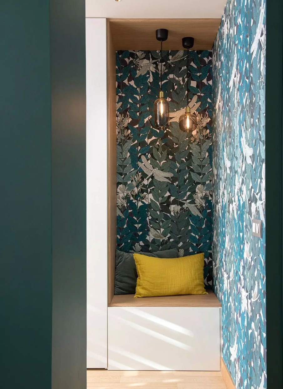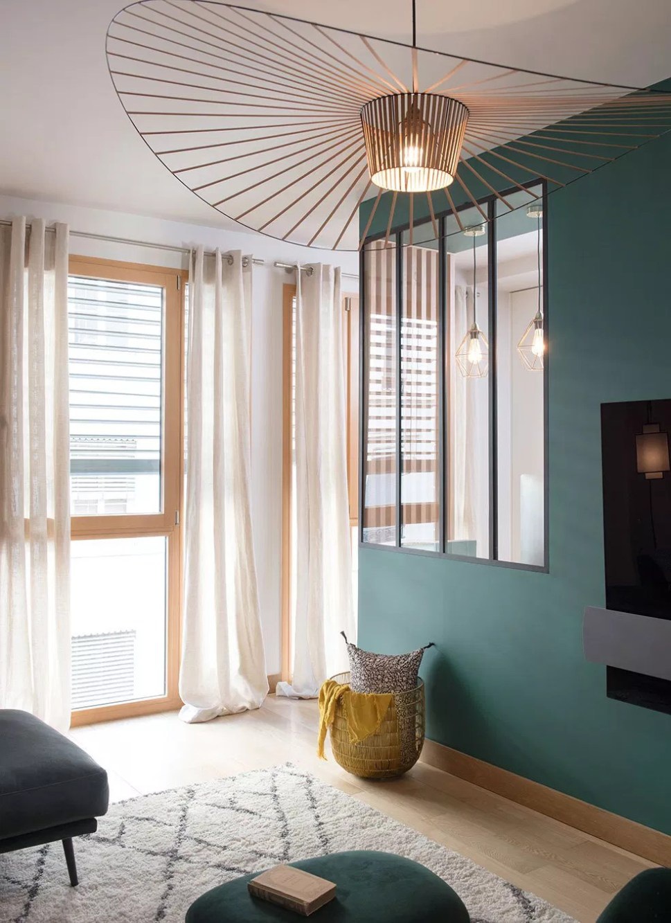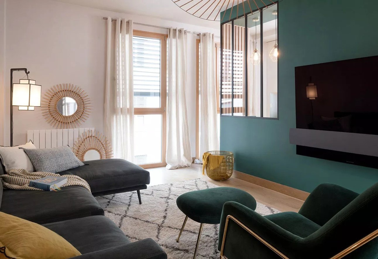 Marion Lanoë tervezte szalon praktikusan elrendezett, hangulatos kis hely. A tulajdonos számára átalakítottak egy nappalit ahhoz, hogy fogadni tudni a klienseit. Szüksége volt egy iroda részre, ahol nap közben dolgozhat és egy kanapéra, ahol az ügyfeleivel tárgyalhat. Így alakította ki Marion a teret, izgalmas, merész tapétával, kellemesen erős színekkel, bordázott térelválasztókkal. A tér teljesen körbejárható, kényelmes, napsütötte. Az esti órákban a világítás pedig hangulatossá válik az állólámpa és a függesztékek összhatásától.