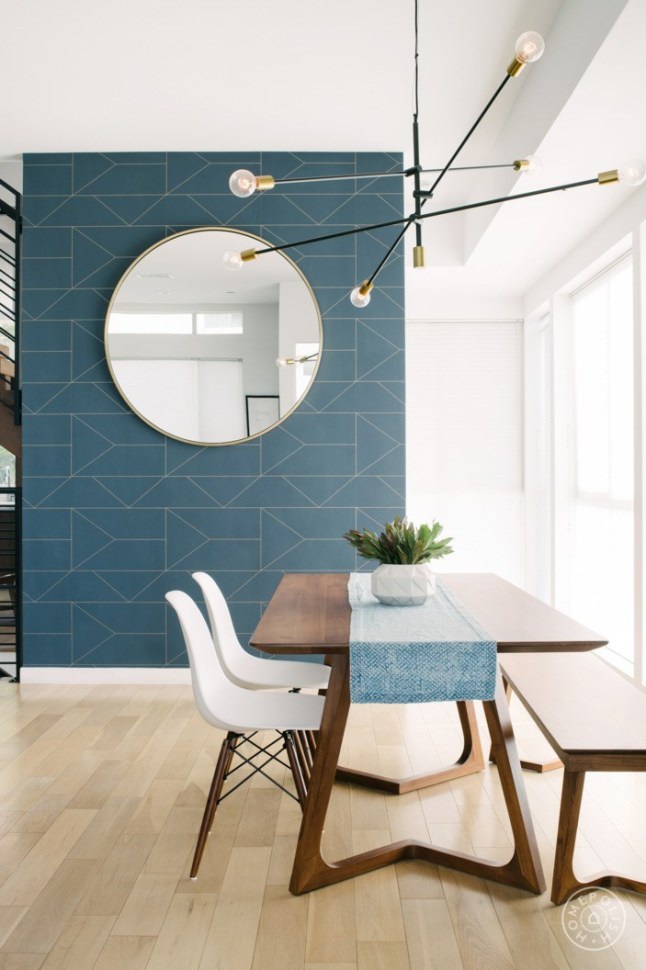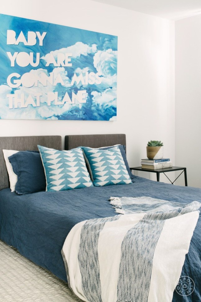 A hálószoba dél felé kalandozik, és alapvetően mindenhol a föld színek a jellemzőek, amit kiegészít a tengerészkék komolysága. A hatás kontrasztos, elegáns, régmúlt idéző. Ugyanakkor a fali képek témája könnyed és inspiráló.