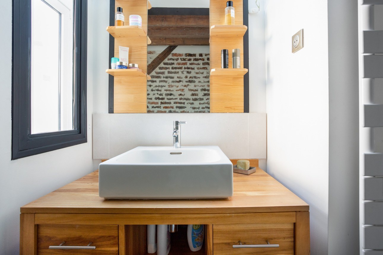 Többször olvasom, hogy kevés a könyv a mai lakásokban (nem olvasnak?), itt rengeteget látunk, teljes falon könyvekkel, polcokkal. A konyha burkolatait is érdemes böngészni: a padlón a színes mozaik minták, a konyha hátfalon a téglaburkolat. A függesztett és álló lámpák, az egyszerű, dísztelen fürdőszoba is kiváló ötlet. Az egész lakás üde, hangulatos és a nagy ablakoknak köszönhetően szinte fényben úszik.