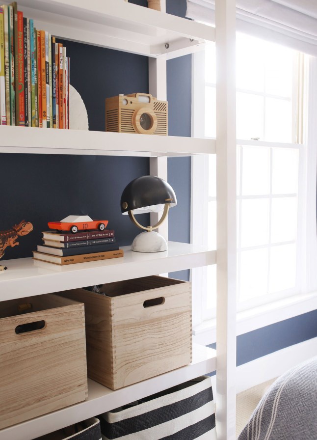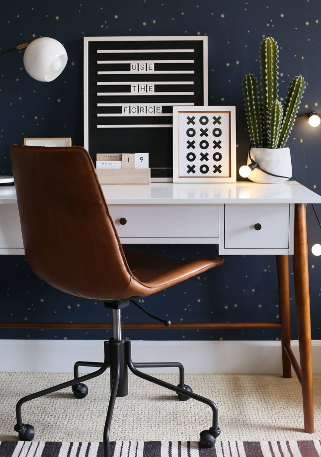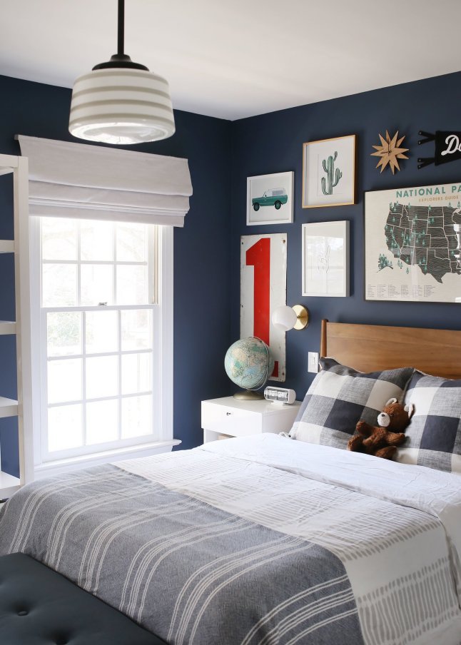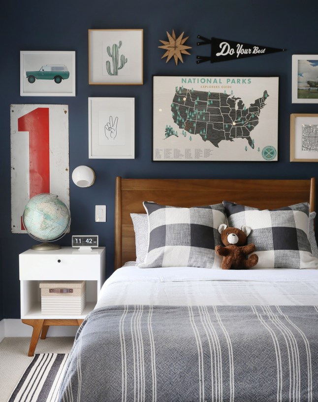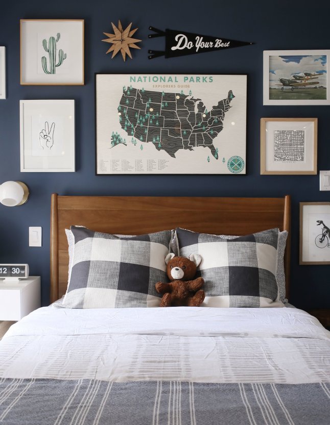 A sötétkék, csillagmintás tapéta, a lelógó bolygókkal és a nemzeti parkokat bemutató térkép jól tükrözi ezt, a kék-fehér variálása pedig üdévé varázsolja a szobát. Ezzel az új mélykék díszítéssel, mely csillagokból és bolygókból készült, egy "klasszikusan hűvös" hangulatot választott, amely tökéletesen megfelel a növekvő gyermeknek.
