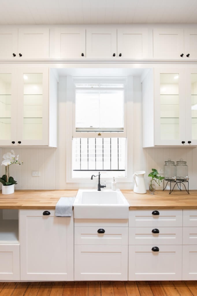 A hely nagyon magas mennyezettel rendelkezett, ezt a magasságot egy felső szekrénysorral akarták kihasználni. Azonban az ablak melletti két faliszekrény egy kicsit túl magas lenne, sok üres hely maradna, ami megtöri az egységes látványt.
