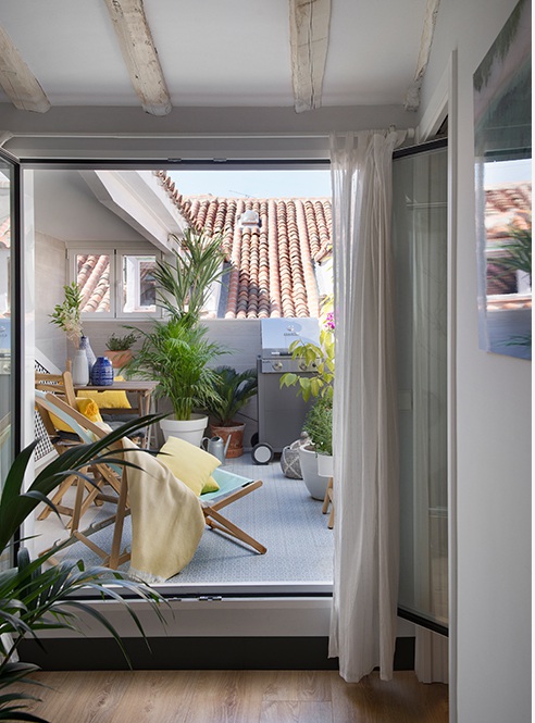 A híres katalán formatervező stúdió modernizálta ezt az 58 négyzetméteres picike teraszos apartmant Barcelonaban, követhető akár fiatal pároknak, a városi élet szerelmeseinek, meleg és színes kortárs dekoráció.