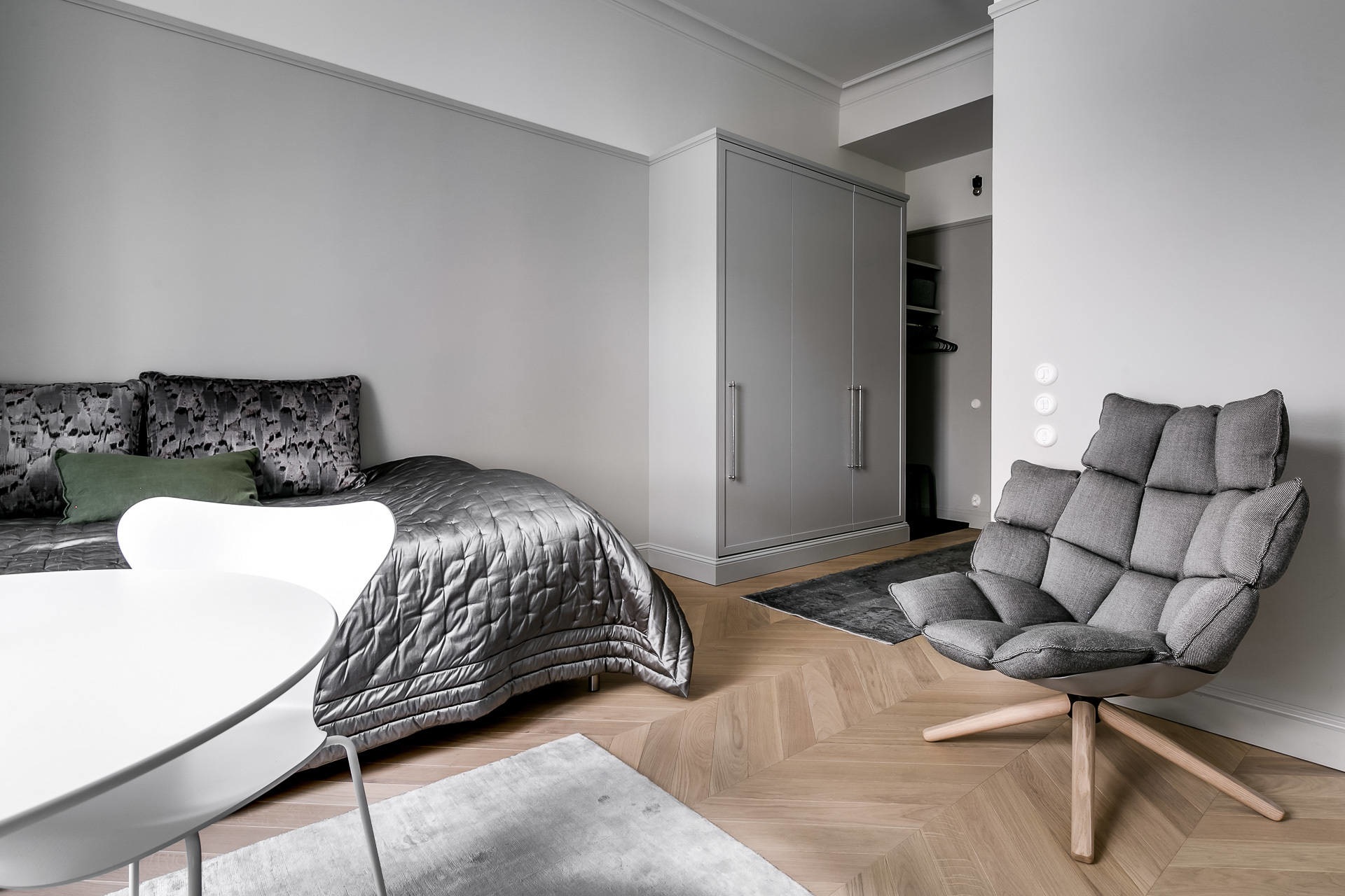 Ebben a 28 m²-s svéd kislakásban a konyha szerepe több, mint amit az ekkora terekben megszokhattunk. Itt egy teljes értékű, a tér és a funkció szempontjából meghatározó konyhát láthatunk, mely eltér a kis terek minimális helykihasználású teakonyháitól. A szürke szín végigfut a lakáson, így egységesíti a teret és ad a konyha szekrényeknek és a gardróbnak is beépített, falba simuló jelleget. A kis fürdőszobában az üveg ajtók használatával a mosógép és a szárítógép helyét nem falként választották le a térből, ezzel megoldva a hozzáférést a gépekhez. A nagyobb üveg- és tükörfelületek használata jól ellensúlyozza a szürke burkolat sötét hatását.