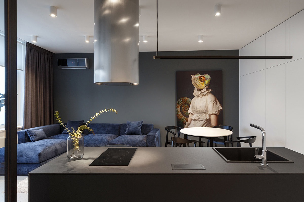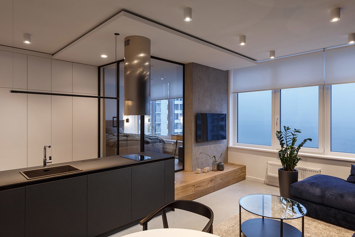 Előnyös: A konyha minimál stílusban készült, ami esetünkben azt is jelenti, hogy nincs rendetlenség, minden eszköz a helyére kerül, zárt szekrényekben.