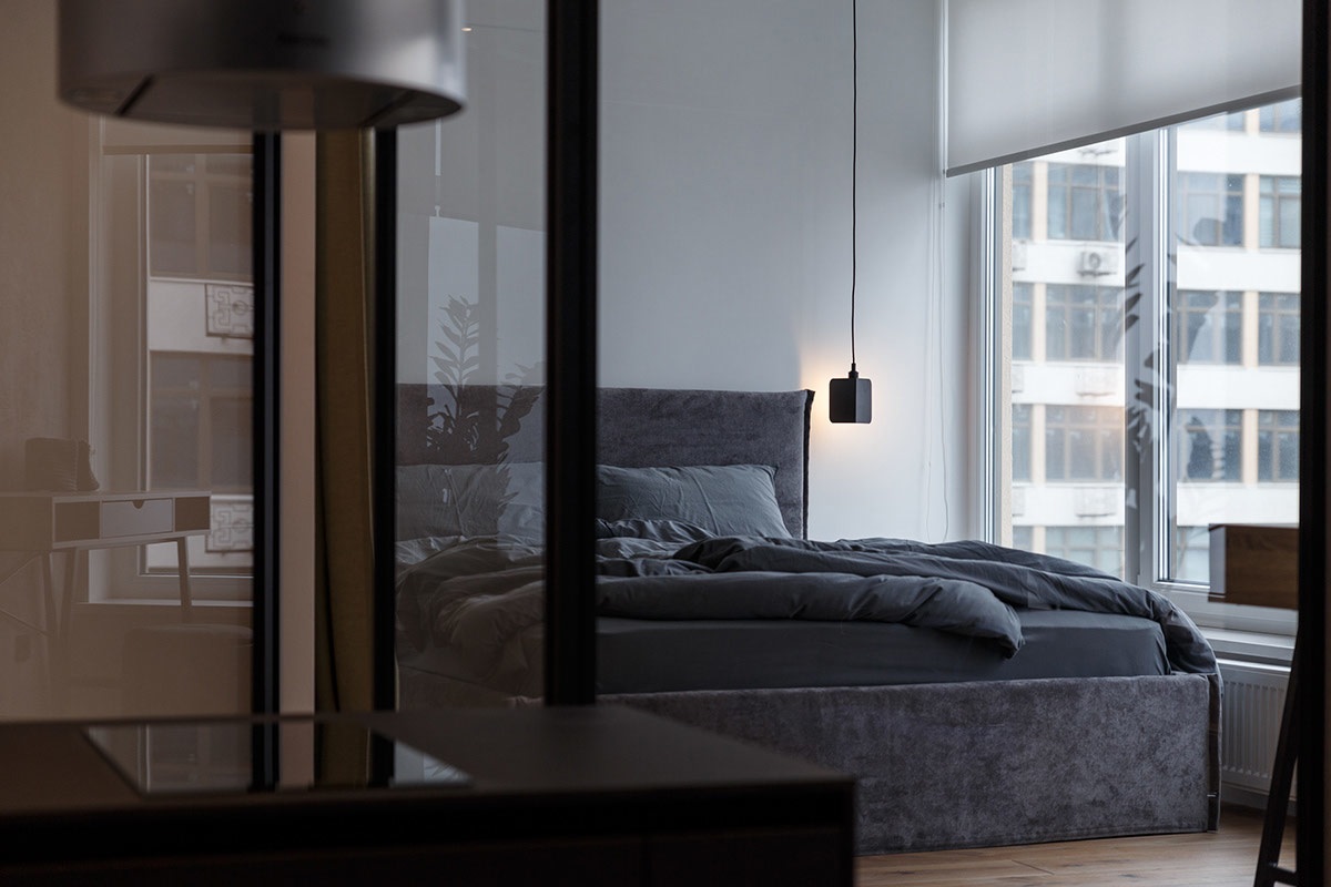Az ágy egy magasított padon van, térelválasztóval elkülönitve a nappalitól - kiváló tértervezésre vall.