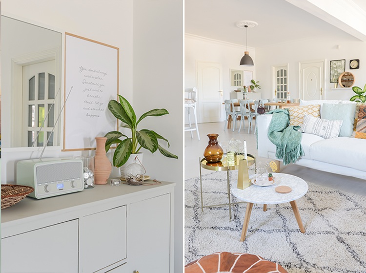 Egy alapvetően fehér színben pompázó lakást tettek a tervezők színessé a képeken. Ahol fehér a kanapé, a falak, a szőnyeg, ott apró színes kiegészítőkkel tudjuk átvarázsolni a nappalit, barátságosabb lesz minden. Zöld növényekkel, arany lámpával, vázákkal, takarókkal, párnákkal tehetjük érdekesbbé a lakást. Ráadásul ezeket cserélgethetjük kedvünkre!