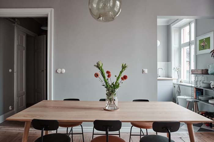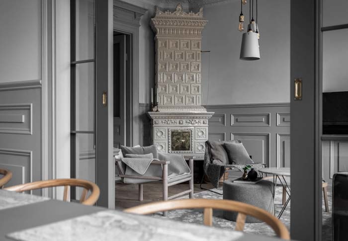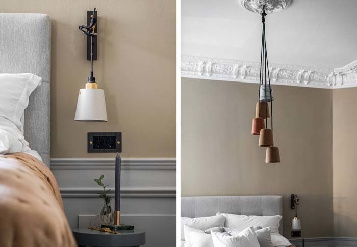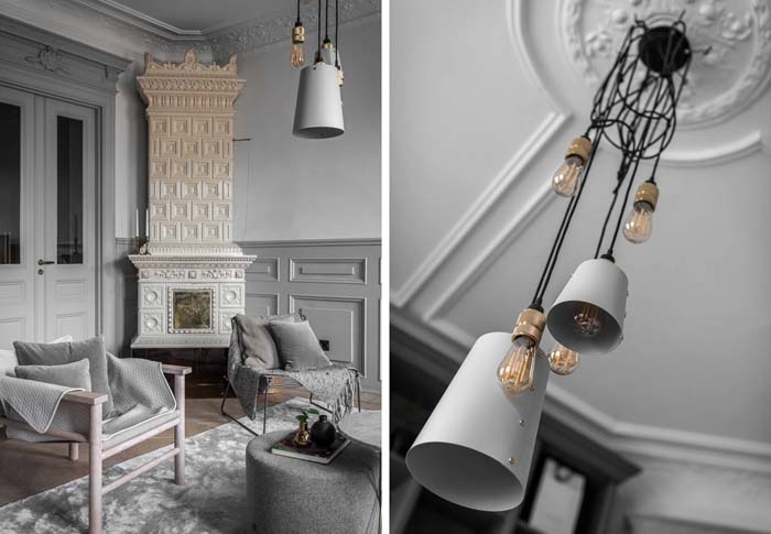Az eklektika igazán különleges egyensúlya jelenik meg mindenütt, a modern bútorokat klasszikus díszlécek veszik körül. De láthatjuk nagymamáink szekrényét beépítve a Bauhaus ihlette, újraértelmezett lámpák mellett.