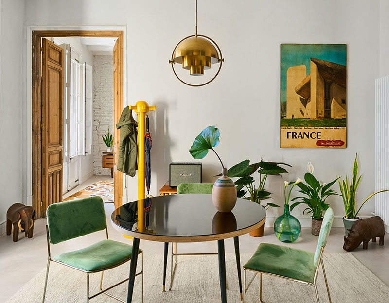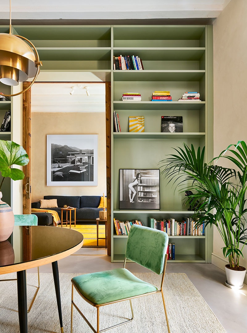 Két dolog tetszett meg azonnal ebben a barcelonai lakásban, amikor a képsorozatot megláttam. A mostanában nagyon divatos téglafal a nappaliban, amitől azonnal otthonossá válik a lakás. Aztán persze a zöld könyvespolcokat se hagyjam ki! Végül a csodálatos fürdőszoba: ajánlom a mosdó és a fali burkolat részleteit, de a legfőbb nyerő: a szabadon álló fürdőkád!