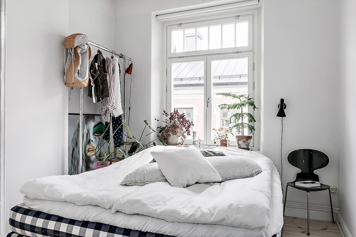 Ez az egy hálószobás apartman kevesebb, mint 60 m², mégis sokkal nagyobbnak tűnik. A fehér falak, a 20. század elején épült épület magas mennyezete, a magas ablakon keresztül beáramló fény mind hozzájárul a tér vizuális növeléséhez. A dekoráció könnyű, egyszerű bútorokból készült, és mindenekelőtt sok zöld növény, amelyek örömteli frissességet hoznak a városi környezetbe.