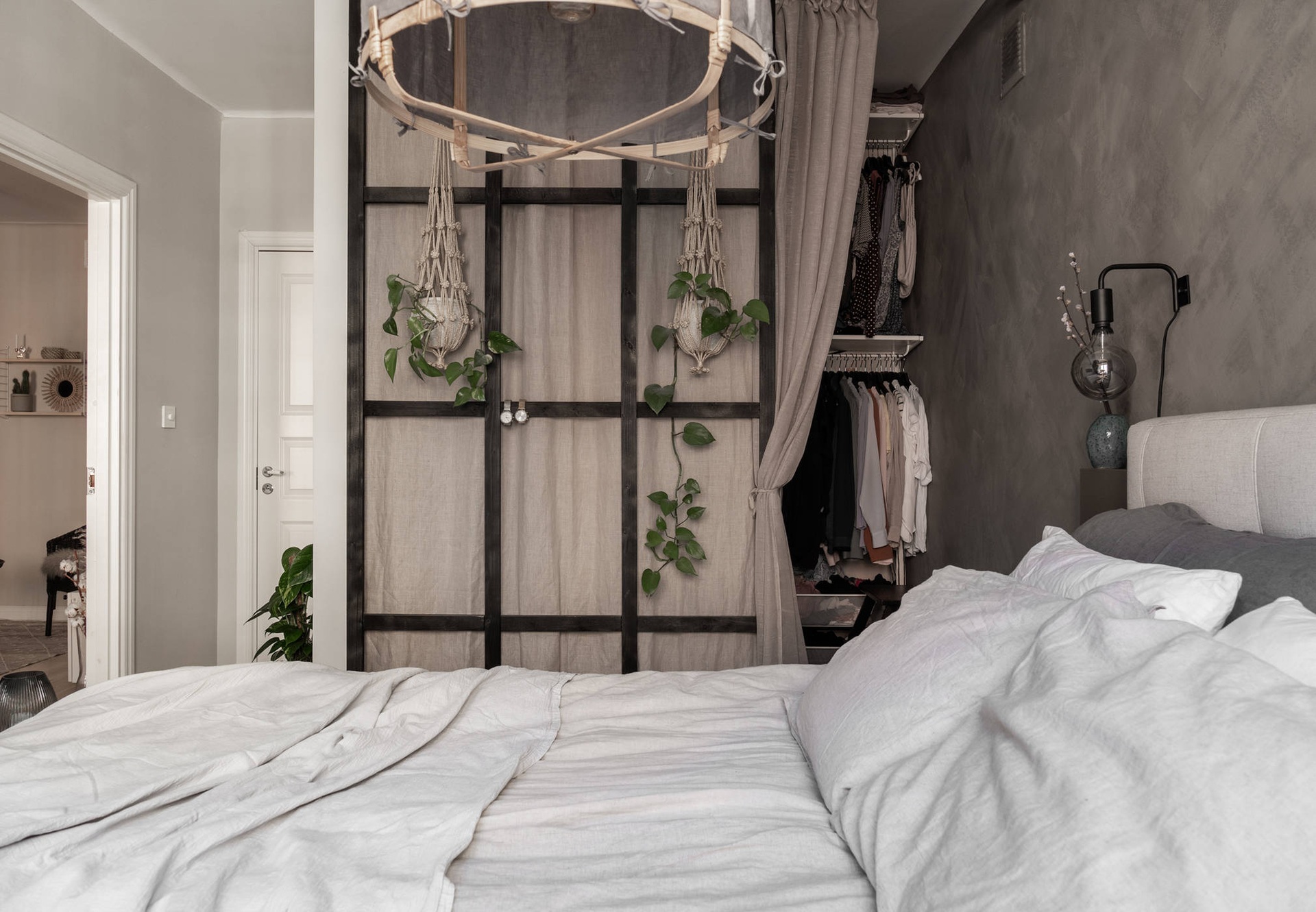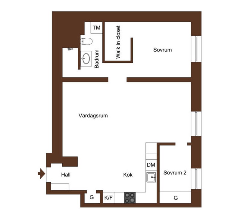 Ez a két hálószobás apartman Svédországban ügyesen ötvözi a hagyományos fekete konyhabútor és a fa harmóniáját, modern kortárs kialakítással. Praktikus elrendezés: a hálószoba és a fürdőszoba között található a gardrob. A kanapé lekerekített formákkal enyhíti a sötét szín hatását és a választott színek ellenére is világos, napfényes marad a nagy ablakoknak köszönhetően. Tökéletes hely az étkező számára a nagy ablak előtti beugró.