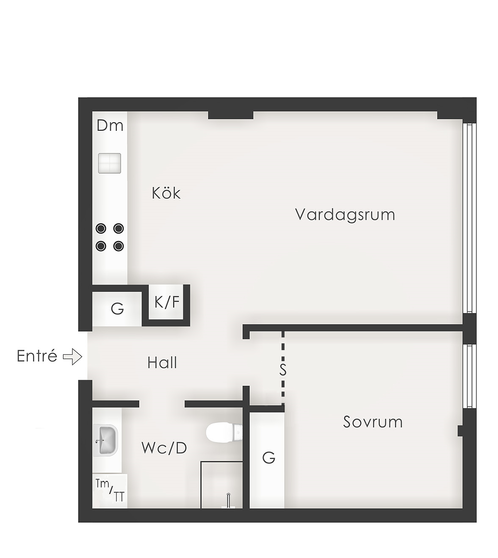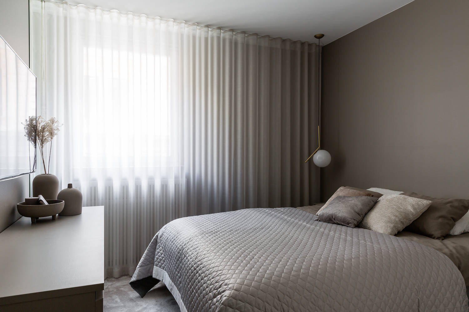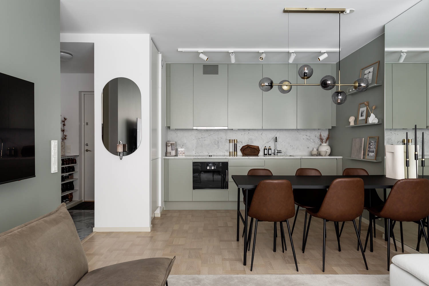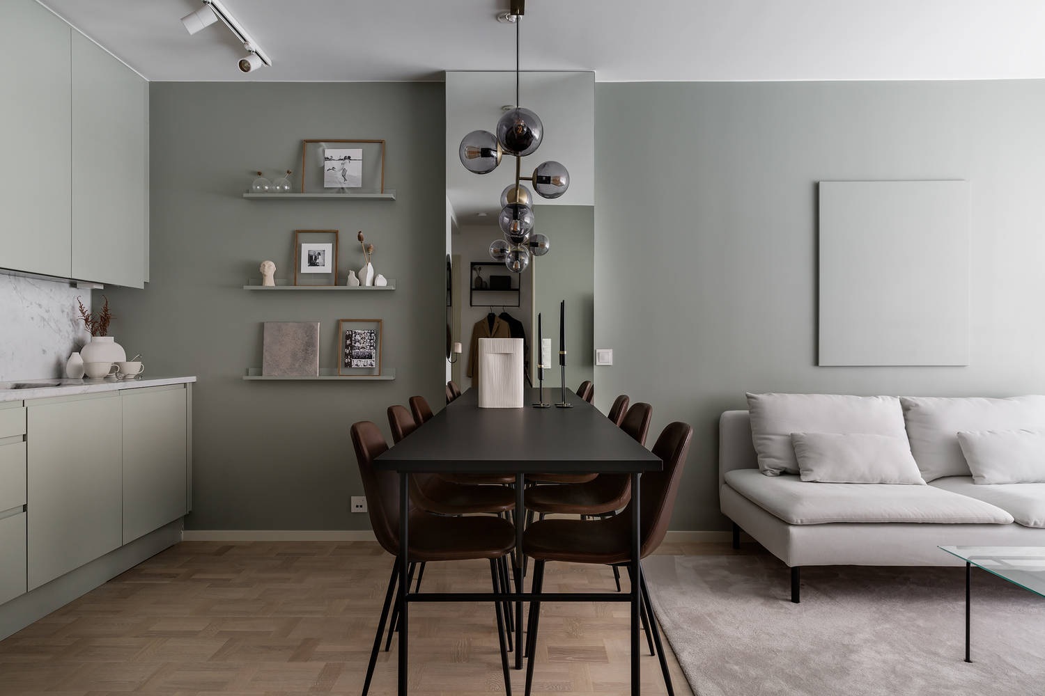 Ebben a 43 m²-es, egyszobás lakásban a bútorozás ugyan egyszerű, ám gondosan válogatott darabokból áll, hogy illeszkedjen a hely szelleméhez. A kis alapterület miatt a légiességre és a minimalizmusra törekedett a tulajdonos. A falak színe finom zöldes szürke, ami jól illeszkedik a bútorok elegáns vonalaihoz. Az ingatlan szerencsés alaprajza lehetővé tette, hogy a nappali, a konyha és az étkező egy nagy térbe kerülhessen, így a hálószoba külön helyiségben kapott helyet.