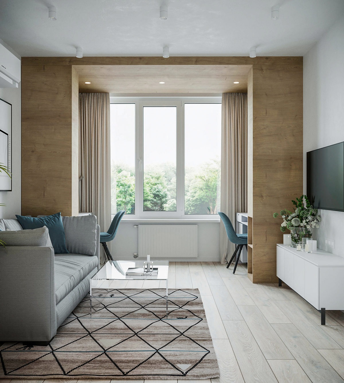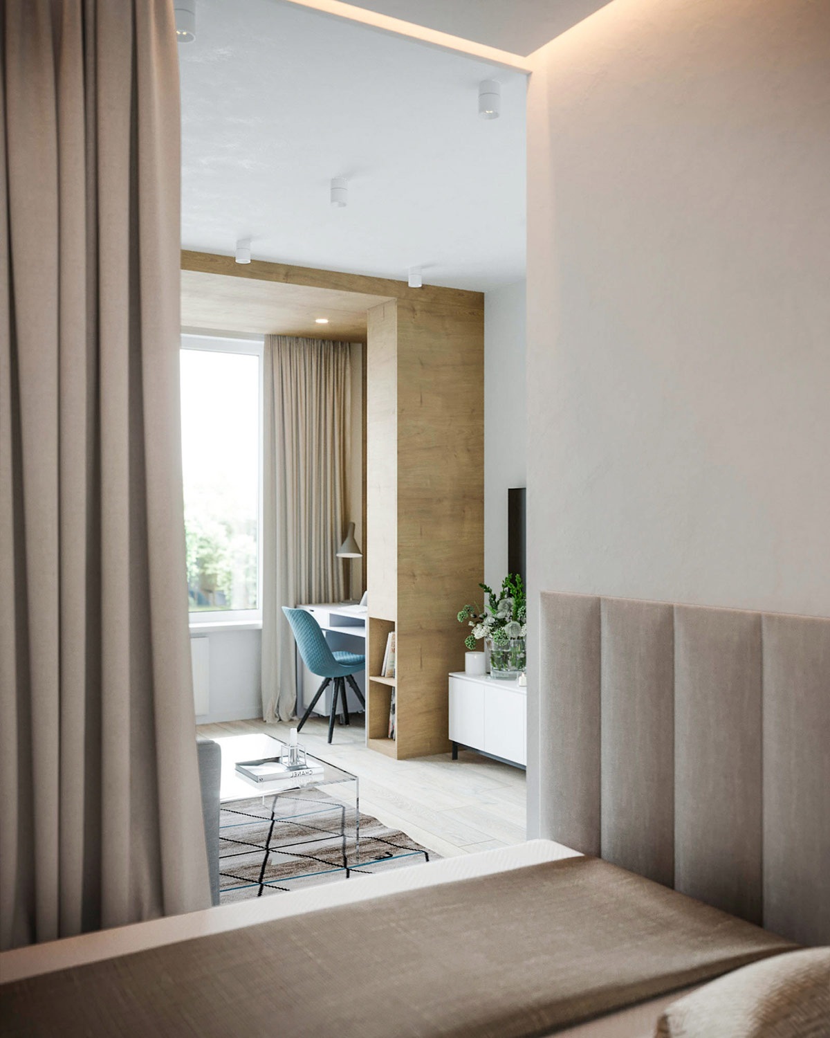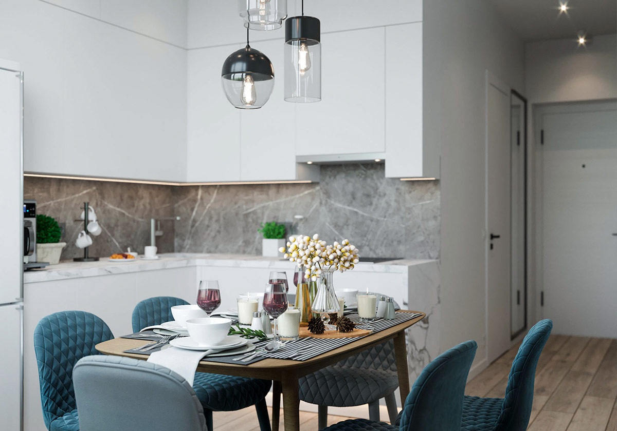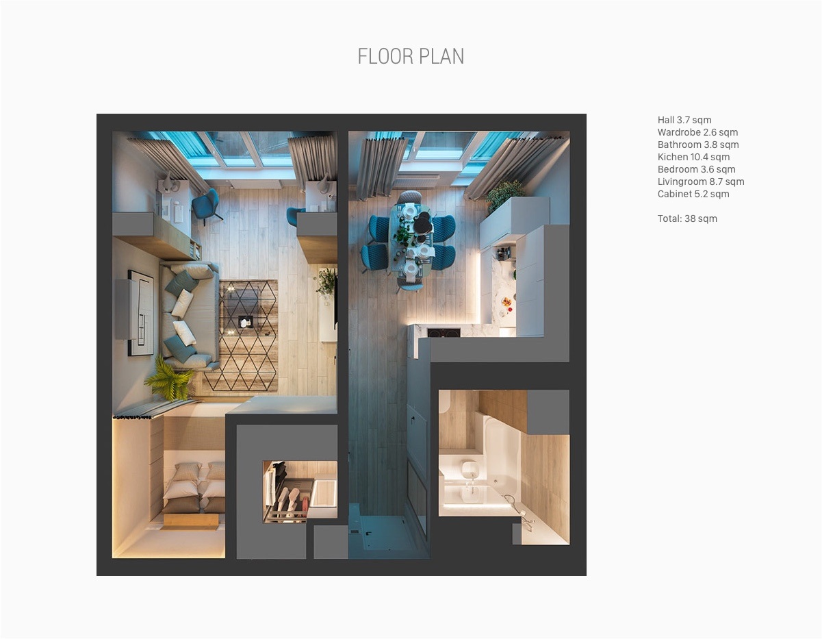 A harmadik lakás is Ukrajnában, Kijevben található. Mindössze 38 négyzetméteres, vidám kék színeket alkalmaz, ezzel tágítja a teret, egyben megtöri az egyhangú szürke, fehér és fa tónust.