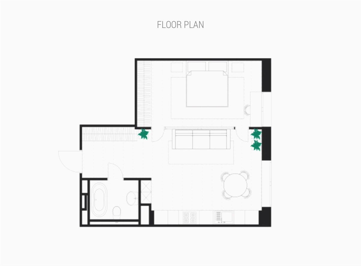 Az ukrajnai Kijevben található „Dohányzó galamb” lakás a benne található falfestményről kapta nevét. Világos és nyitott kialakítású, köszönhetően a nagy ablakoknak és a fényt megosztó üvegfalú hálószobának. A nyugodt, modern falfestmény meleg bézs és zöld tónusokat hoz a szobába, amelyek kiegészítik a fa padlót és a meleg barna bőr kanapét.