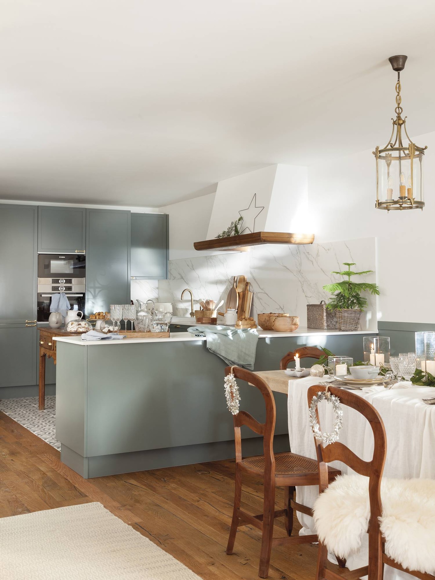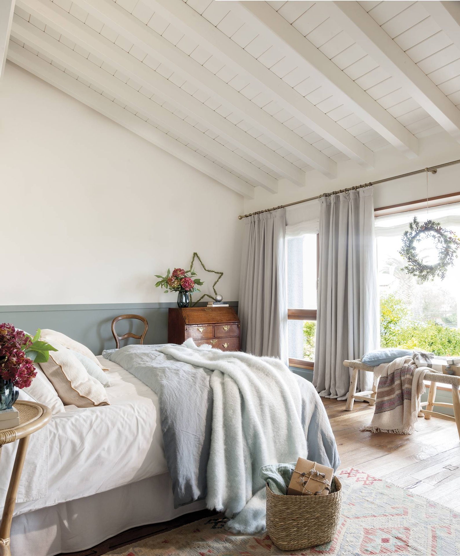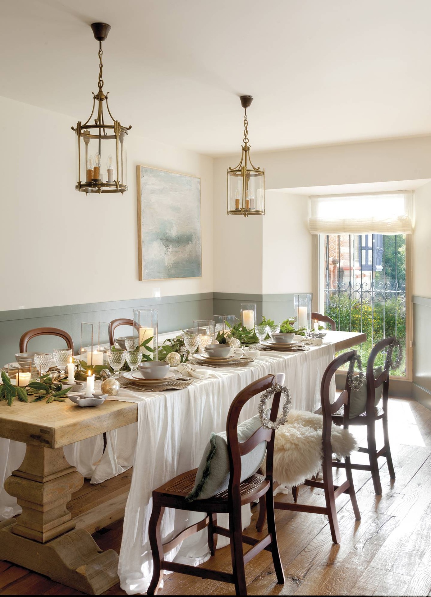Ebben a 17. századi spanyolországi házban a karácsonyi dekoráció a belső terek színeihez illeszkedik. A kék és a zöld kiemelkedő jelentőséggel bír. A ház egyik oldalról a városra, a másikról a tengerre néz, amit a hatalmas kiugró ablakkal ellátott nappali reprezentál. Még a fa mennyezetben is váltakozik a fehér és a zsályazöld. Az enteriőr kialakításával megbízott stylist által megálmodott karácsonyi dekoráció teljes mértékben tiszteletben tartja ennek a háznak a múltbéli szellemiségét, keverve a hagyományt, a természetet és a kézművességet. Az ünnepi asztal dekorációja ennek a keveréknek az összefoglalása, régi fa bútorok, babérágak használata az asztalon, mécsesek.