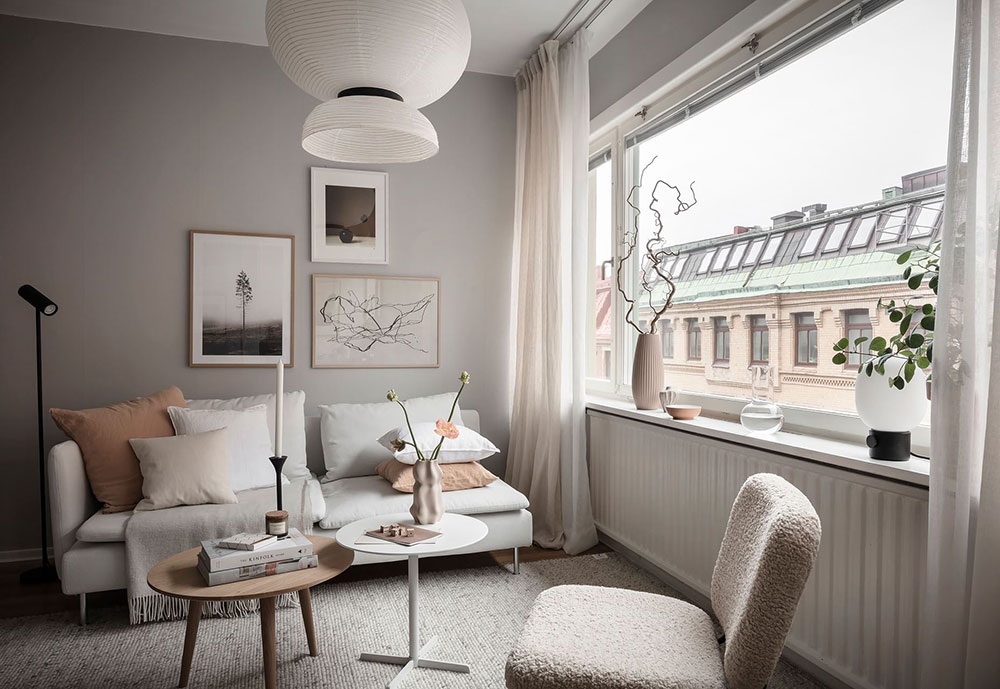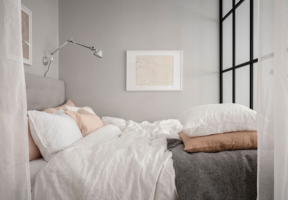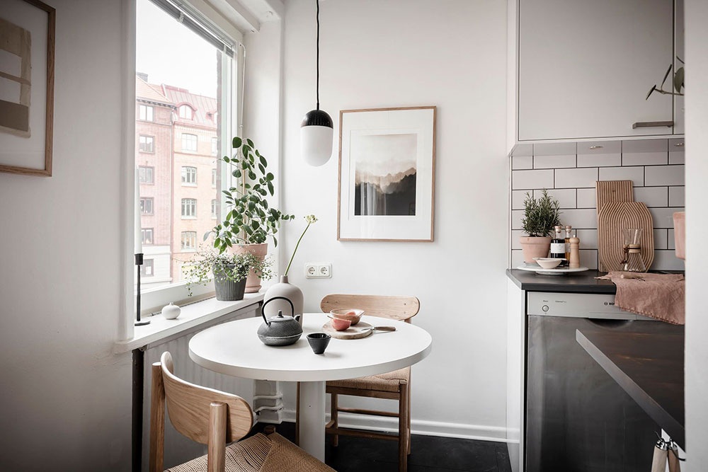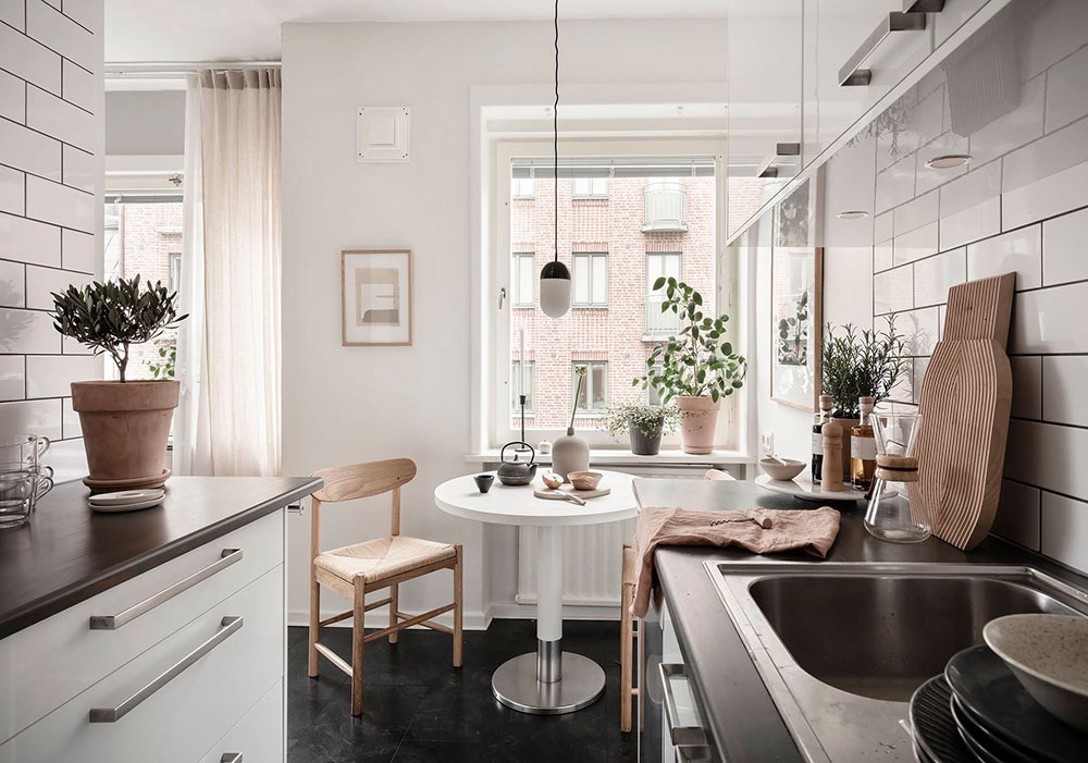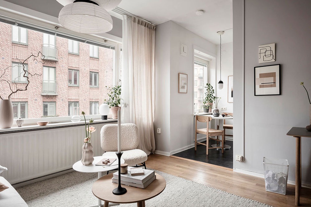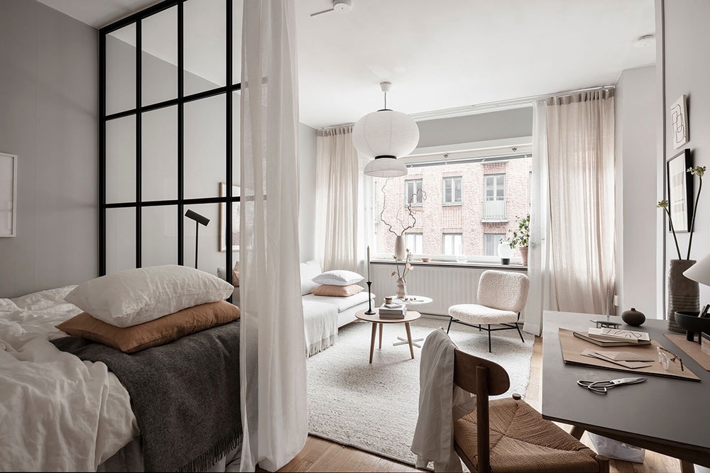 Ez a 38 négyzetméteres stúdiólakás divatos Japandi stílusú berendezéssel rendelkezik, ami a skandináv és a japán szellemiség keveréke. A fiatal pároknak és egyedülállóknak is ideális kis lakás tele van szép részletekkel, finoman teremti meg a terek közti egyensúlyt mindenféle hivalkodó szín vagy a túlzsúfoltság érzete nélkül. A fehér, a bézs és a terrakotta lágy árnyalatai uralják a hangulatot, amiket képekkel és például olyan elemekkel tettek dinamikusabbá, mint a hálóegységet és a nappalit elválasztó acél üvegfal fekete színe. A jól megválasztott stílus és az optimálisan kialakított elrendezés nagyszerű leckét ad arról, hogy mennyi mindent lehet kihozni egy kis alapterületű lakásból.
