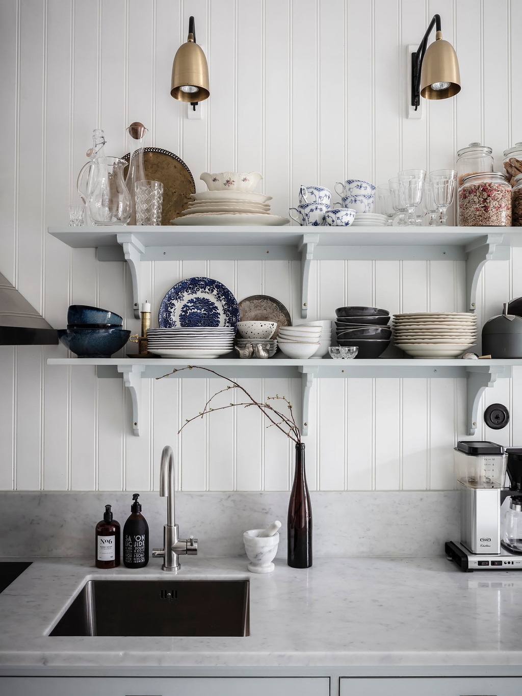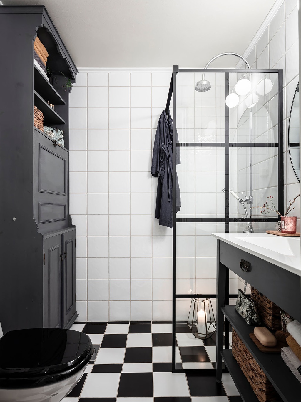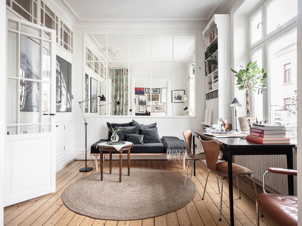 Ez a 1907-ben épült svéd lakás magán hordozza a régi terek utánozhatatlan báját. Nem modern, optimalizált alaprajz várja a látogatót, hanem egy hangulatos, karakteres otthon, ahol minden szobának saját története van. A rusztikus szürke konyha fekete-fehér kockás padlója – gondosan festett parketta – igazi mestermunka. A dolgozószoba egy második nappaliba nyílik, melyet régi üvegfal választ el. A terek egy világos, hosszú folyosóról nyílnak, és megőrizték az eredeti részletek szépségét: stukkókat, rozettákat, régi kandallót és parkettát. A berendezés a kortárs, vintage és vidéki hangulat kiegyensúlyozott keveréke, amely elegáns, mégis otthonos.