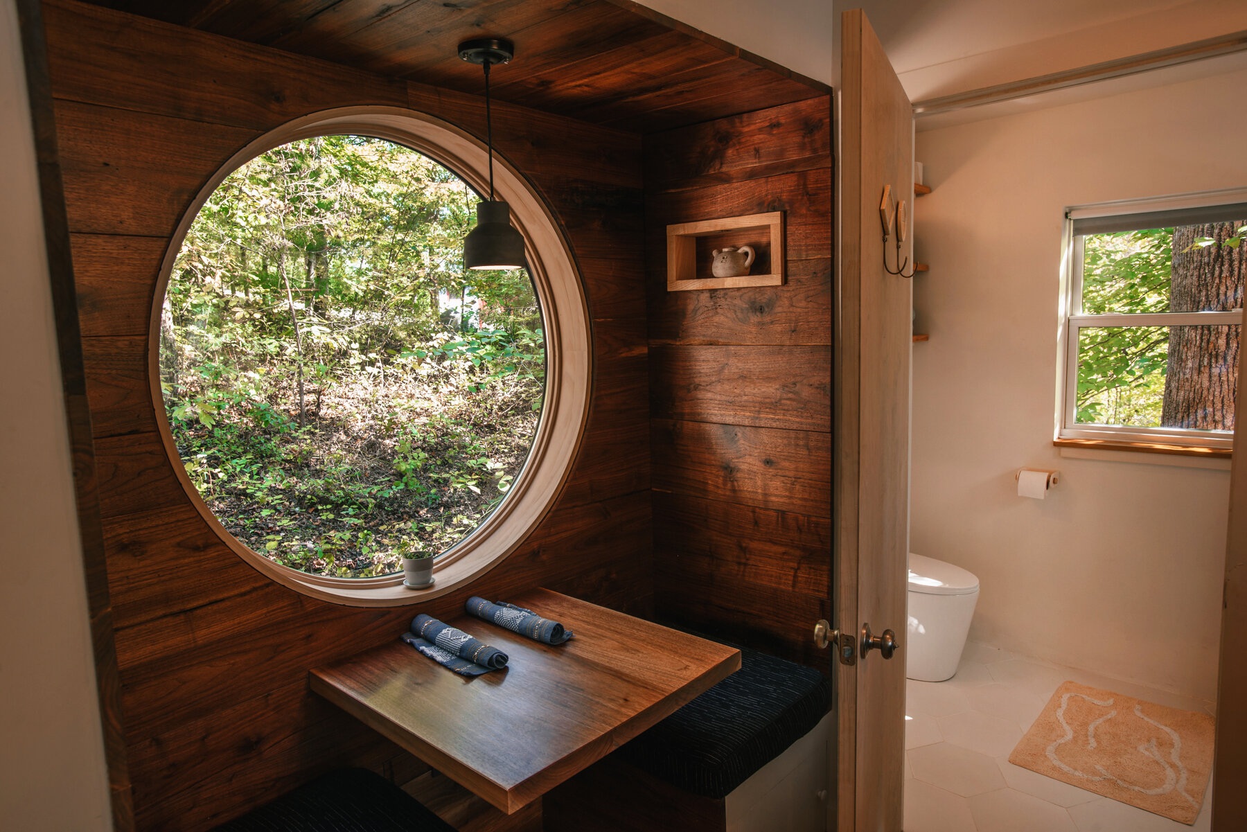 A két emeletes, 37 négyzetméteres kabin tervezőit Japán inspirálta. A fából készült mini kabin Észak-Karolina erdős területén található, amelyet bárki kibérelhet az Airbnb-n keresztül. A belső kialakítását szinte minimalista egyszerűség jellemzi, mégis kényelmi szempontból teljesen hiánytalan. Minden funkció megtalálható benne, amire szükség lehet egy pár napos nyaralás alatt (még gyerekekkel is). Néhány szokatlan, ám annál aranyosabb részlettel is kedveskedtek a vendégeknek, ilyen például a nappaliban található hinta, ahol jól esik elmélyülni a gondolatainkban, miközben a hatalmas ablakon át szemléljük a természetet. A kültéri fürdő pedig minden évszakban ideális a feltöltődéshez.