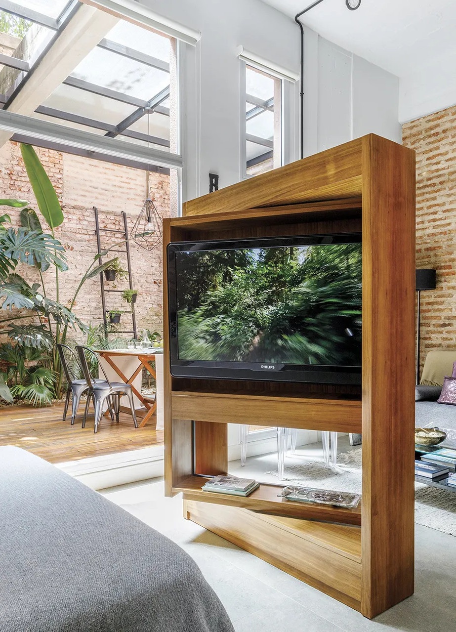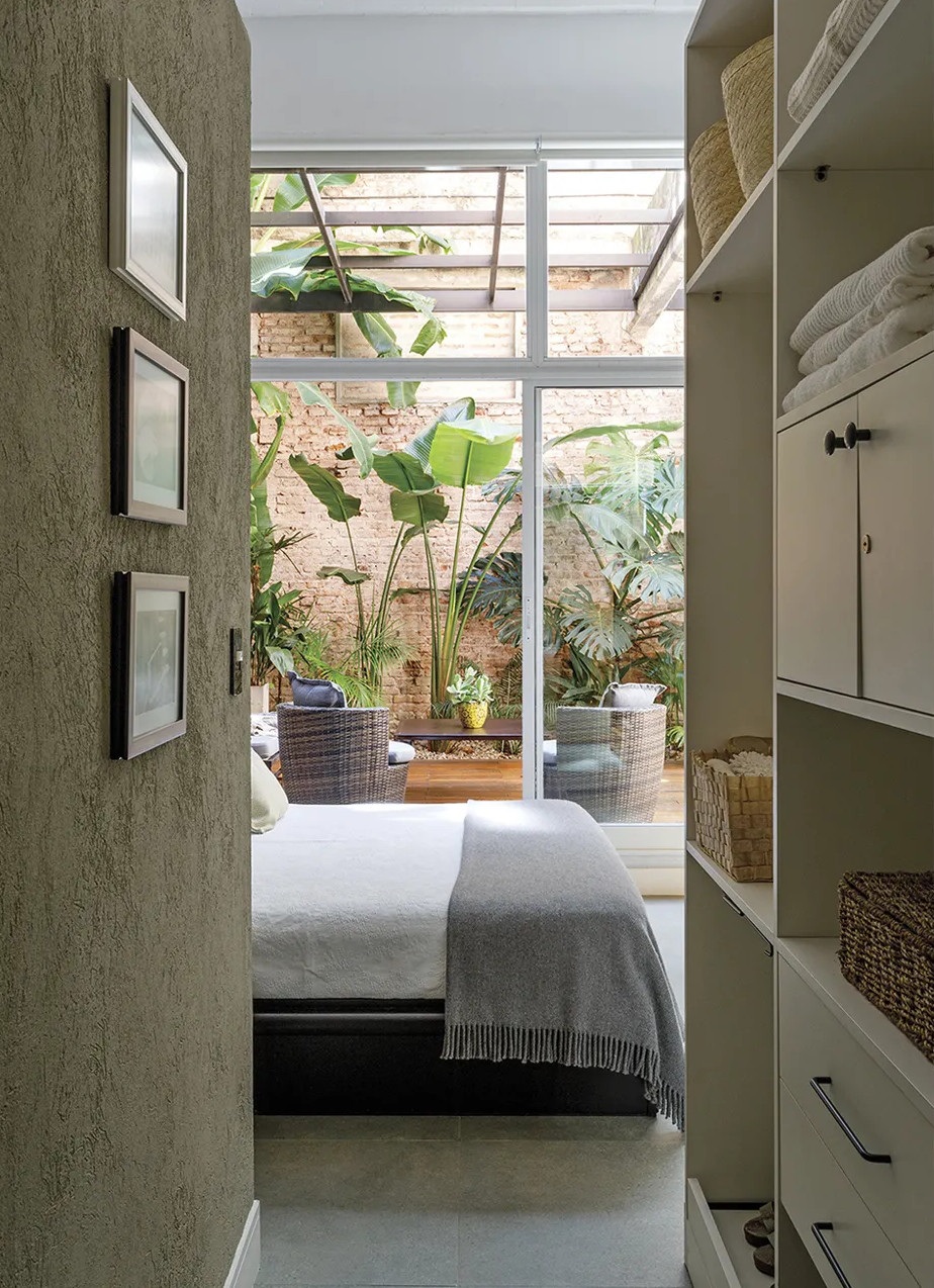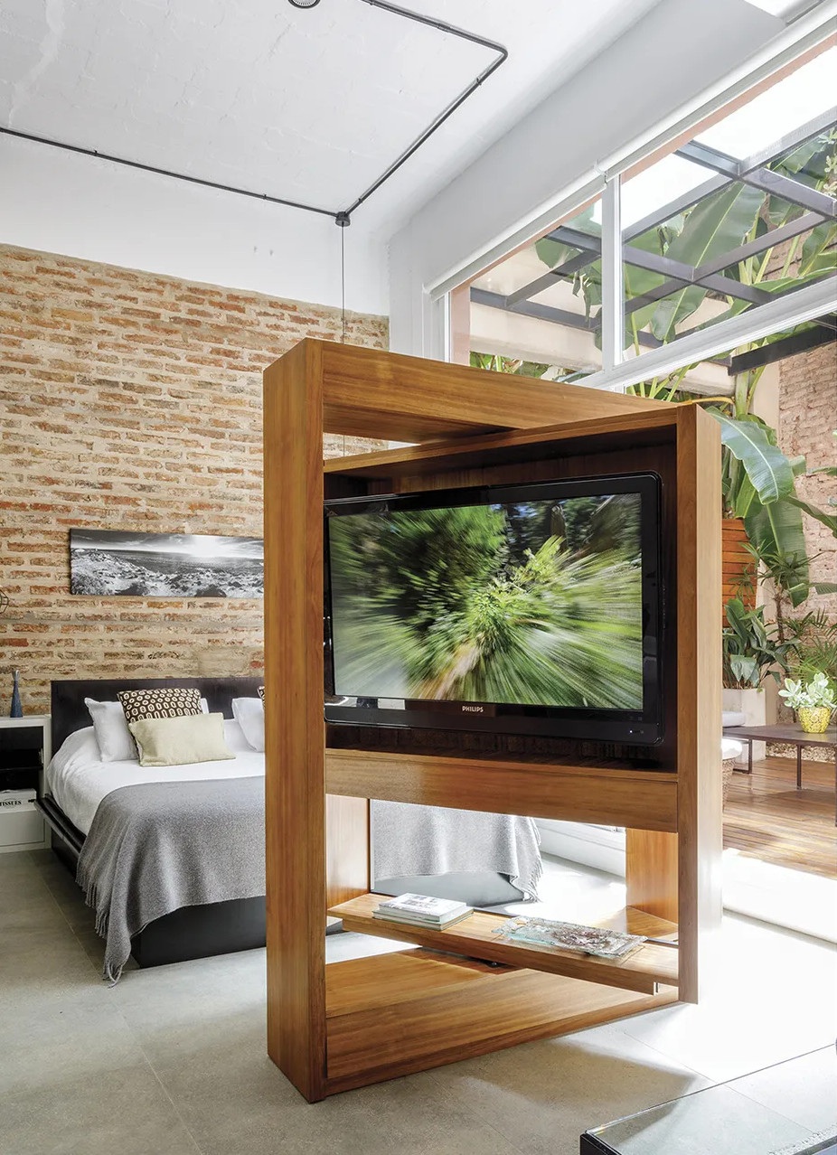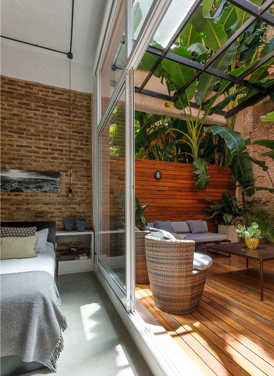Ennek a 65 négyzetméteres lakásnak a legfontosabb eleme kétségtelenül az intimitást nyújtó 25 négyzetméteres belső udvara, amiből már semmi sem emlékeztet az egykori elhagyatott kertre. Az argentin lakás egy régebben gyárként üzemelő épületben található, emiatt a loft stílus jegyeire hangolták a belső tereket. A felújítás során megőrizték a téglafalakat és a nagy nyitott tereket. A kis loft lakás legérdekesebb eleme a méretre készített és 360 fokban elforgatható televíziós szekrény, ami elválasztóként szolgál a nappali és a hálószoba között.