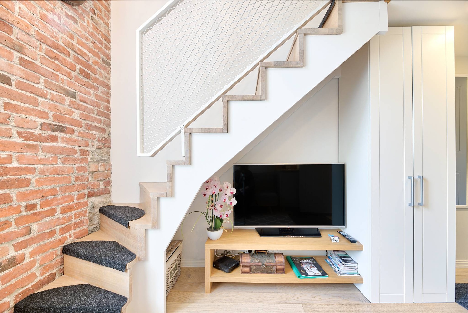 A magas belmagasság előnyeit érdemes kihasználni egy apróbb méretű stúdiólakás berendezéséhez. Ha két szintre osztjuk a rendelkezésre álló területet máris rengeteg új lehetőséggel gazdagíthatjuk a térkihasználást. A felső szinten kialakíthatunk egy hálóteret vagy akár egy dolgozósarkot, a lépcsőket pedig elláthatjuk tárolófunkciókkal, de az alatta lévő területről se feledkezzünk meg, ahol elférhet egy méretre készített gardrób, TV-állvány vagy könyvespolc.