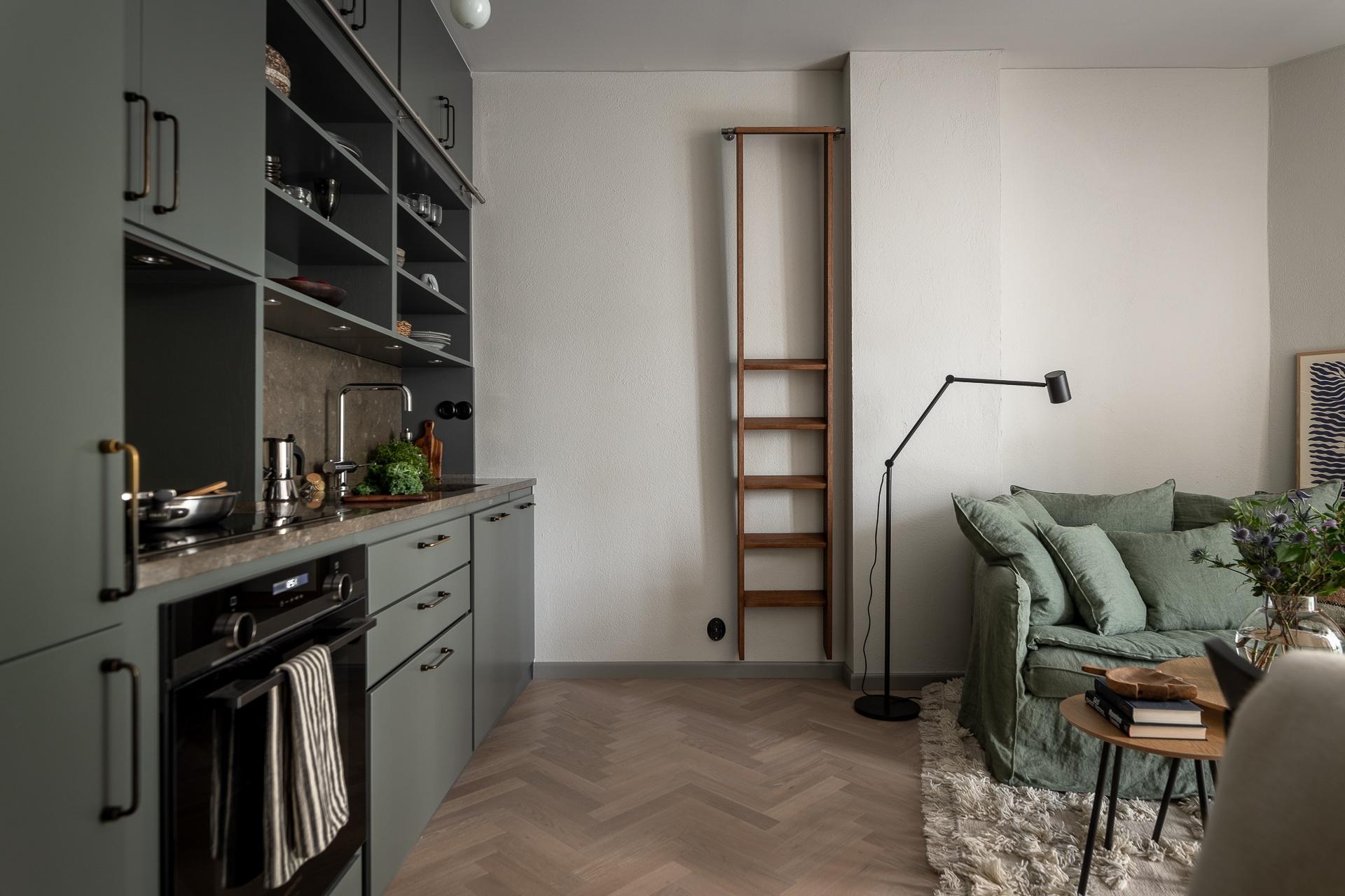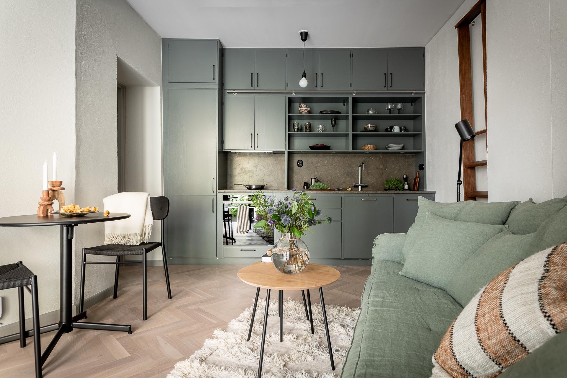 Ebben a lakásban minden négyzetmétert tökéletesen kihasználtak, amely nemcsak a 31 nm-es alapterület miatt volt elengedhetetlen, de a tulajdonosok minimalista életvitelével is összhangra talált. Az egy hálószobás lakás egy régi téglaépületben bújik meg Göteborgban, így a magas belmagasságot szép és hasznos örökségként kapták meg az új tulajdonosok. A zsályazöld dominál minden helyiségben, ami nyugalmat és a természet közelségét sugározza.
