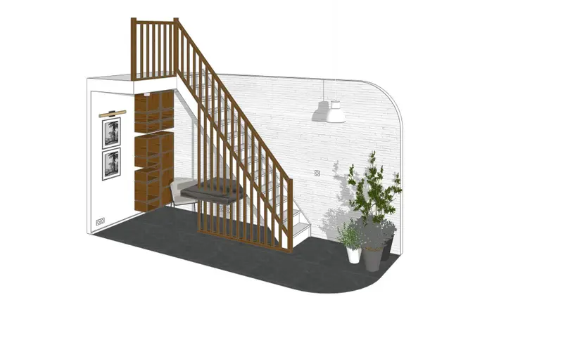 A belső lépcső alatti üres helyeket nehéz ügyesen berendezni. Választhatunk ide szekrényeket, melyek mindig hasznosak lehetnek a bejárat közelében. De van, amikor a lépcső is a nappaliból nyílik, és miért ne dönthetnénk úgy, hogy az otthoni irodát telepítjük ide? Íme, egy ötletes, rejtett dolgozósarok.