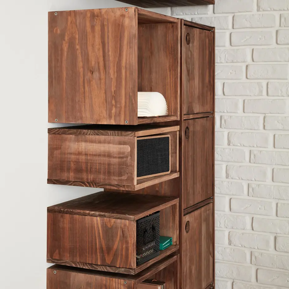 Egyedileg készült fali tároló polcokkal és szekrényekkel.