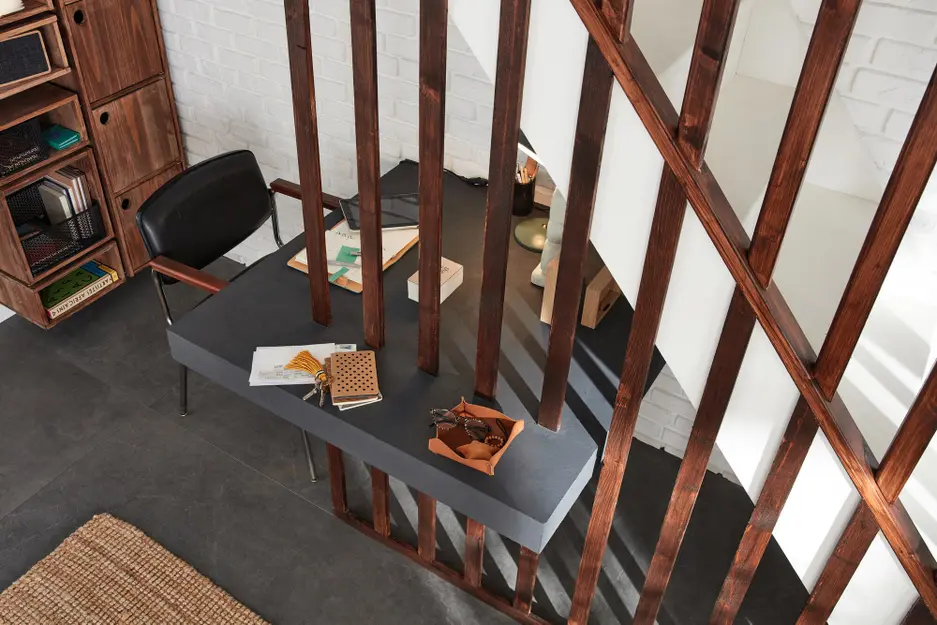 A lépcsőkorlát egyben az íróasztalt is tartja.