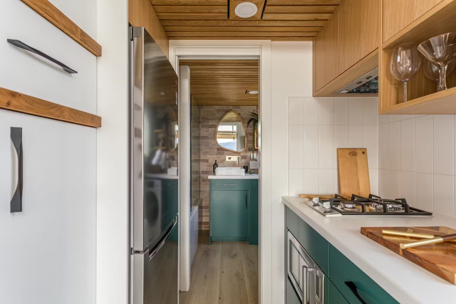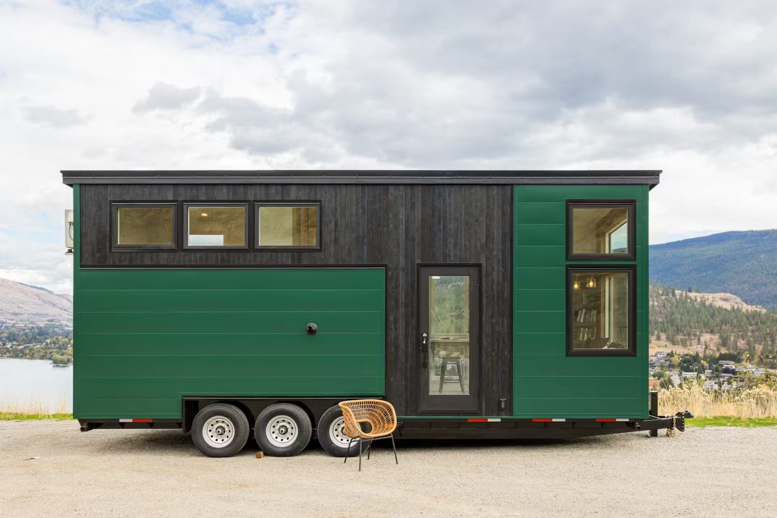 Ez a zöld miniház egész évben kényelmesen lakható a szigetelésnek hála, így bármilyen évszakban élvezhetjük az elénk táruló csodás panorámát. A mobilház üde zöld színt kapott, ami visszatér a belső terekben is a konyhabútornál, a könyvespolcnál és a fürdőszoba szekrénynél is. A lépcsőkorlát és a lépcsőfokok tölgyfából készültek, csakúgy, mint a konyhaszekrények és a mennyezet a galériás háló alatt. Az alsó és a felső szinten hatalmas ablakokon át jut be a természetes fény. Az egész mobilház minőségi anyagokból és szerelvényekből épült, így a kis méret ellenére is minden igényt kielégít.