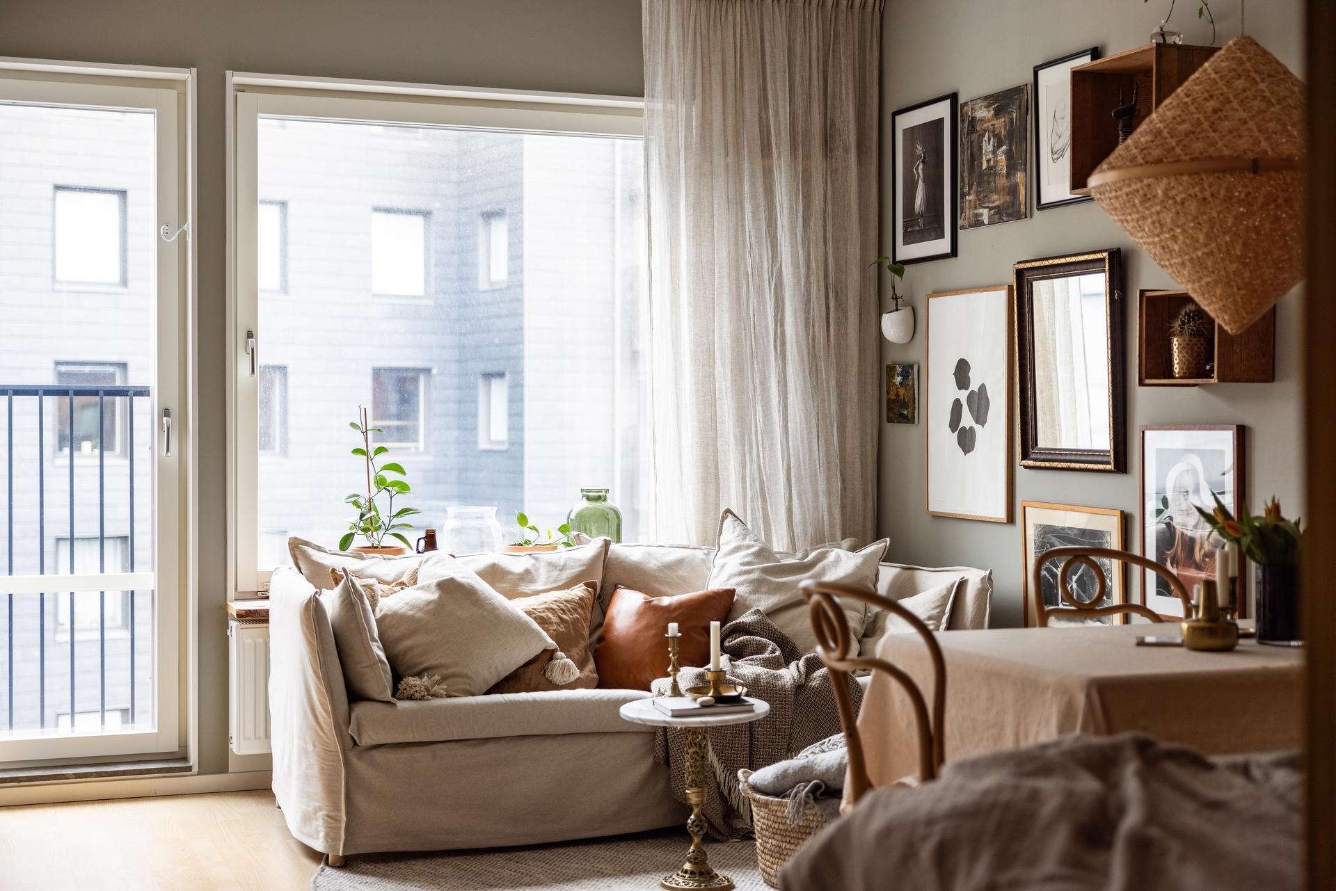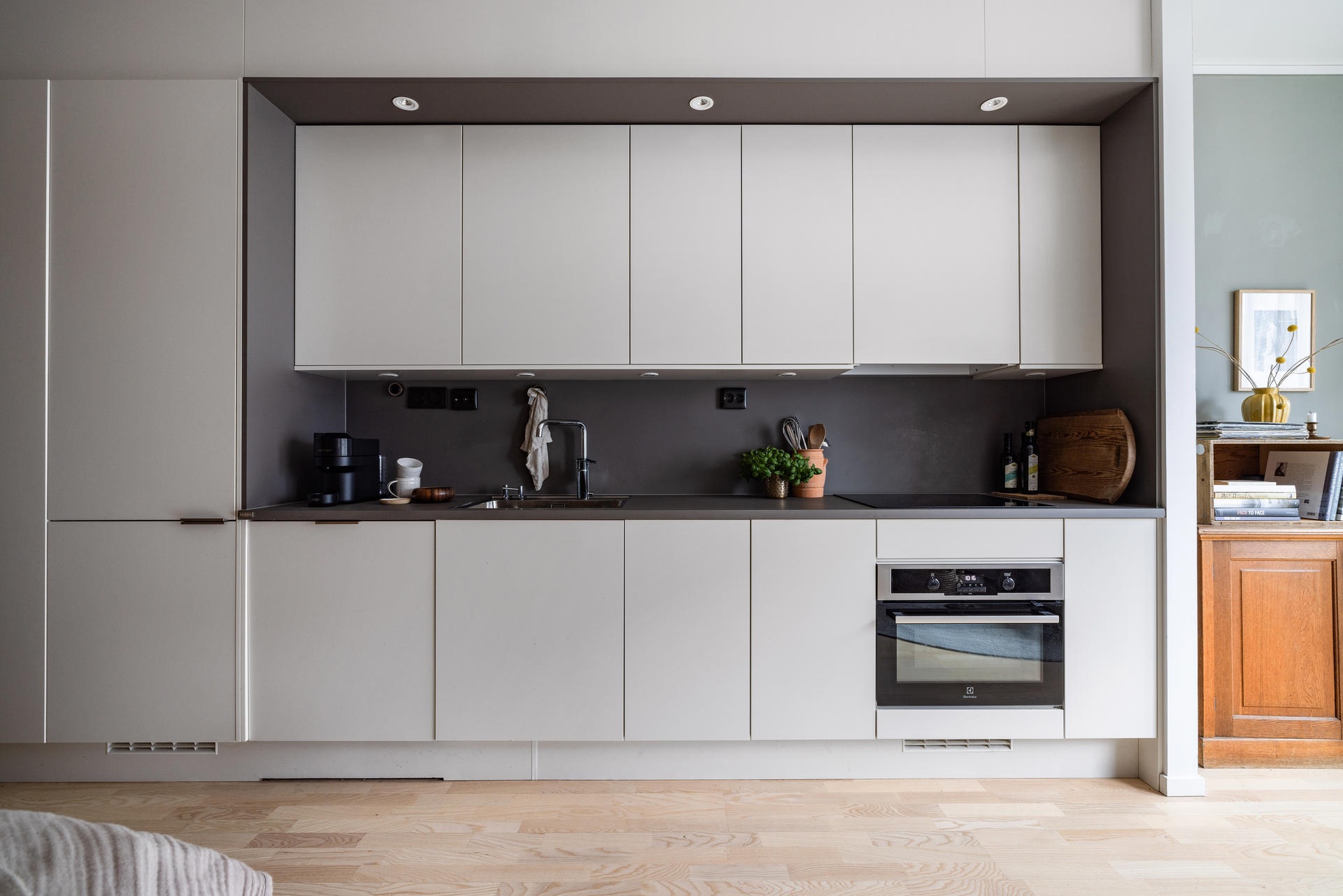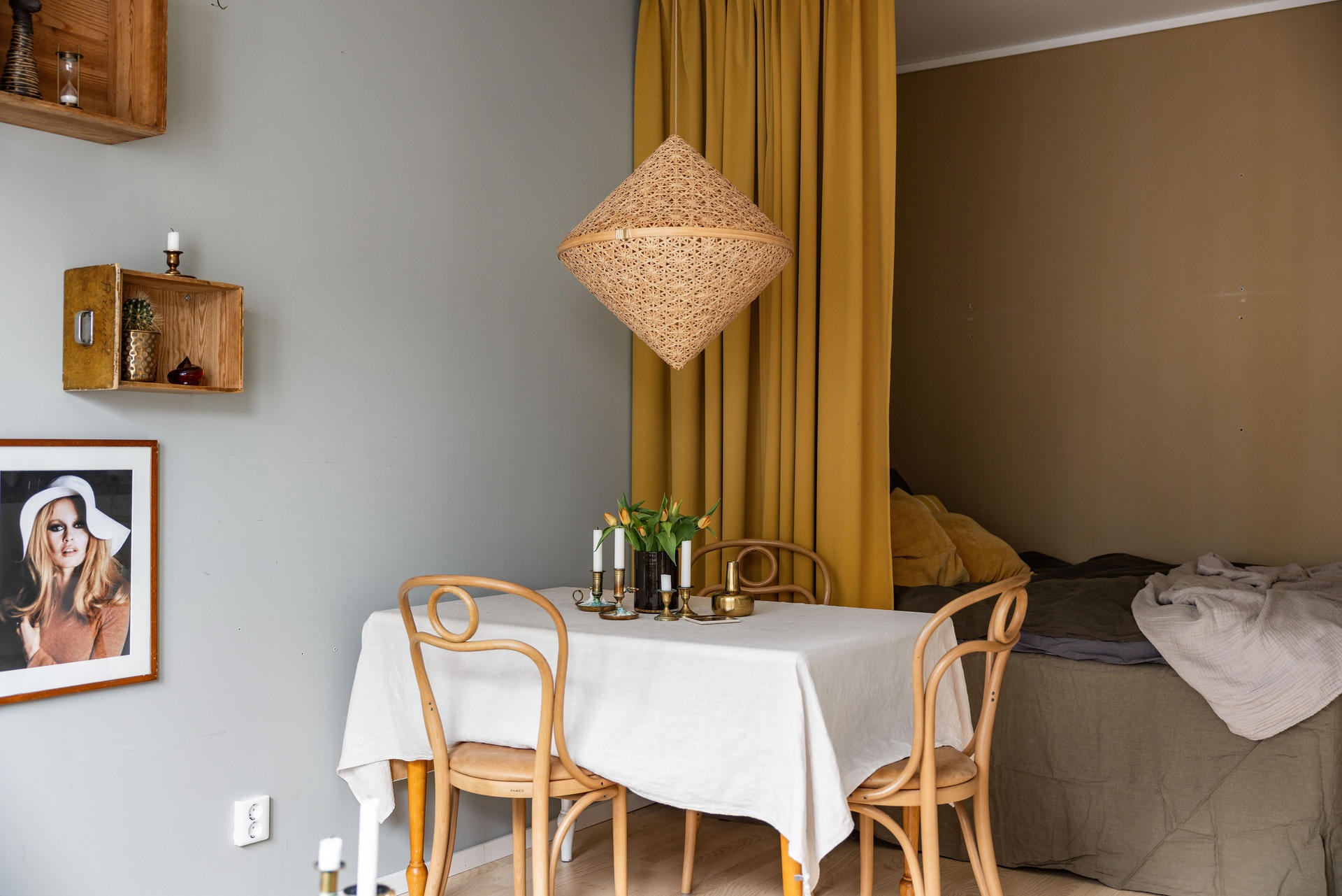 Ez a 32 nm-es stúdiólakás jól kiegyensúlyozott, színekben gazdag, ötletes dekorációval büszkélkedhet. Az ágy, amely egy függöny mögé van rejtve, többek között egy ilyen okos megoldás, akárcsak a sárga színe, amely élettel tölti meg a szürke dominanciájú belső teret. Egy kis fa és rattan hozzáadott melegséget kölcsönöz a lakásnak. Kétségtelen, hogy kicsi az alapterülete, de semmiben sem marad el a nagyobb ingatlanoktól, hiszen elegáns kidolgozással és minőségi anyagokkal rendelkezik. Az előszoba szürke tárolószekrénye színátmenet nélkül folytatódik a letisztult konyha frontokon, mintha csak ugyanaz a hosszú bútor lenne – egy újabb remek ötlet a tér növelésére, amit érdemes megjegyezni.