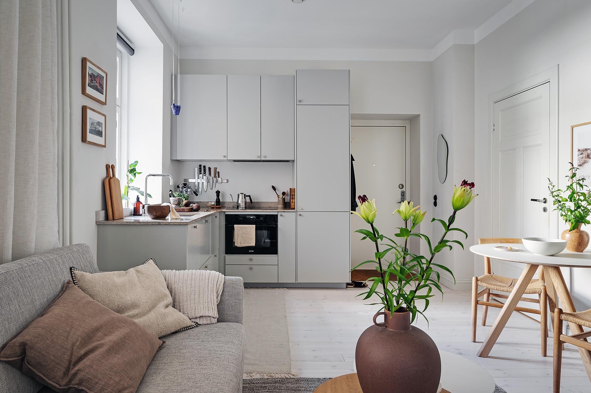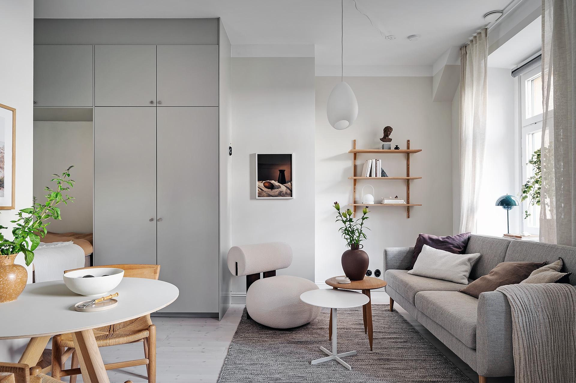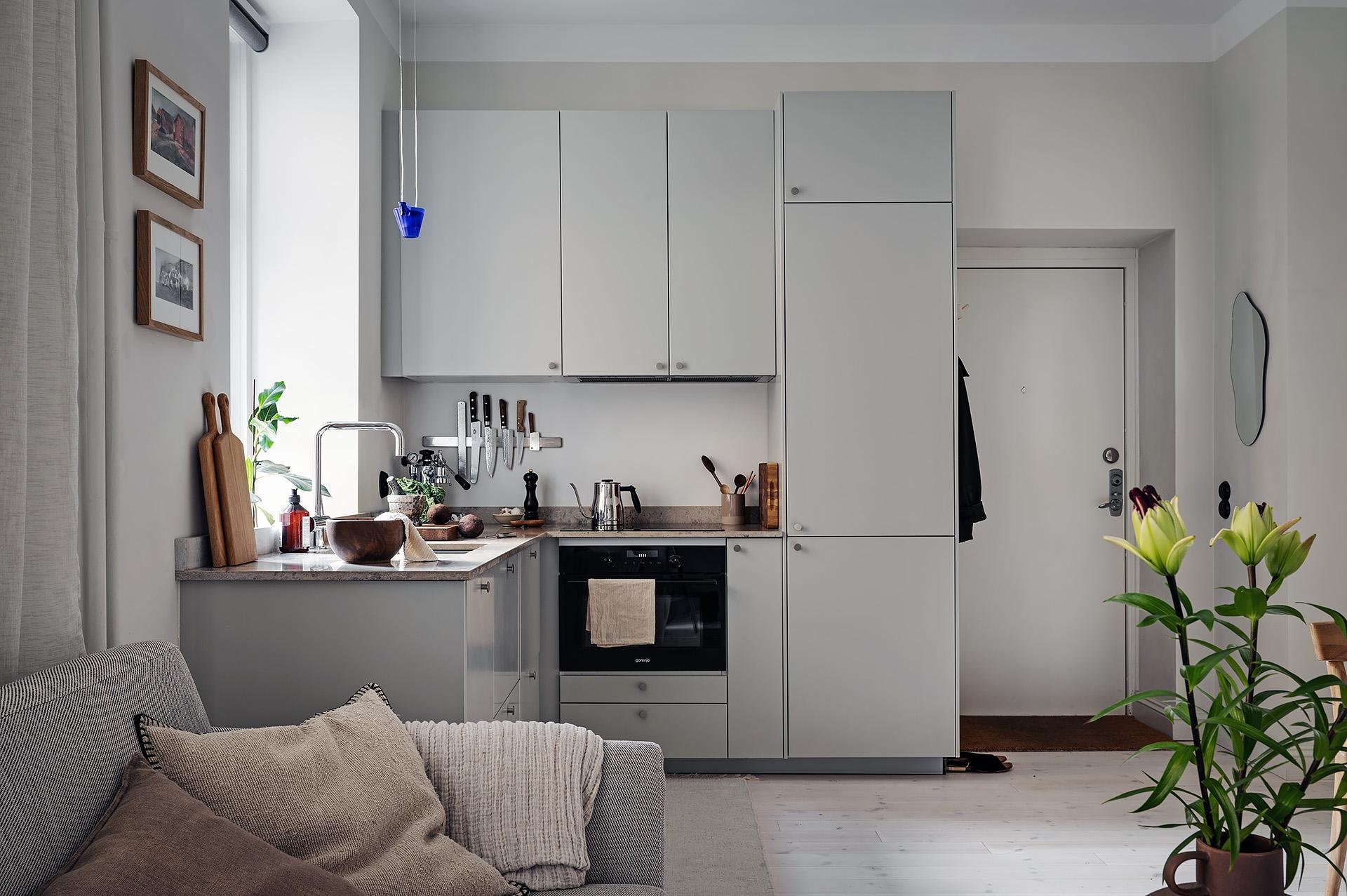 Ez a 28 nm-es stúdiólakás egy több mint százéves épületben található. Modern stílusban újították fel, kihasználva a lakás téglalap alakú alaprajzát. Az egyik végében a konyha, a másikban pedig a hálószoba helyezkedik el, amely egy fülkeszerű térben kapott helyett körülötte számos tárolószekrénnyel. Világos és egyszerű, így ideális első lakás lehet egy diáknak vagy egyedülálló személynek. A falak klasszikusan fehérre vannak festve, ami alapszabály egy kis lakás esetében, hogy világosabbnak tűnjön és nagyobb térérzetet keltsen. A padló szintén klasszikus, gyönyörű világos parketta. Az L-alakú, szürke IKEA konyha meglehetősen nagy egy stúdiólakáshoz képest. Egyszerű, jó helykihasználtságú, még hosszú évekig biztosan nem kell átalakítani.