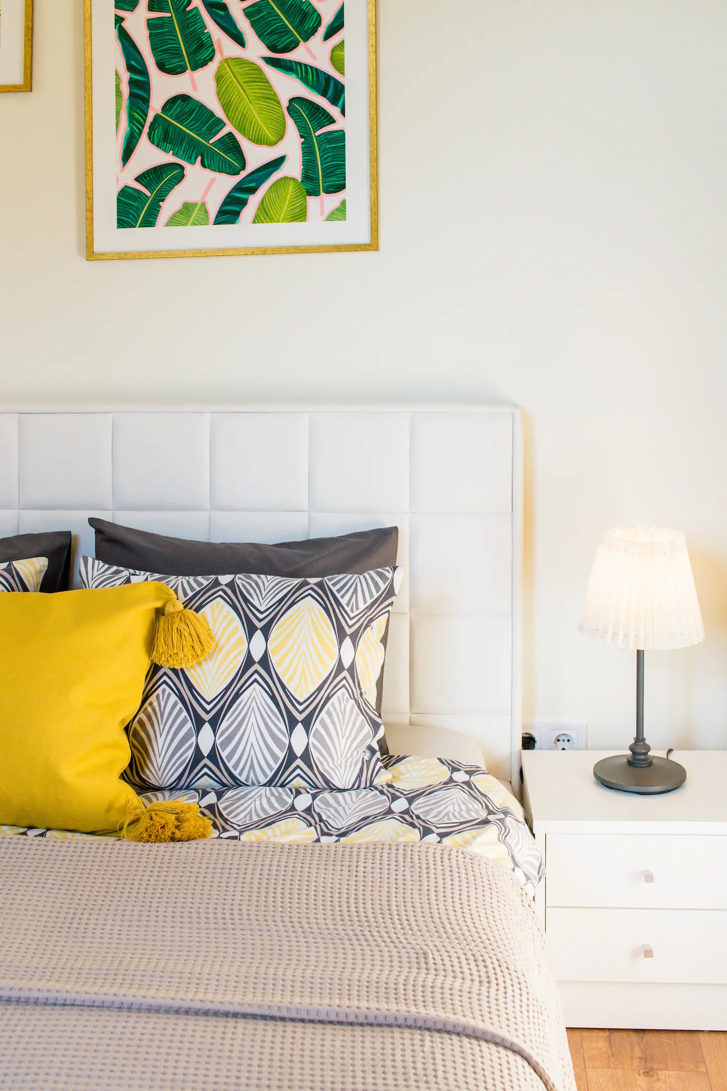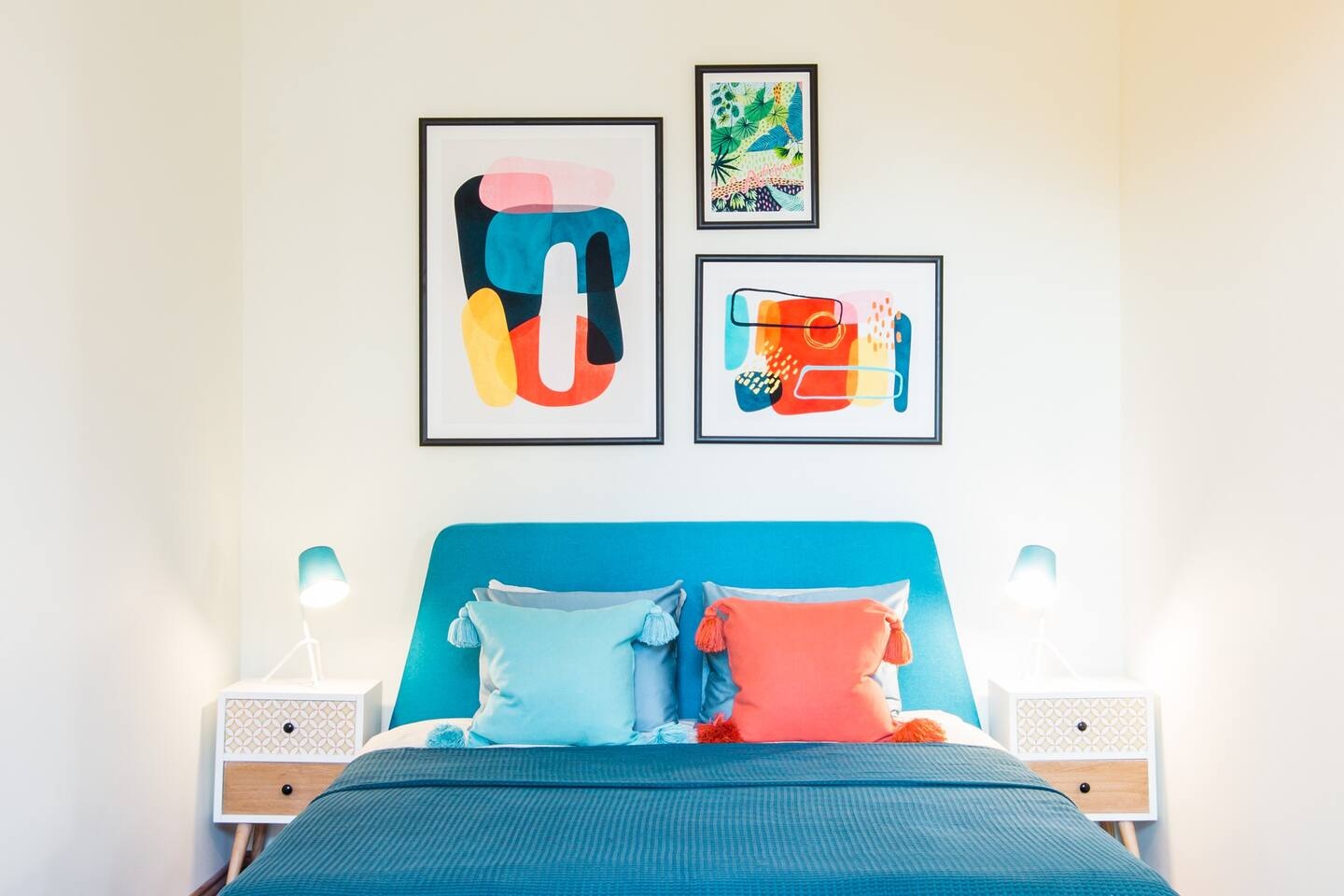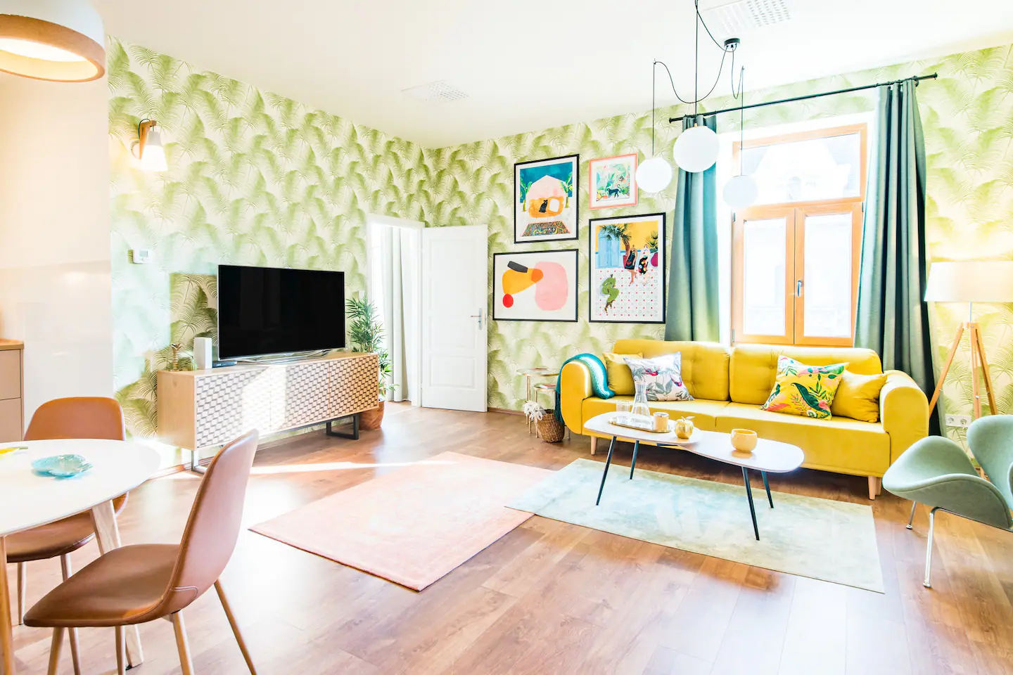 Egy csendes, régi épületben, Budapest központjában található a következő lakás, amelyet kortárs és vintage stílusban rendeztek be. A színek merészek és a keverésük kiválóan sikerült. A lakás alapterülete 77 m², ami magában foglal egy nyitott nappalit étkezőrésszel és amerikai konyhával, két hálószobát és két fürdőszobát. Az alapterület tökéletesen optimalizált a kényelem érdekében. A nappaliban a növényi motívumos tapéta, egy sárga kanapé és egy zöld karosszék adja meg az alaphangulatot. A hálószobák élénk kék színűek, tele karakteres grafikákkal. Ez a kontrasztos színválasztás tisztelgés a gyönyörű, klasszikus zöld homlokzatú épület előtt, ahol a lakás található. A világos árnyalatok jó döntésnek bizonyultak, dinamizmust és vidám atmoszférát kölcsönöznek a térnek.