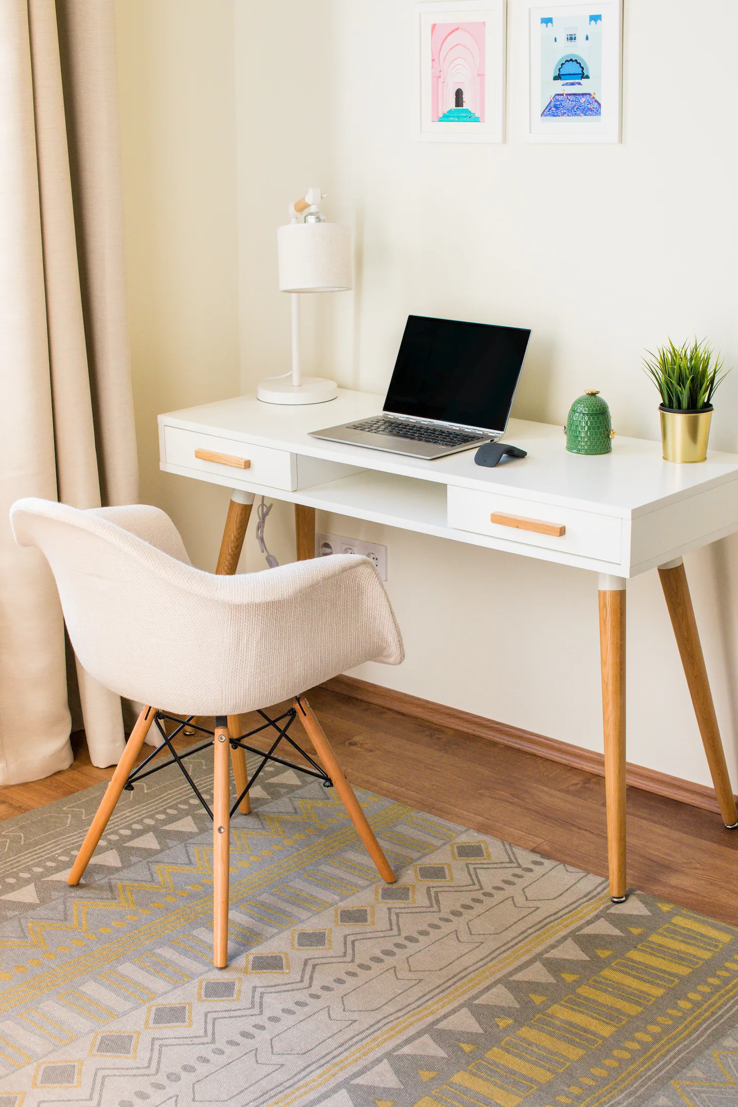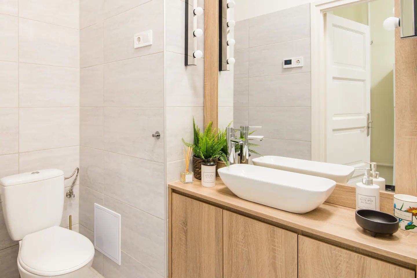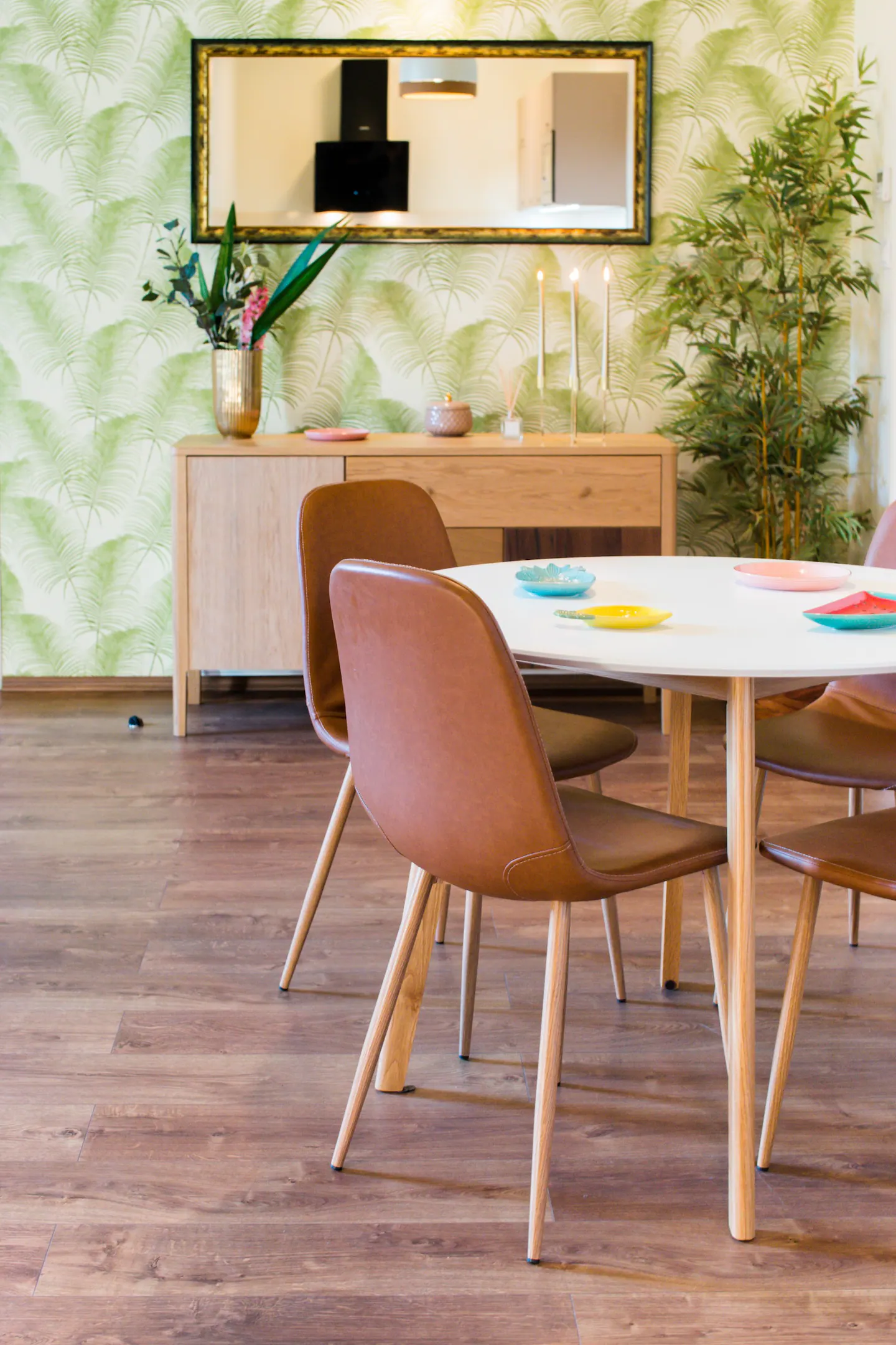 Egy csendes, régi épületben, Budapest központjában található a következő lakás, amelyet kortárs és vintage stílusban rendeztek be. A színek merészek és a keverésük kiválóan sikerült. A lakás alapterülete 77 m², ami magában foglal egy nyitott nappalit étkezőrésszel és amerikai konyhával, két hálószobát és két fürdőszobát. Az alapterület tökéletesen optimalizált a kényelem érdekében. A nappaliban a növényi motívumos tapéta, egy sárga kanapé és egy zöld karosszék adja meg az alaphangulatot. A hálószobák élénk kék színűek, tele karakteres grafikákkal. Ez a kontrasztos színválasztás tisztelgés a gyönyörű, klasszikus zöld homlokzatú épület előtt, ahol a lakás található. A világos árnyalatok jó döntésnek bizonyultak, dinamizmust és vidám atmoszférát kölcsönöznek a térnek.