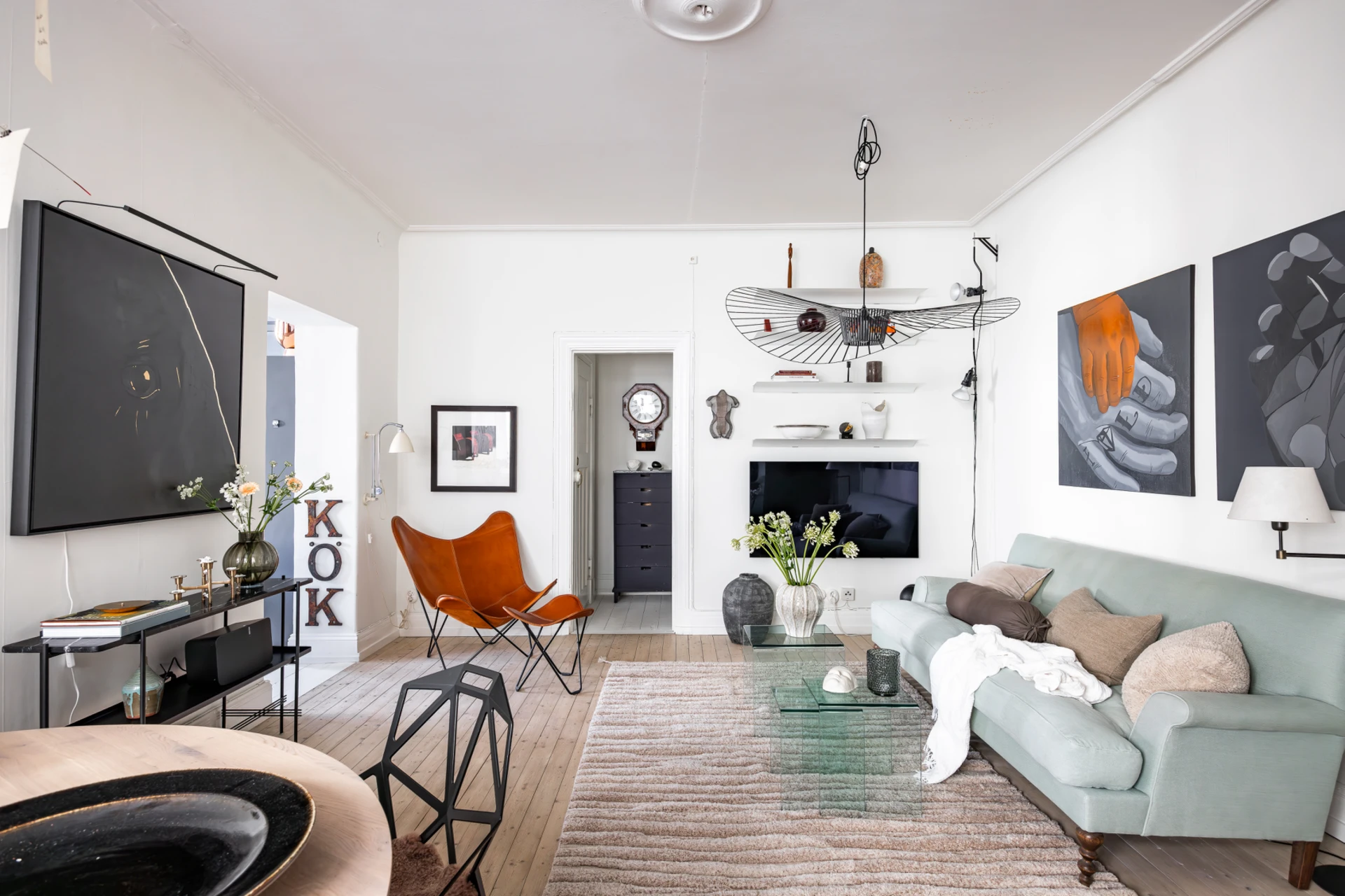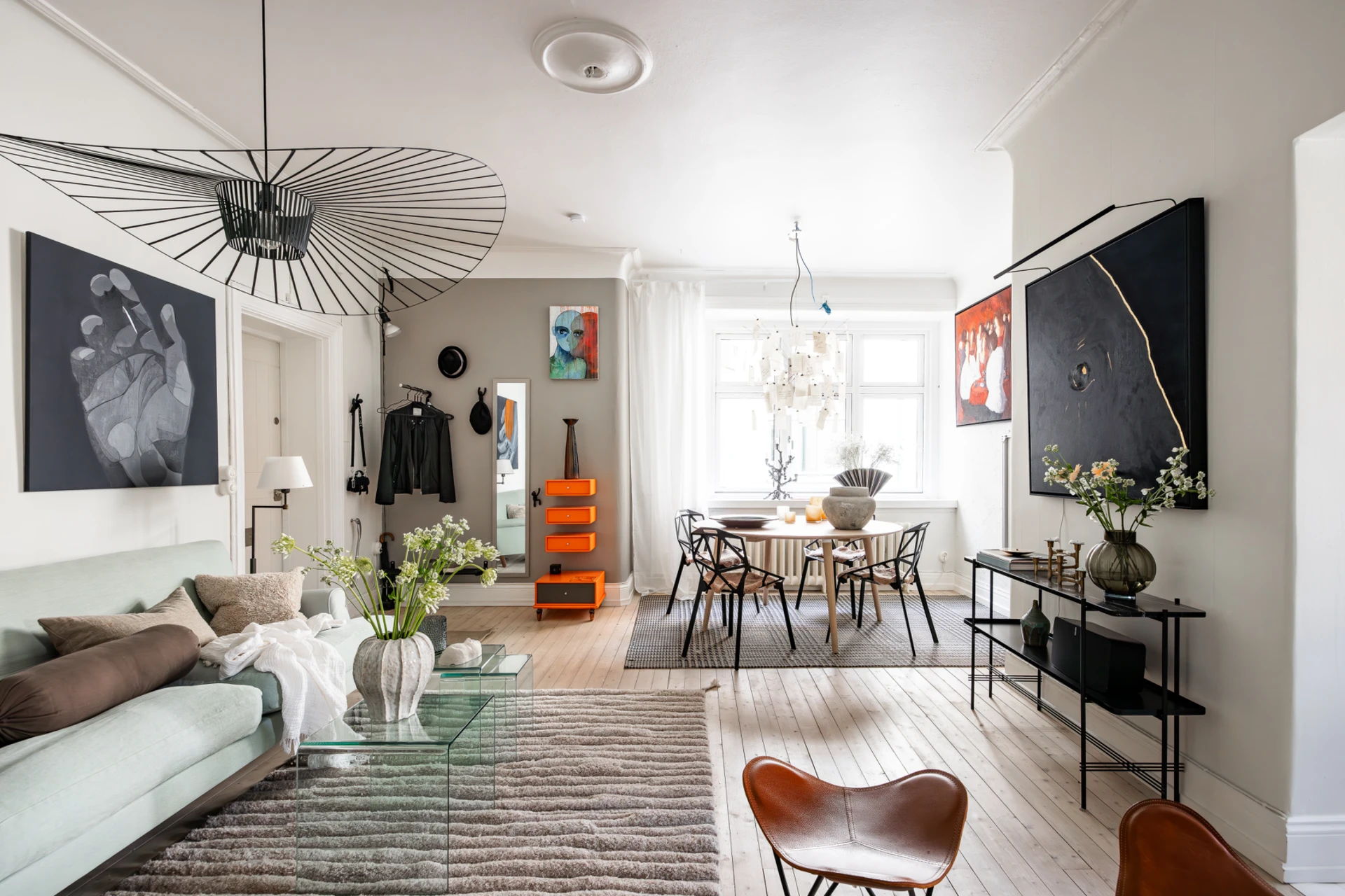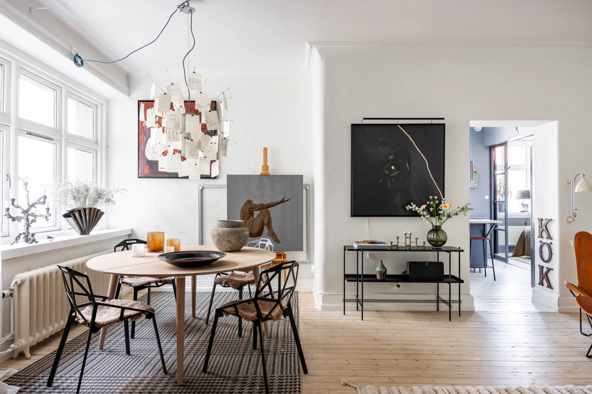 Ennek a 65 nm-es lakásnak az elrendezése első ránézésre nem fog mindenkinek tetszeni. Ám megérdemel egy második esélyt. A szokatlansága abban rejlik, hogy a hálószoba közvetlenül a konyhára nyílik, és csak egy válaszfal van közöttük. Az atipikus elrendezés mellett a felújítás során döntöttek, hogy tágasabbnak hasson a tér. A régi épülethez magas belmagasság és nagy ablakok tartoznak, amelyek tágassággal és természetes fénnyel ellensúlyozzák a furcsa elrendezést. Az egész lakásban a kékesszürke szín dominál – kivéve a fürdőszobát – ami jól illik a kortárs bútordarabokhoz. Az eredeti színek választása folytatódik a fürdőszobában is, ahol fenyő zöld díszíti a falat. Bár ez az elrendezés sokak számára nem tűnik tökéletesnek, de lehetővé tette, hogy a lakás legnagyobb helyiségét a nappalinak szenteljék.