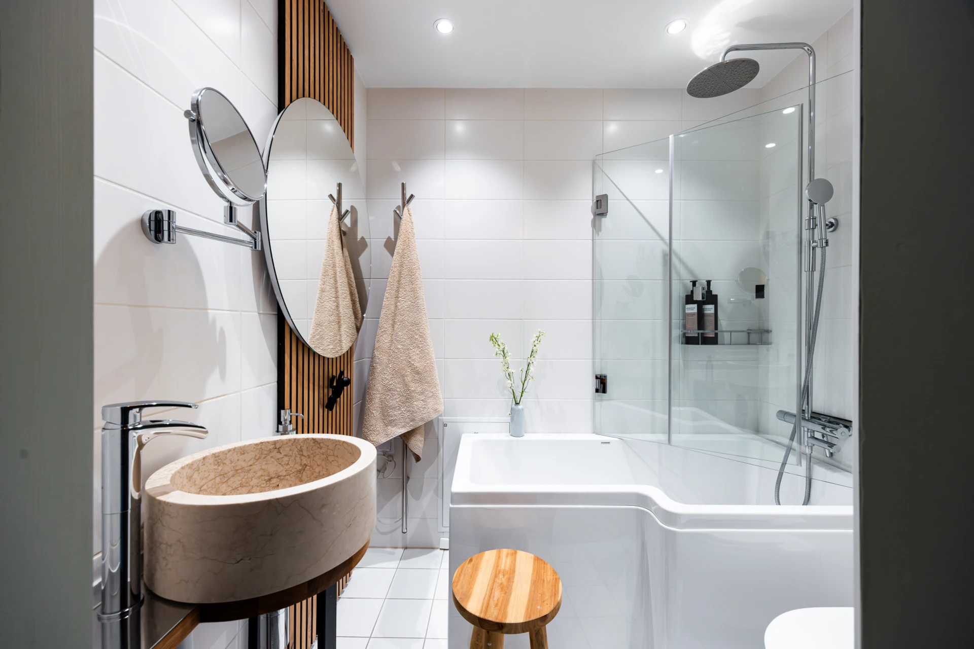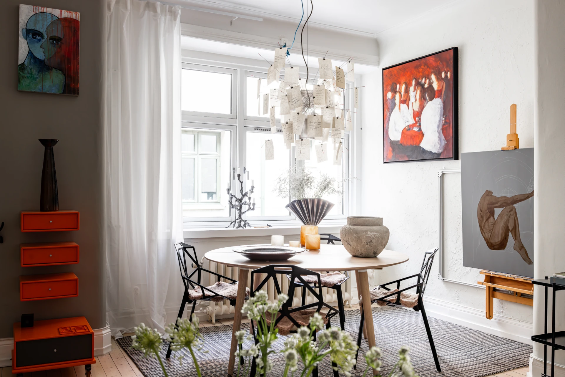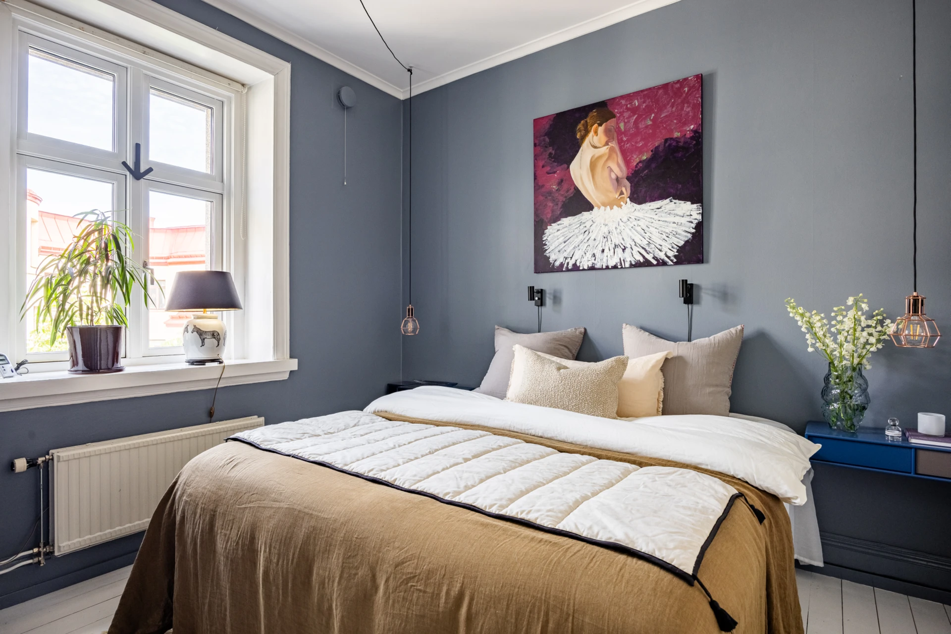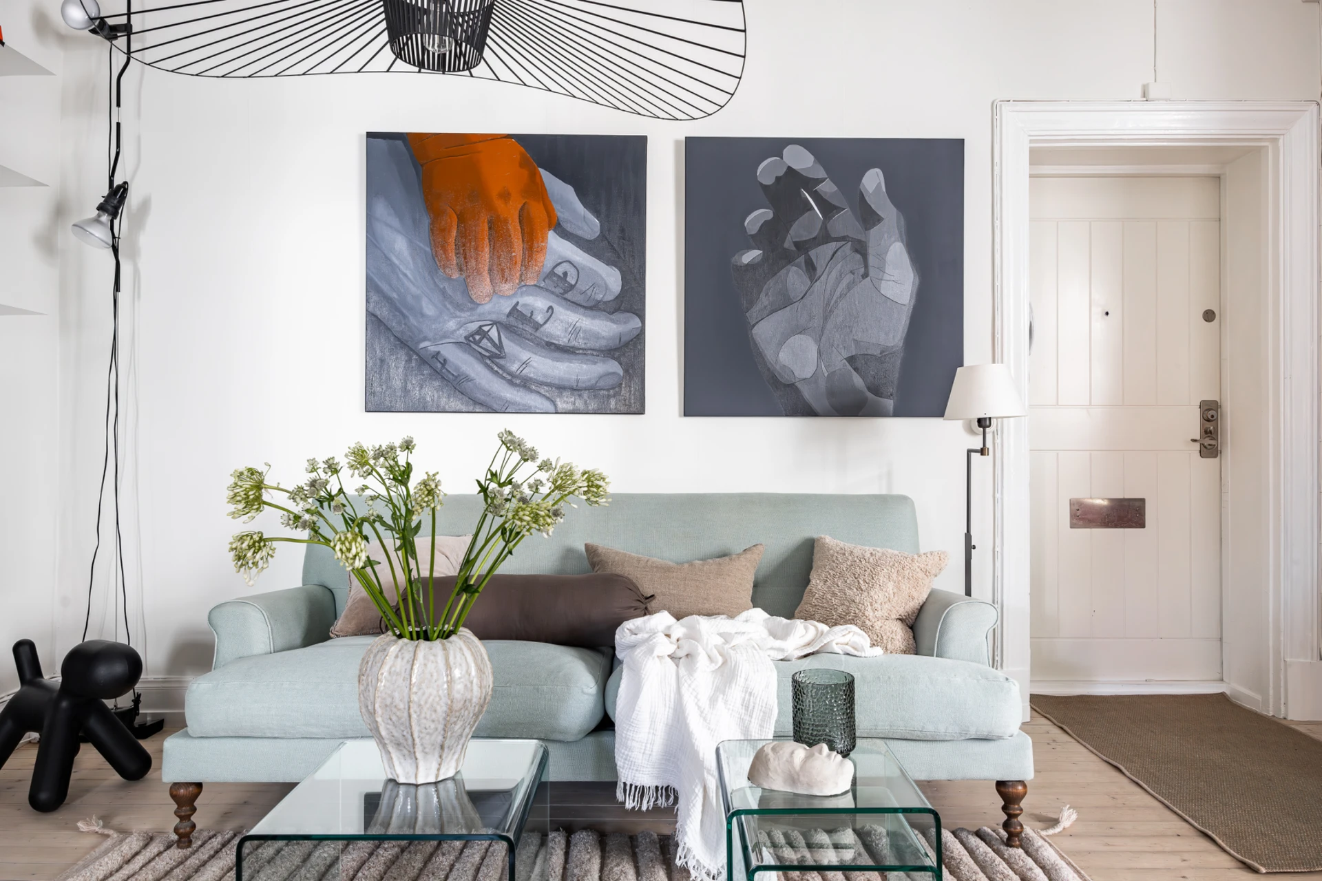 Ennek a 65 nm-es lakásnak az elrendezése első ránézésre nem fog mindenkinek tetszeni. Ám megérdemel egy második esélyt. A szokatlansága abban rejlik, hogy a hálószoba közvetlenül a konyhára nyílik, és csak egy válaszfal van közöttük. Az atipikus elrendezés mellett a felújítás során döntöttek, hogy tágasabbnak hasson a tér. A régi épülethez magas belmagasság és nagy ablakok tartoznak, amelyek tágassággal és természetes fénnyel ellensúlyozzák a furcsa elrendezést. Az egész lakásban a kékesszürke szín dominál – kivéve a fürdőszobát – ami jól illik a kortárs bútordarabokhoz. Az eredeti színek választása folytatódik a fürdőszobában is, ahol fenyő zöld díszíti a falat. Bár ez az elrendezés sokak számára nem tűnik tökéletesnek, de lehetővé tette, hogy a lakás legnagyobb helyiségét a nappalinak szenteljék.