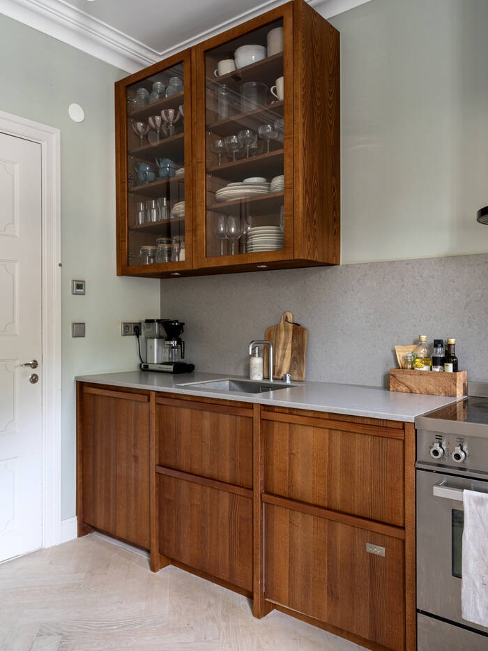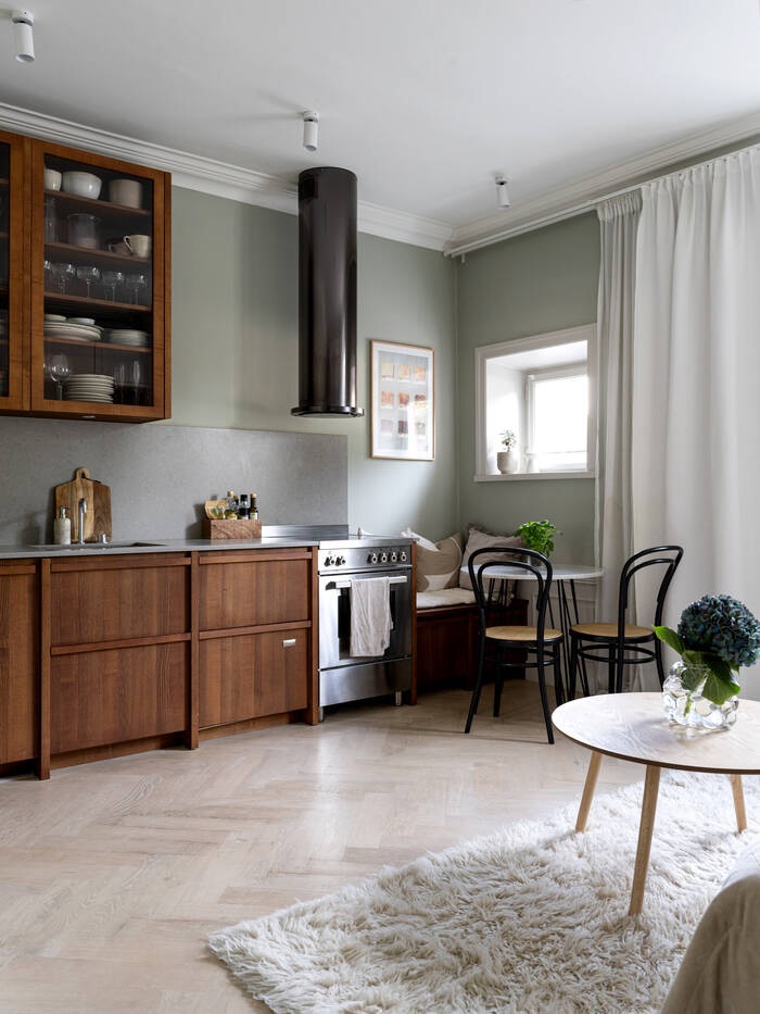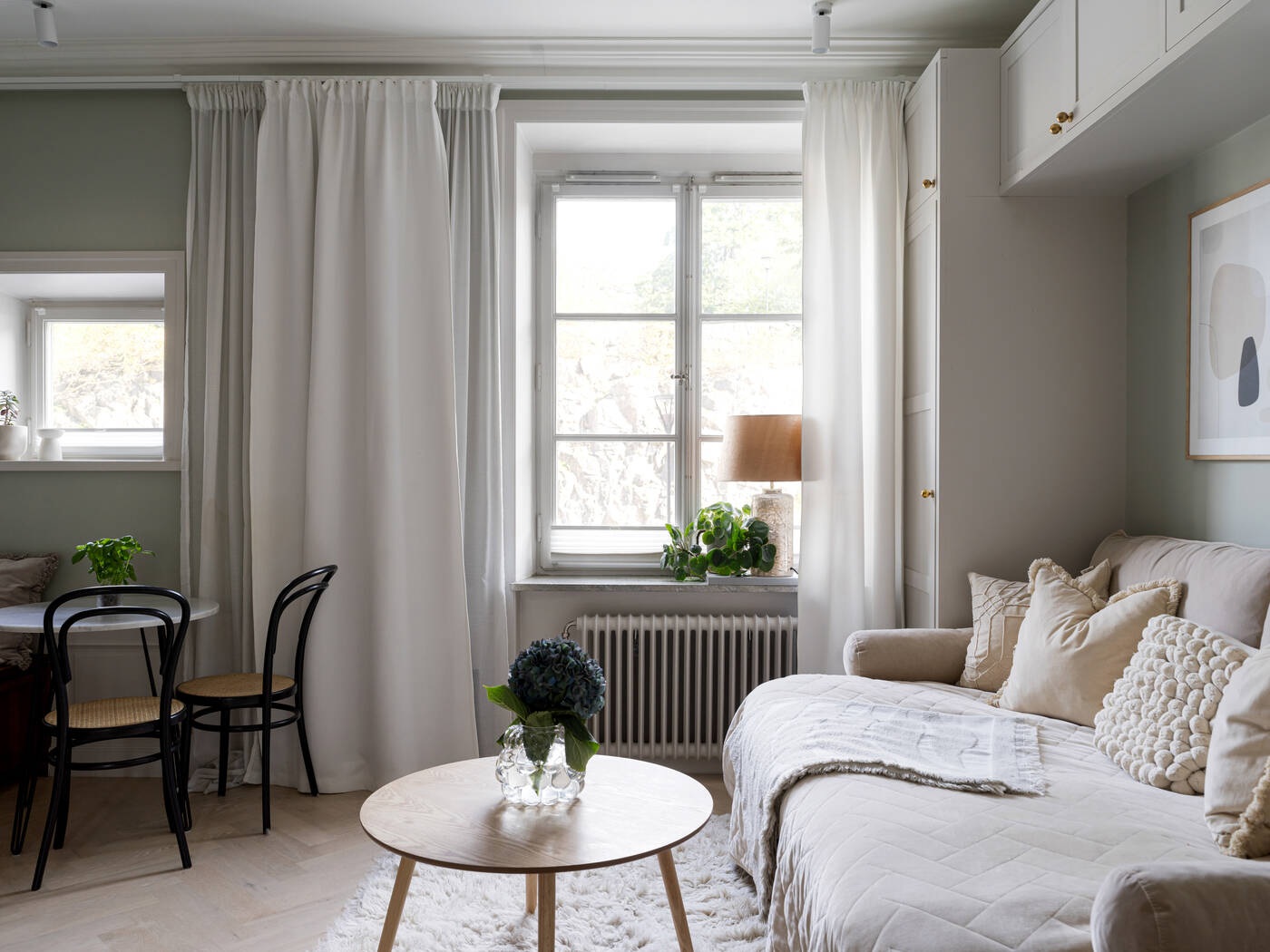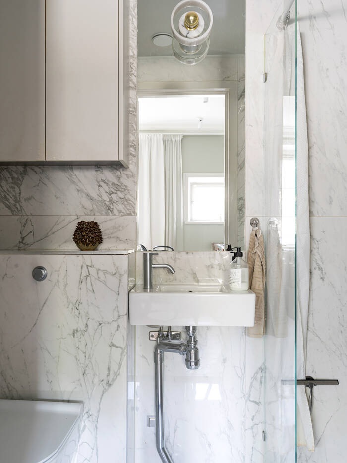 Ez az optimális helykihasználású, tökéletesen megtervezett stúdiólakás mindössze 21 nm, mégis olyan, mintha egy luxus hotelszobában lennénk. Minden szükséges funkcióval rendelkezik: konyha, étkező, nappali, amely hálószobává alakítható, tárolóhely és egy gyönyörű fürdőszoba. A választott anyagok minőségében sem kötöttek kompromisszumot. Halszálkás parketta, diófa konyha és fehér márvány a fürdőszobában – ezek azok a részletek, amelyek kiemelik ezt a stúdiót a többi közül. A magas belmagasságnak és a professzionális tervezésnek köszönhető térkialakítás nagyobbnak láttatja, mint amekkora valójában, mintha a falait kitolták volna.