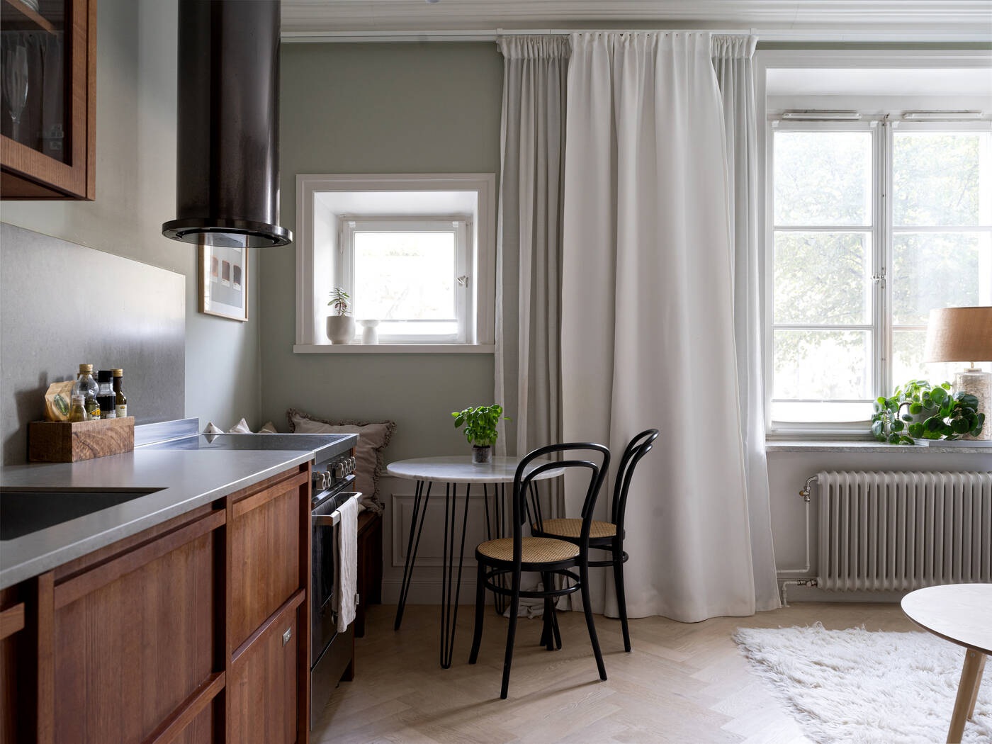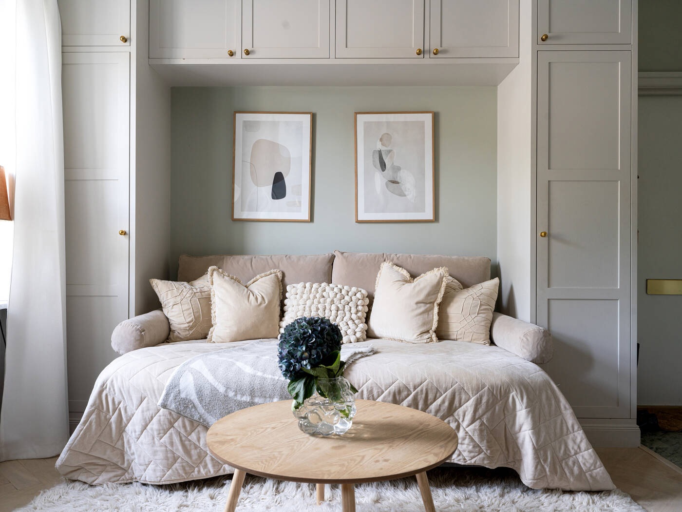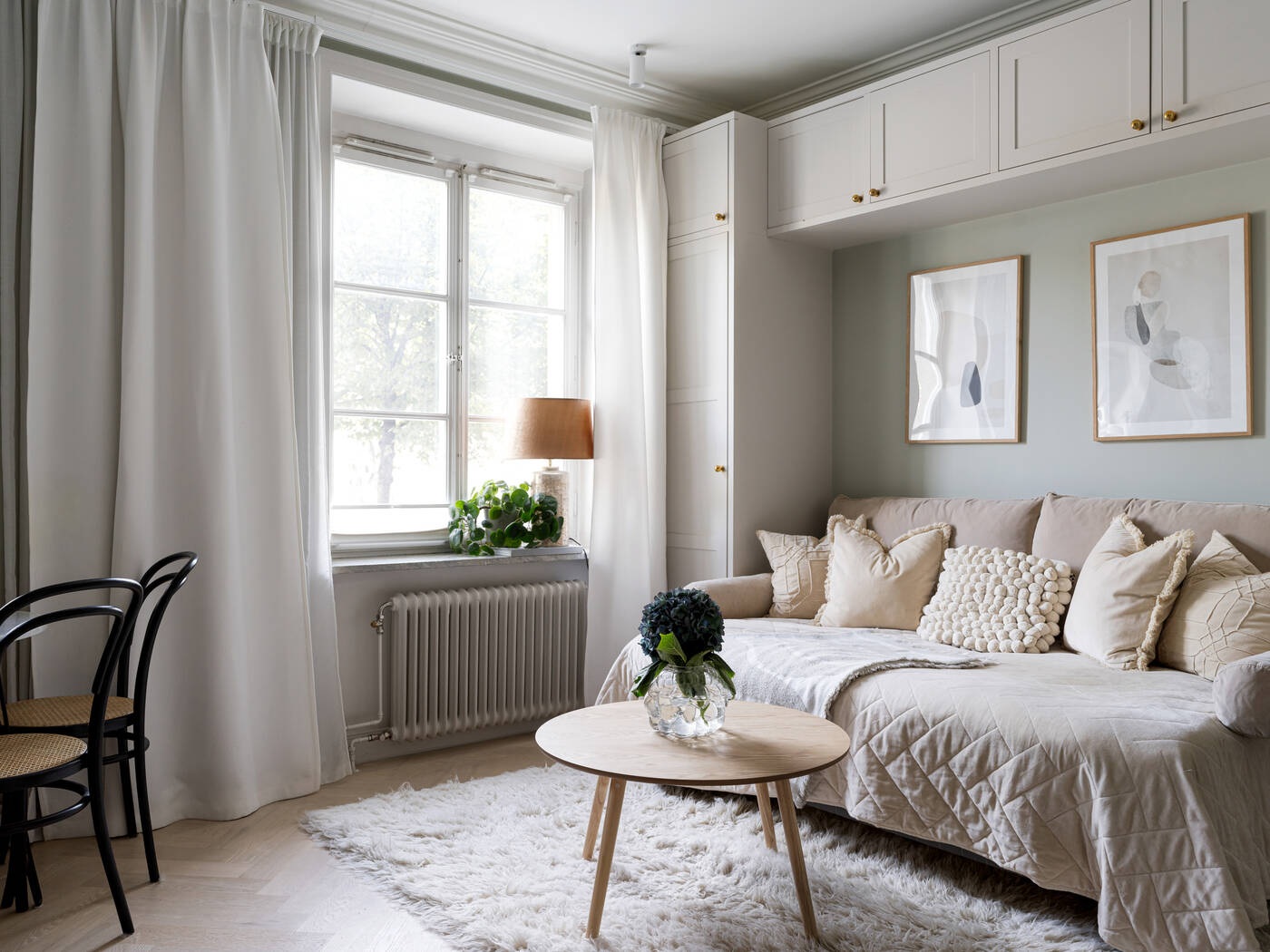 Ez az optimális helykihasználású, tökéletesen megtervezett stúdiólakás mindössze 21 nm, mégis olyan, mintha egy luxus hotelszobában lennénk. Minden szükséges funkcióval rendelkezik: konyha, étkező, nappali, amely hálószobává alakítható, tárolóhely és egy gyönyörű fürdőszoba. A választott anyagok minőségében sem kötöttek kompromisszumot. Halszálkás parketta, diófa konyha és fehér márvány a fürdőszobában – ezek azok a részletek, amelyek kiemelik ezt a stúdiót a többi közül. A magas belmagasságnak és a professzionális tervezésnek köszönhető térkialakítás nagyobbnak láttatja, mint amekkora valójában, mintha a falait kitolták volna.