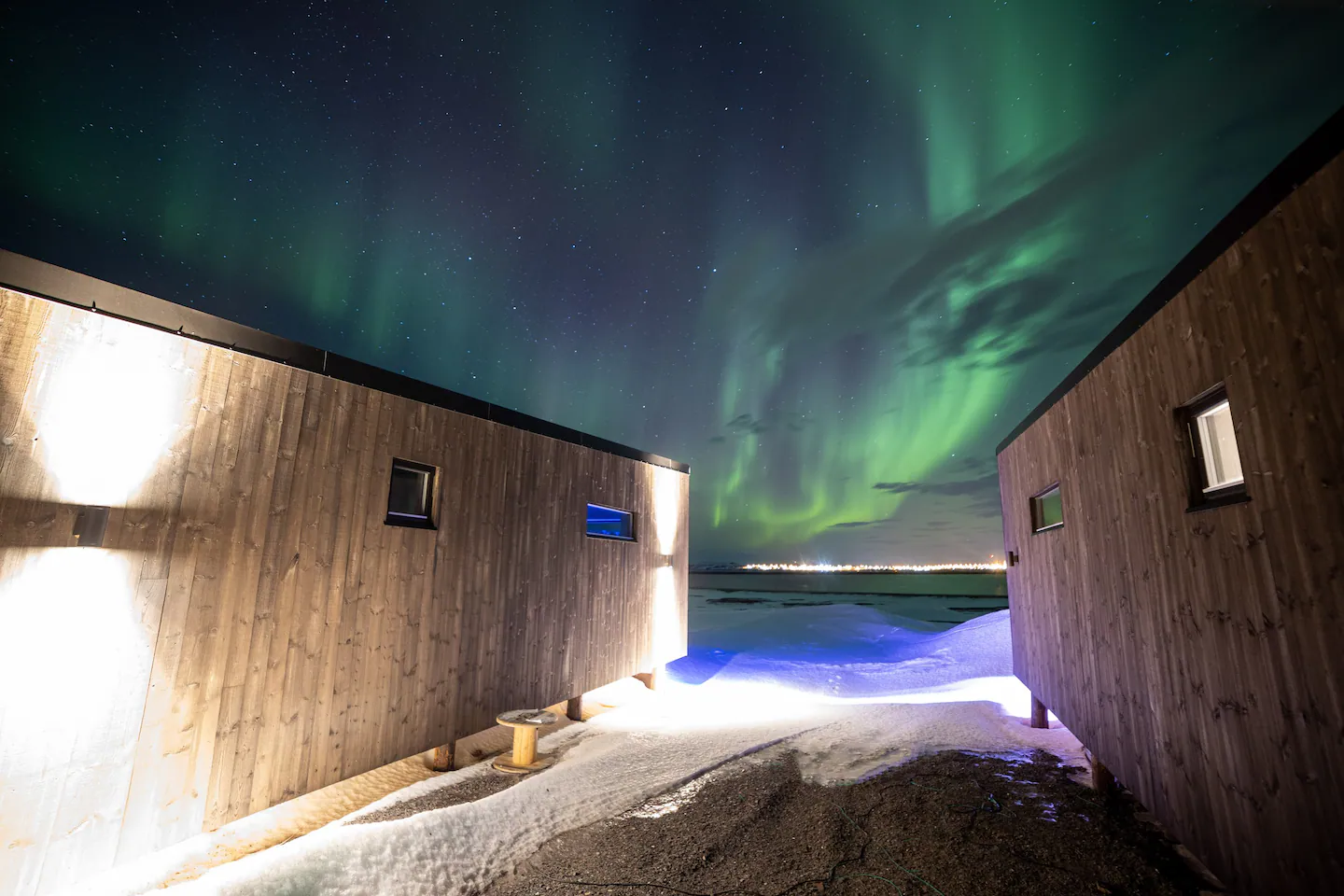 A házat úgy tervezték, hogy a bent lakók komfortos melegben gyönyörködhessenek az ég zöld és lila árnyalataiban. A nappali hatalmas üvegablaka lehetővé teszi, hogy teljes pompájában lássák ezt a lenyűgöző természeti jelenséget, amely felejthetetlen emlékeket hagy maga után.