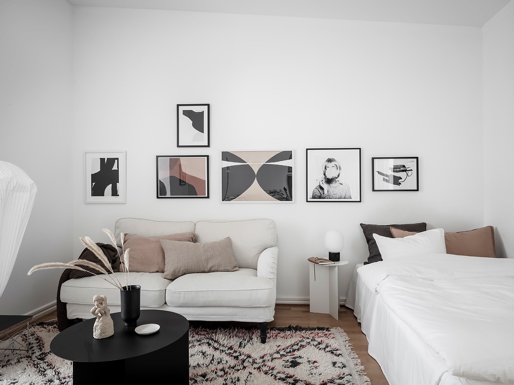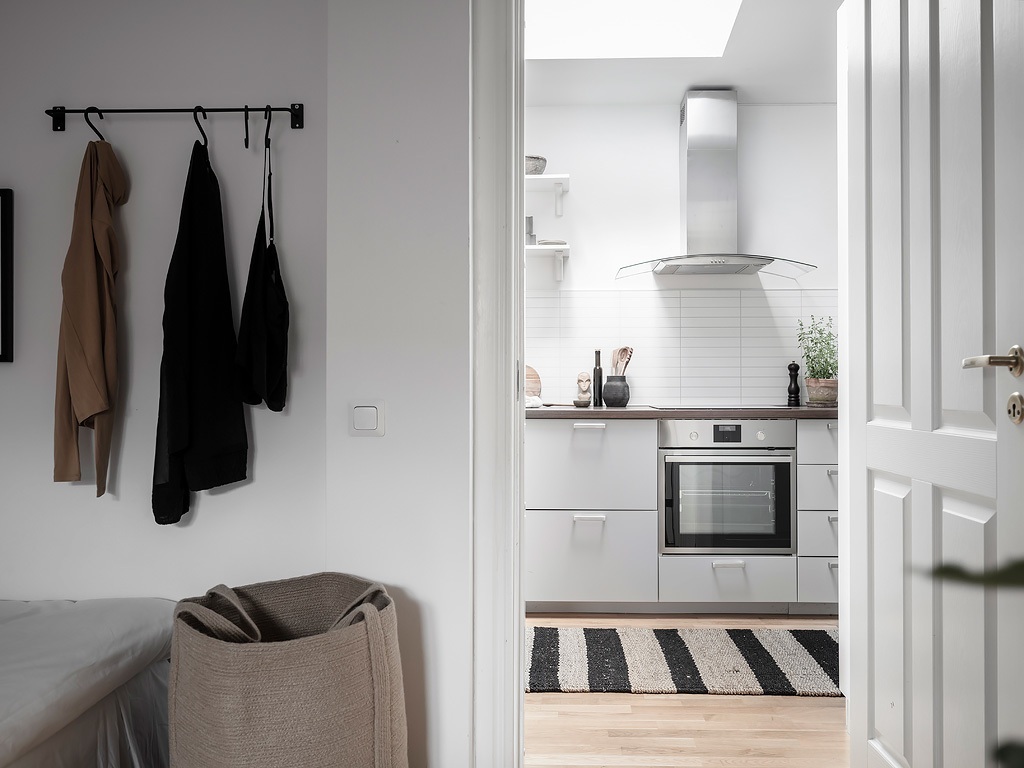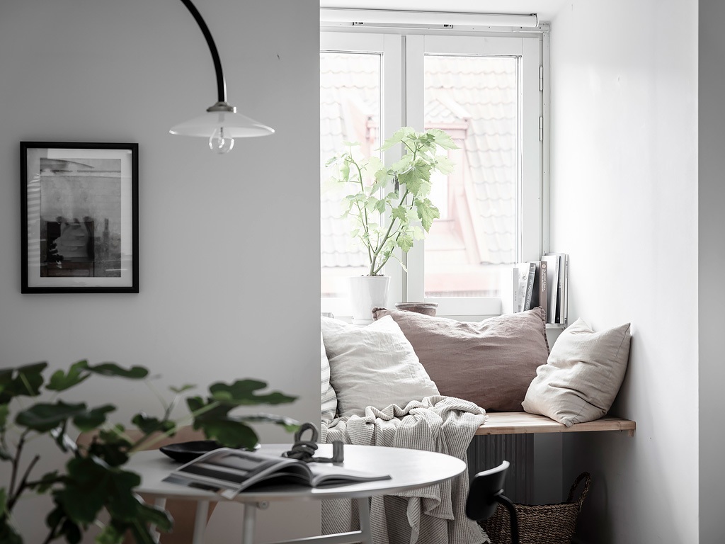 Egy régi téglaépület padlásterében alakították ki ezt a 31 m²-es fehér stúdiólakást, amelyet visszafogott skandináv stílusban rendeztek be. A fő helyiséget egy klasszikus ablak, míg a konyhát – amely az előtérben kapott helyet – egy tetőablak világítja meg. Minden négyzetmétert gondosan kihasználtak például a nappali ablaka elé egy padot alakítottak ki, ami ideális kuckó olvasáshoz, bámészkodáshoz vagy plusz ülőhelyként is szolgálhat a vendégeknek. Rengeteg tárolóhelyet is elrejtettek a különböző helyiségekben, hiszen, mint tudjuk, egy kis lakásban elengedhetetlen a rendezettség, hogy az ember elméje tiszta és nyugodt maradhasson. Az enteriőr nagy részén használt fehéret világos árnyalatok, például bézs színek, valamint fekete akcentusok teszik élénkebbé.