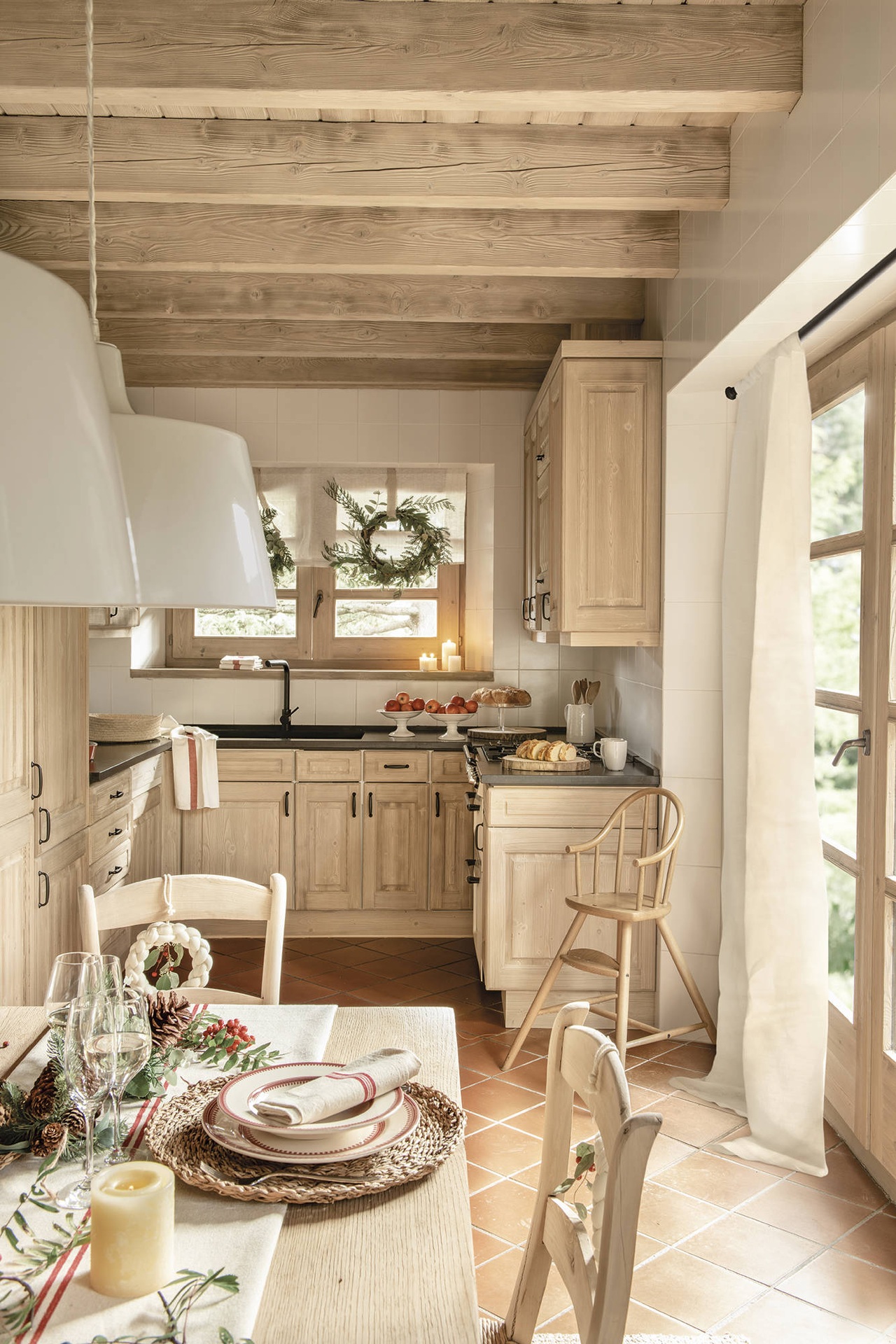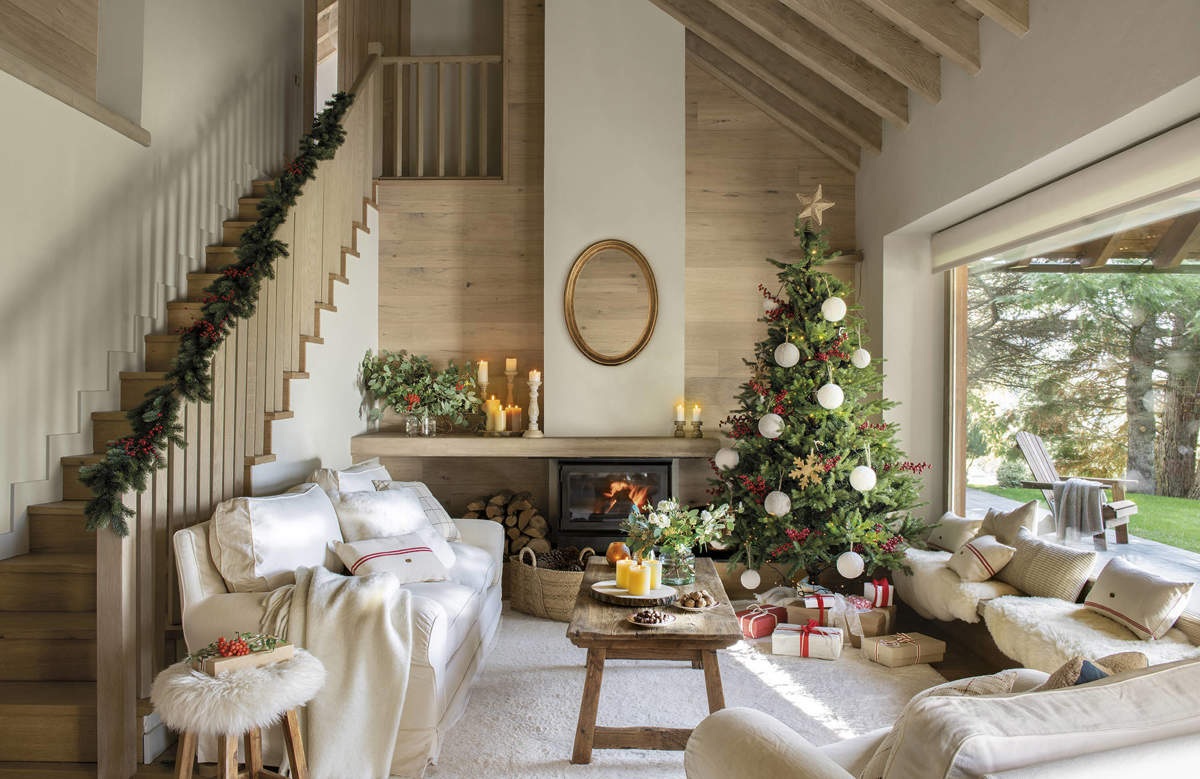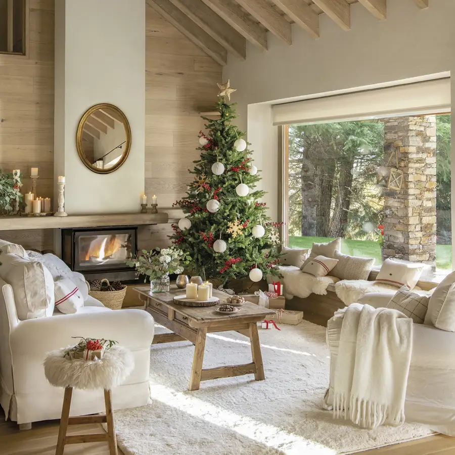 Ki ne szeretne karácsonyozni ebben az erdei házban, amely hibátlanul ötvözi az eleganciát és a faházak rusztikus hangulatát? A textúrák, a fehér és piros kiegészítők választása, a falak és bútorok fájával kombinálva harmonikus egészet alkot. Bár a ház gyönyörű kilátással rendelkezett, a belső tere nagyon sötét volt, így az építész úgy döntött, hogy homokfúvással megmunkálja az összes lakkozott fa falat, hogy világosabbá tegye a teret. Ugyanezt a technikát alkalmazták a bútoroknál is, hogy azok is világosabbak legyenek. A nagy ablakok lehetővé teszik, hogy a fény beáradjon a házba, amely most szinte ragyog.