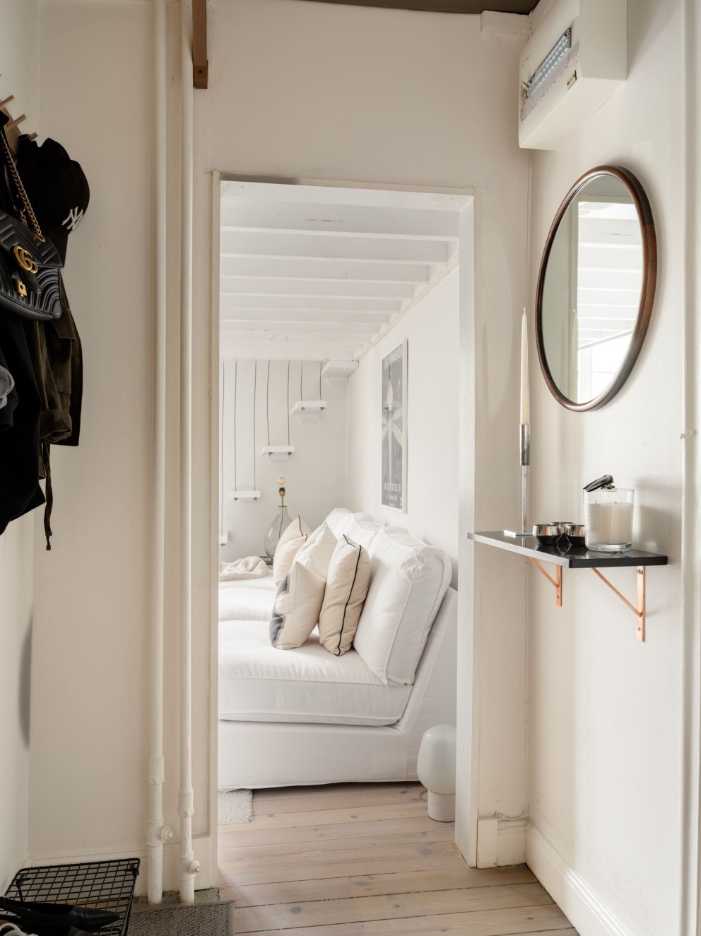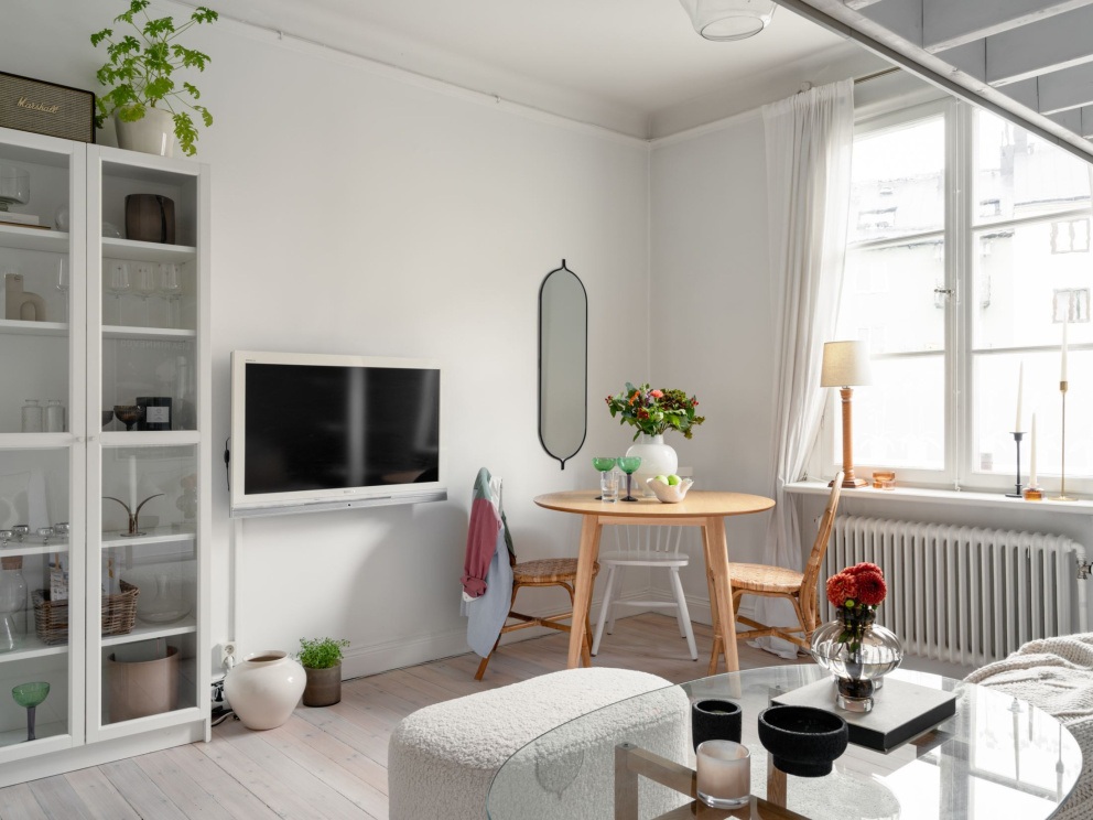 Egy 1926-ban épült házban található a következő minilakás, ami mindössze 24 nm-es alapterülettel rendelkezik, azonban minden alapvető dolog megtalálható benne, beleértve a kifinomult dekorációt is. A világos tónusokkal teli belső tér tökéletesen kényelmes, és maximálisan kihasználja a rendelkezésre álló korlátozott helyet. A lakás megtartotta százéves jellegzetességeit, mint például a parkettát, ajtókat és stukkókat. A magas mennyezetnek köszönhetően lehetőség volt egy galéria beépítésére, ahol a hálóteret alakították ki. Ennek köszönhetően a stúdió fő helyisége nappaliként és étkezőként használható. Szokatlan, de a nappali mellett külön térben kapott helyet a konyha, ami a régi épület jellegzetességéből adódik. Ez a stúdió remek példája annak, hogyan lehet egy apró alapterületet kihasználni és vizuálisan megnövelni világos tónusokkal és egyedi elrendezéssel.