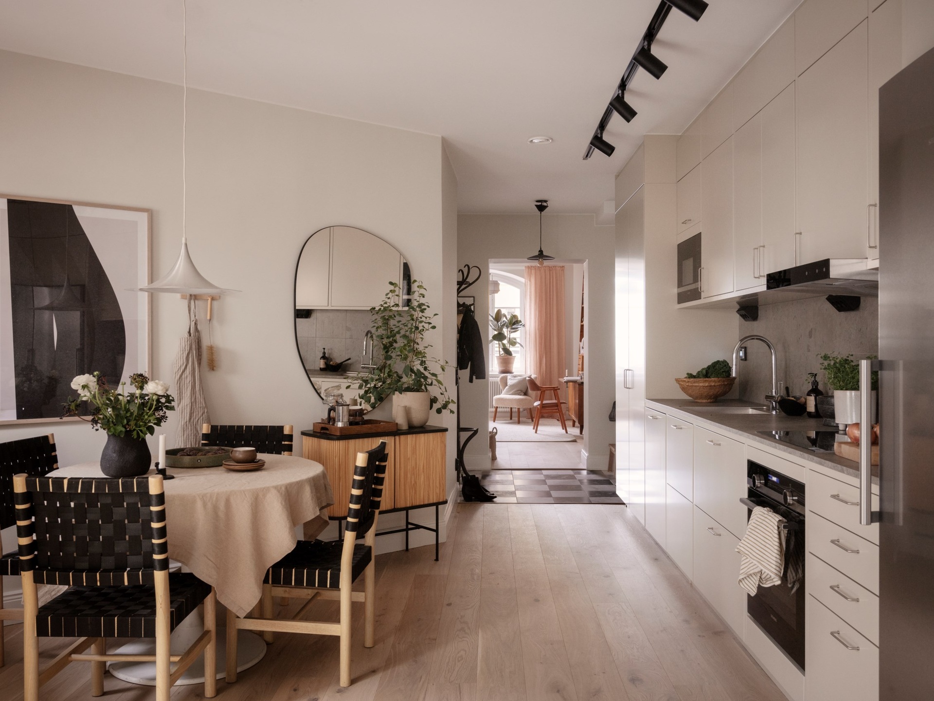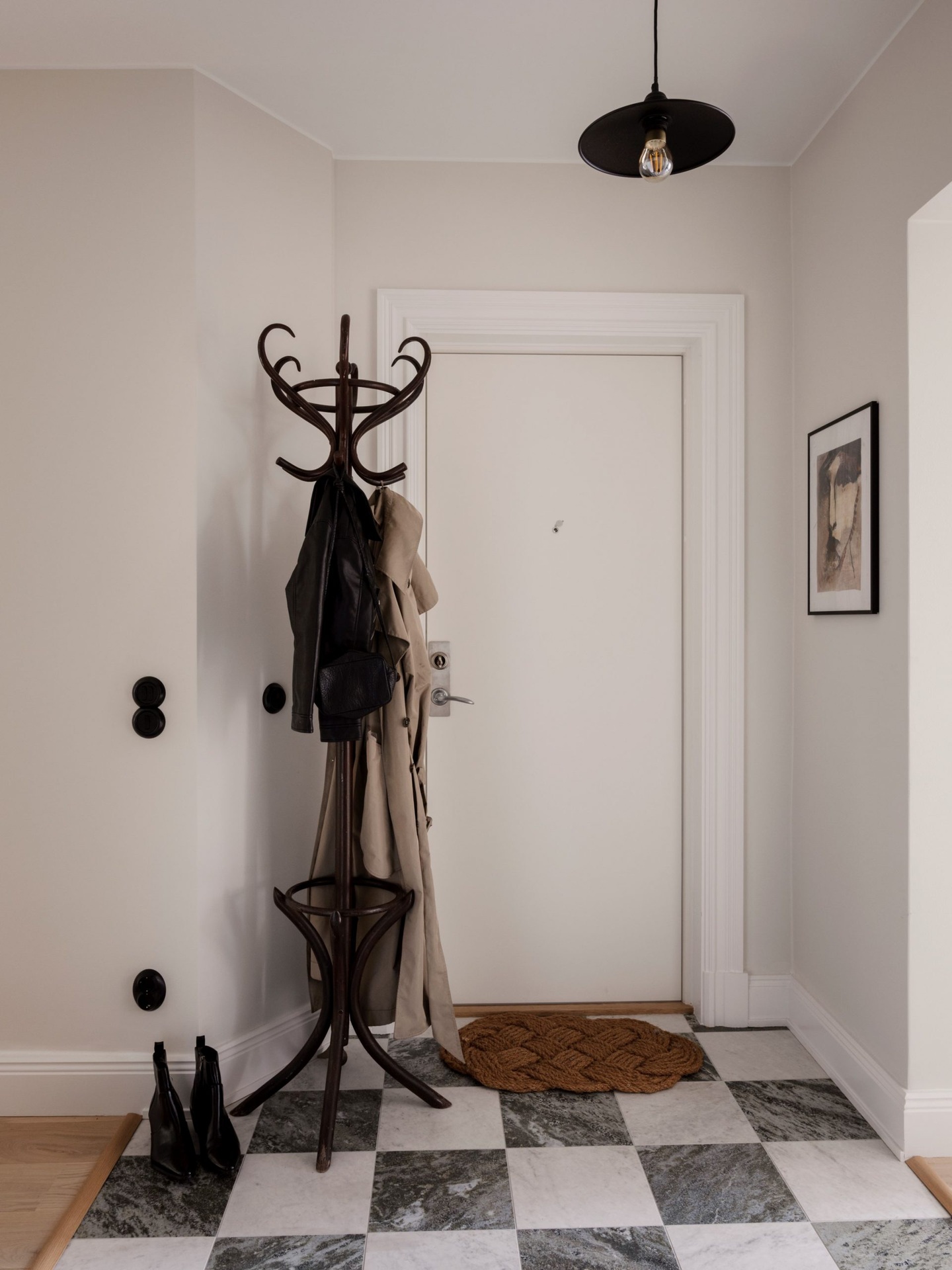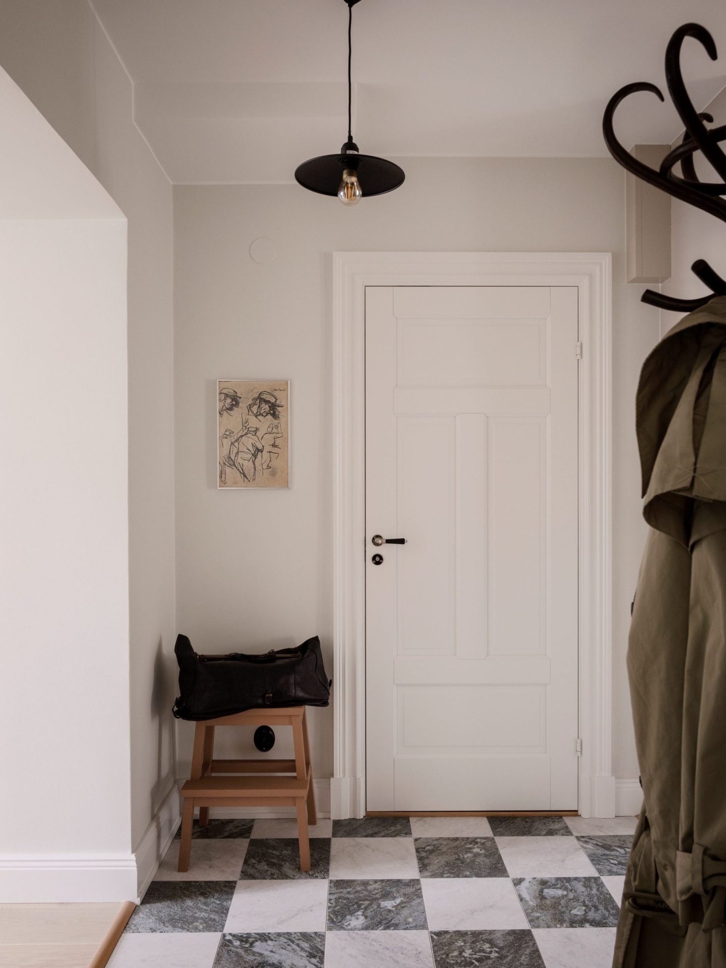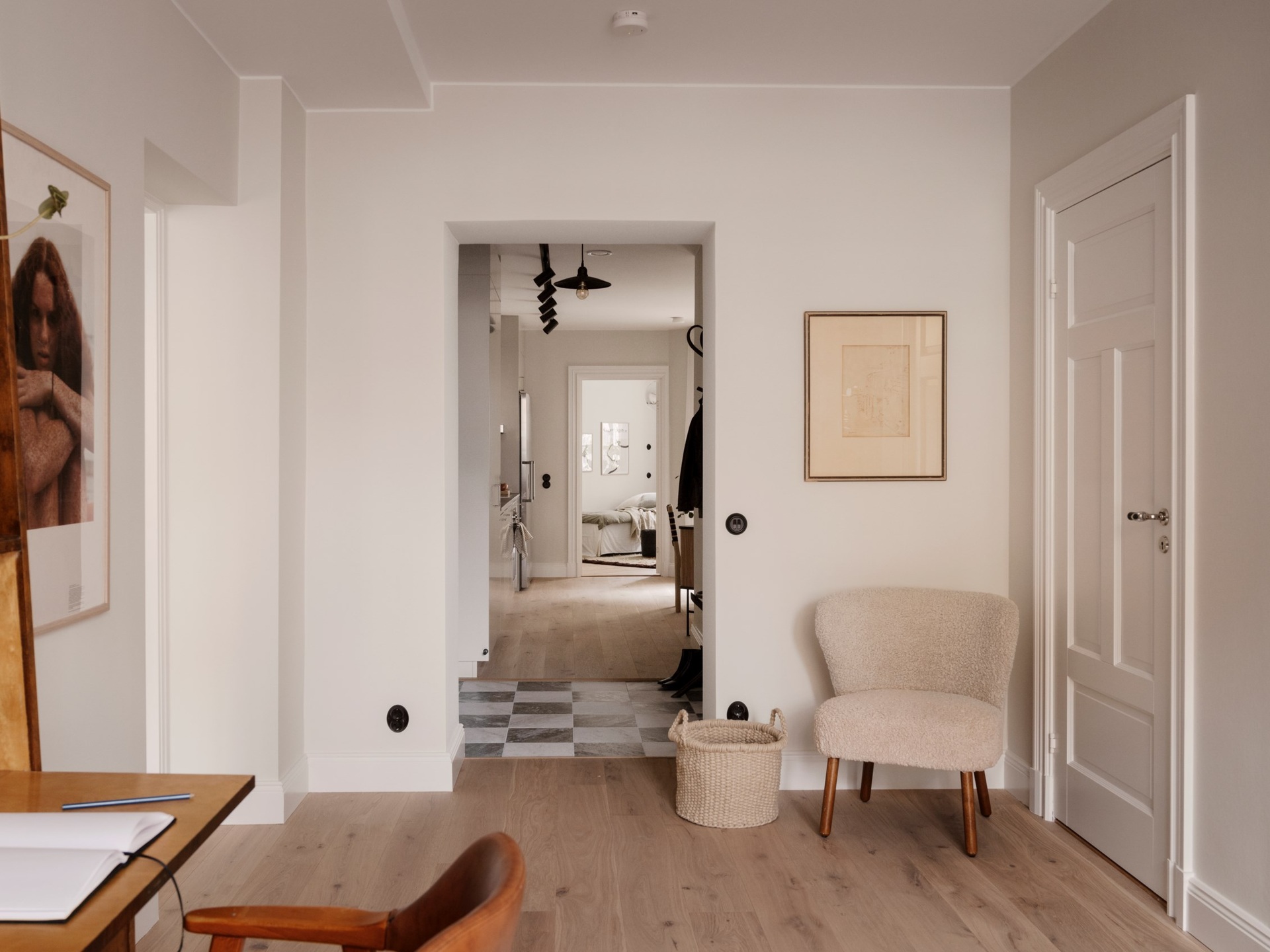 Ezt a 84 m²-es lakást egy régi irodából alakították át. Szépen ötvözi az 1912-ben épült ház régi elemeit a letisztult, északi stílussal. A skandináv dekoráció a lágy tónusok palettáját használja néha olyan luxus anyagokkal ötvözve, mint a bejárati hallban található szürke és fehér kockás márványpadló. A lakás minden helyiségét fa díszlécek és lábazatok díszítik, amelyeket gondosan megőriztek a régi épületből. Az apartman hatalmas ablakai rengeteg természetes fényt engednek be, kiemelve a magas mennyezet nyújtotta tágasságot. A két hálószobás ingatlan alaprajzán is látható, hogy nagyon sok a ferde falsík, amit figyelembe kellett venni a nyitott konyha-étkező, az egyik hálószoba és a fürdőszoba berendezésénél.