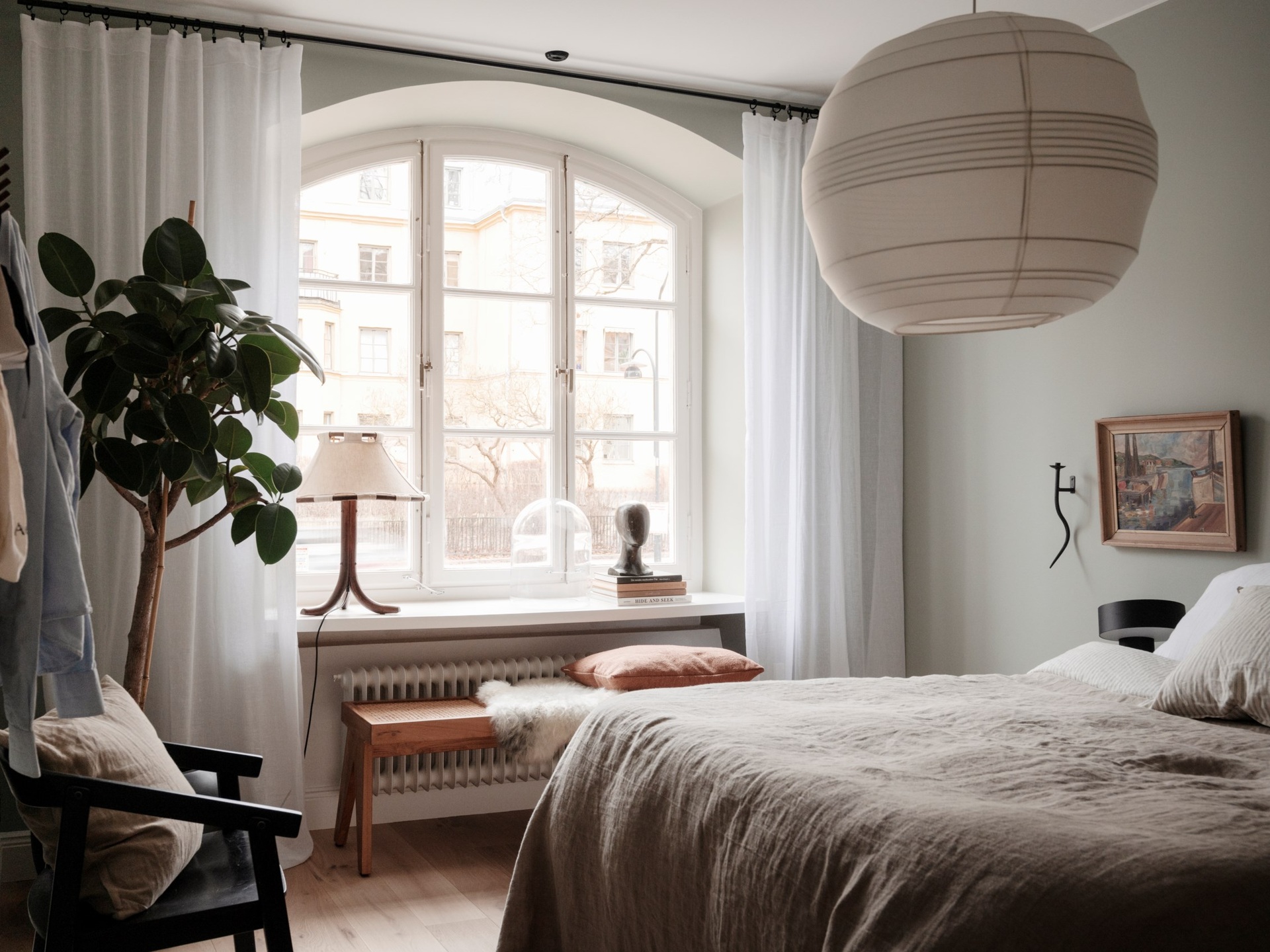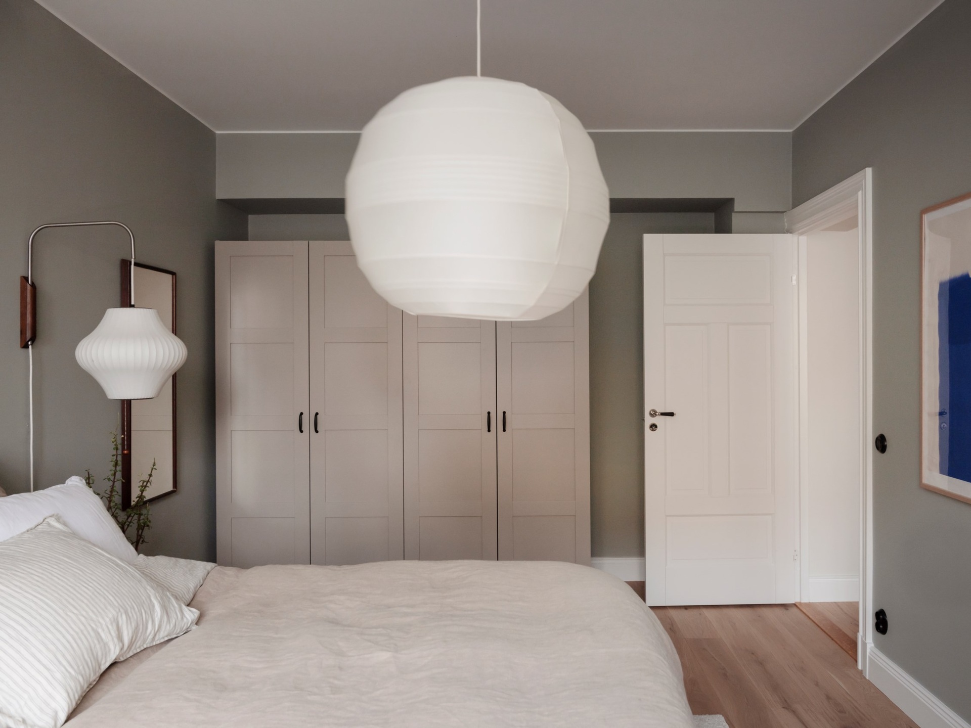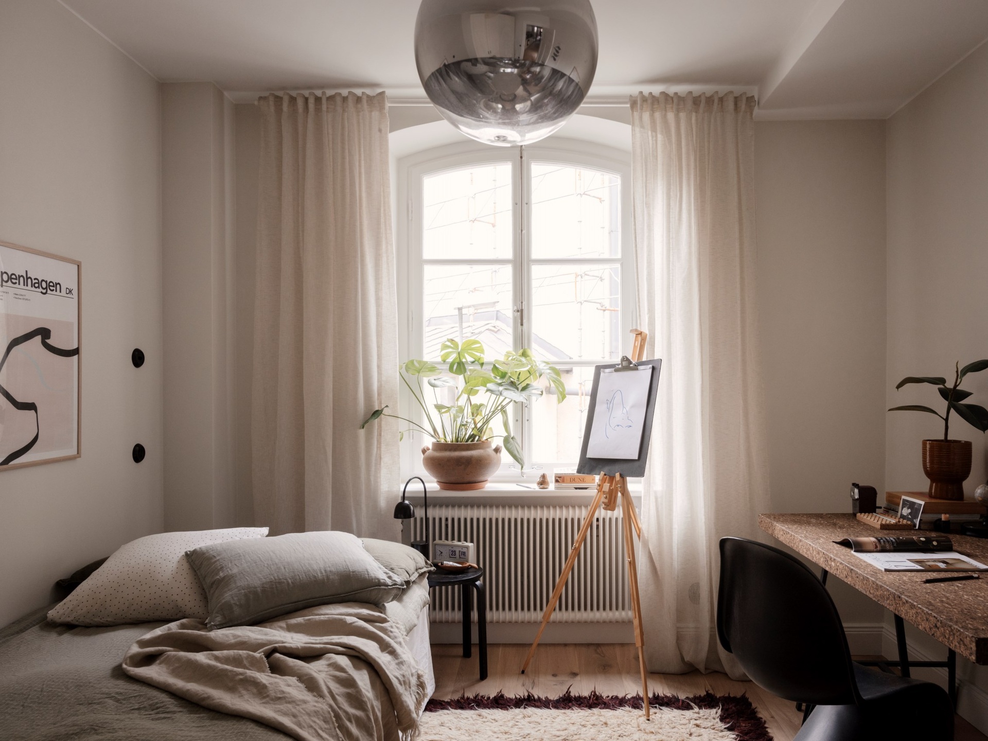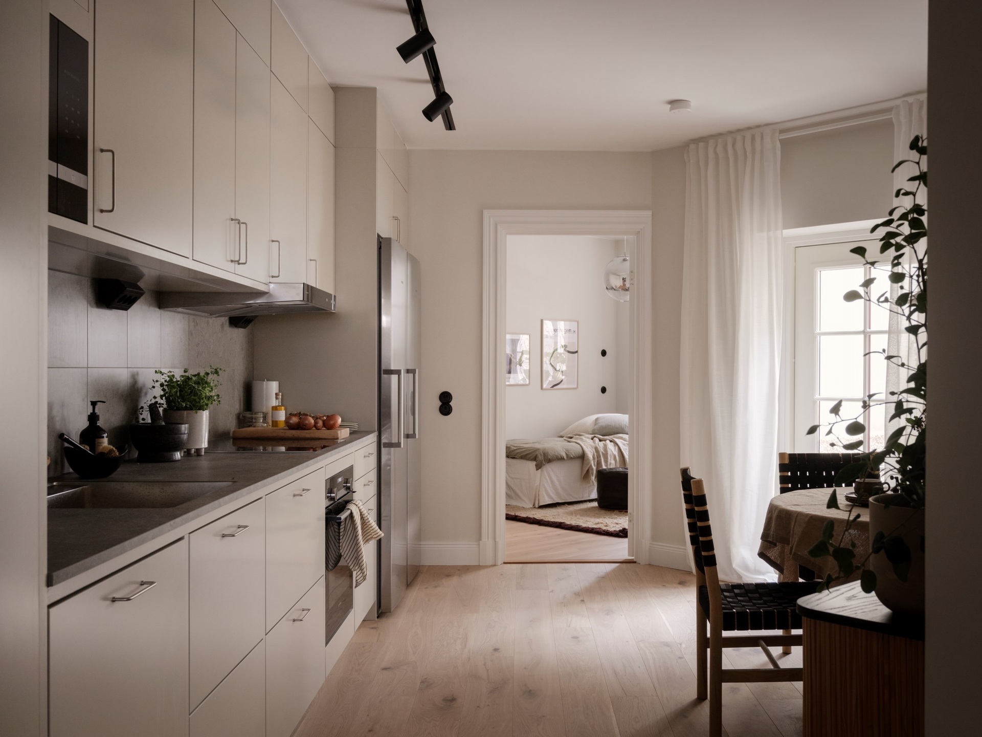 Ezt a 84 m²-es lakást egy régi irodából alakították át. Szépen ötvözi az 1912-ben épült ház régi elemeit a letisztult, északi stílussal. A skandináv dekoráció a lágy tónusok palettáját használja néha olyan luxus anyagokkal ötvözve, mint a bejárati hallban található szürke és fehér kockás márványpadló. A lakás minden helyiségét fa díszlécek és lábazatok díszítik, amelyeket gondosan megőriztek a régi épületből. Az apartman hatalmas ablakai rengeteg természetes fényt engednek be, kiemelve a magas mennyezet nyújtotta tágasságot. A két hálószobás ingatlan alaprajzán is látható, hogy nagyon sok a ferde falsík, amit figyelembe kellett venni a nyitott konyha-étkező, az egyik hálószoba és a fürdőszoba berendezésénél.