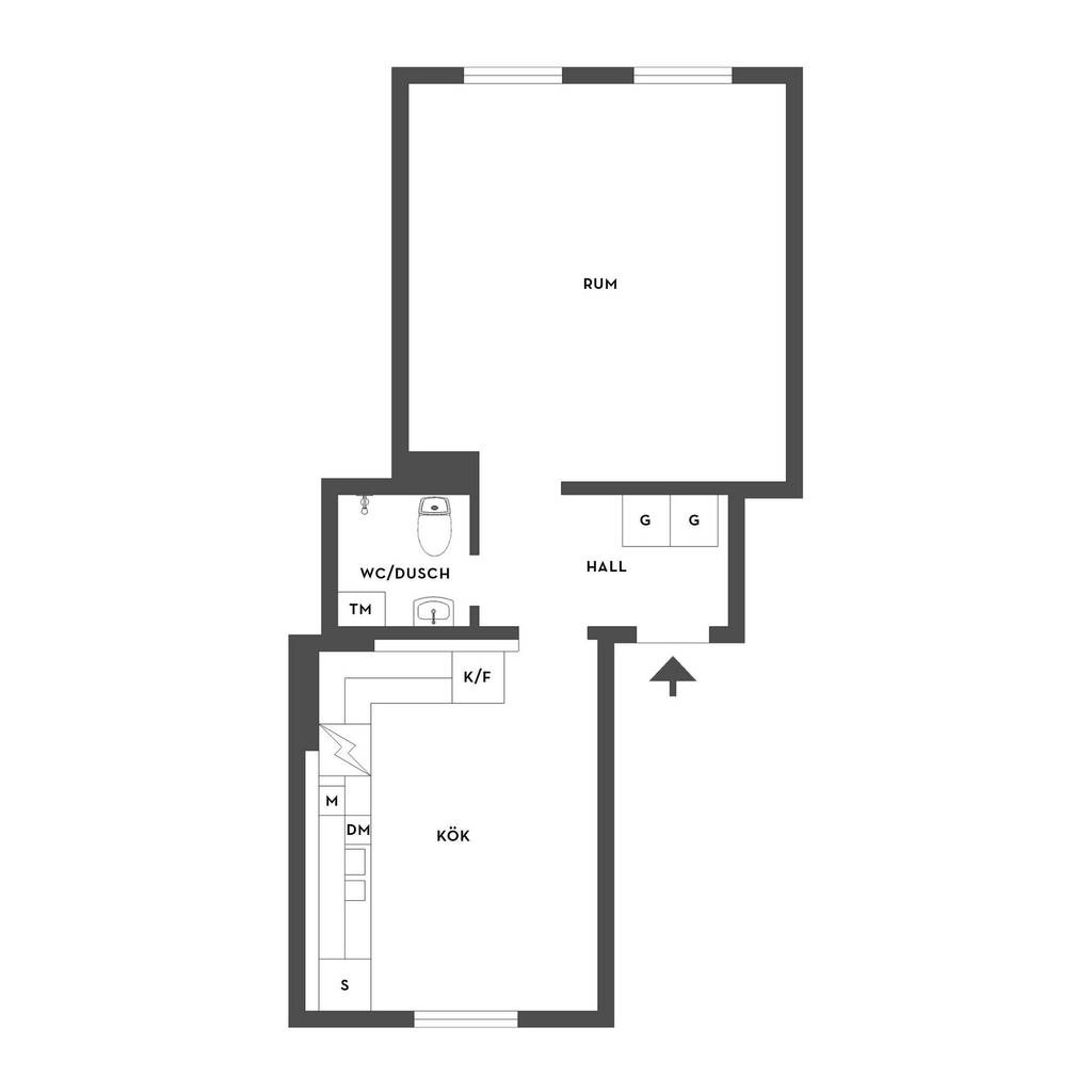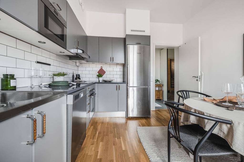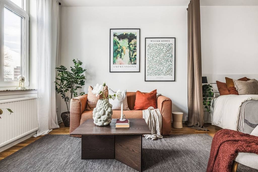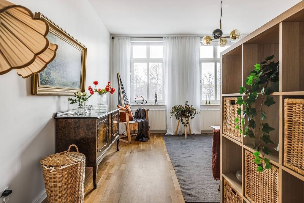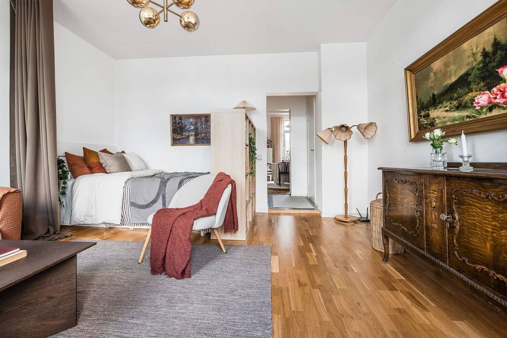 A vintage elemeknek és színeinek köszönhetően ez a 46 nm-es garzon moduláris térformákat kínál. Az étkezős konyha hatalmasnak tűnik a kis lakásban, míg a nappali, ahol az ágy napközben egy függöny mögé van rejtve, hozzá képest kisebb. Az elrendezés úgy is átalakítható, hogy valódi egy hálószobás lakás legyen, ha például egy kanapét helyezünk a konyhába, és a nappalit kizárólag a hálóhelyiségnek szenteljük. Ennek a lakásnak az alapterülete lehetővé teszi, hogy ezt megvalósítsuk. A nagy ablakokon beáramló fényt a klasszikus fehérre festett falak tovább erősítik. A dekoráció egyesíti a régi, családias hangulatot a modernebb kiegészítőkkel.