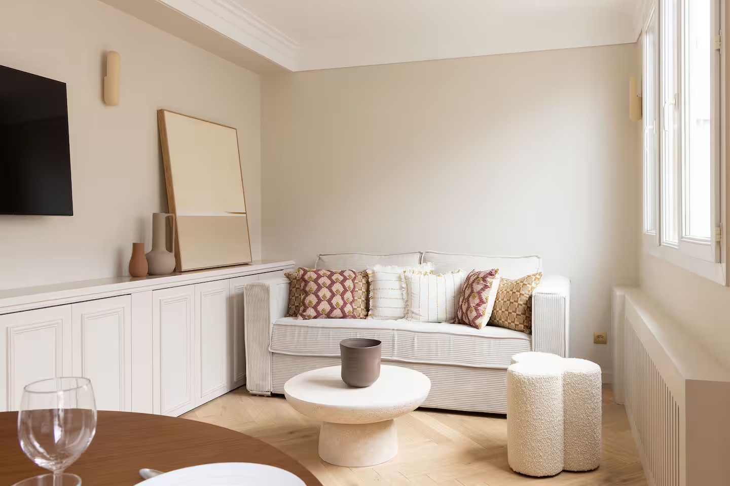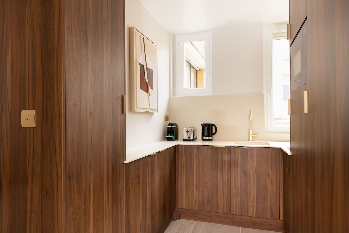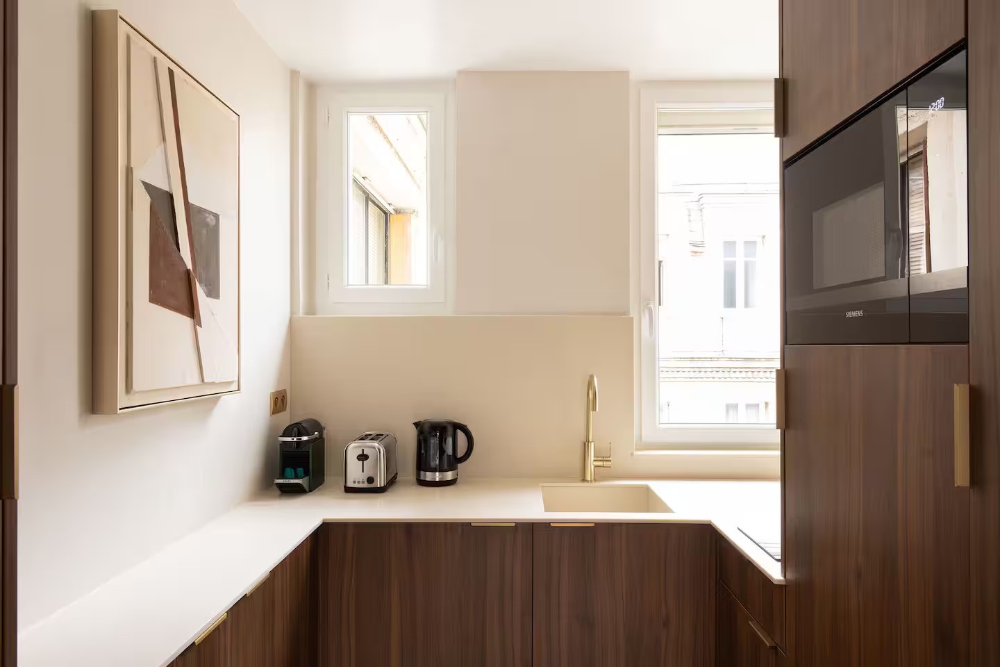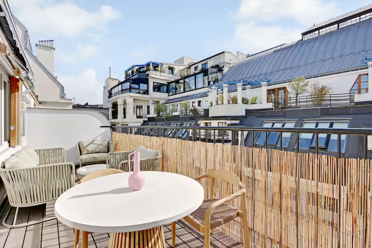 Bármelyik nagyvárosban ritka és értékes dolog, ha van egy terasz, amivel kiterjeszthetővé válik egy ingatlan. Ez a 42 m²-es lakás 20 m²-es terasszal rendelkezik, ami gyakorlatilag a nappali meghosszabbítása, és 180°-os kilátást kínál a város tetőire. A berendezése elegáns, letisztult stílusú, amelyben a bézs árnyalatok és a puha anyagok dominálnak. Nemcsak kifinomult, hanem tökéletesen funkcionális is a viszonylag nagy konyhájával és a kényelmes zuhanyzójával.
