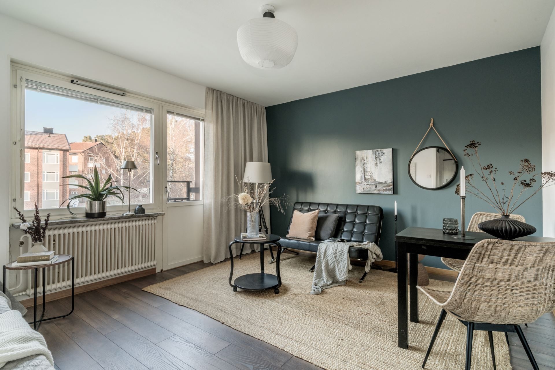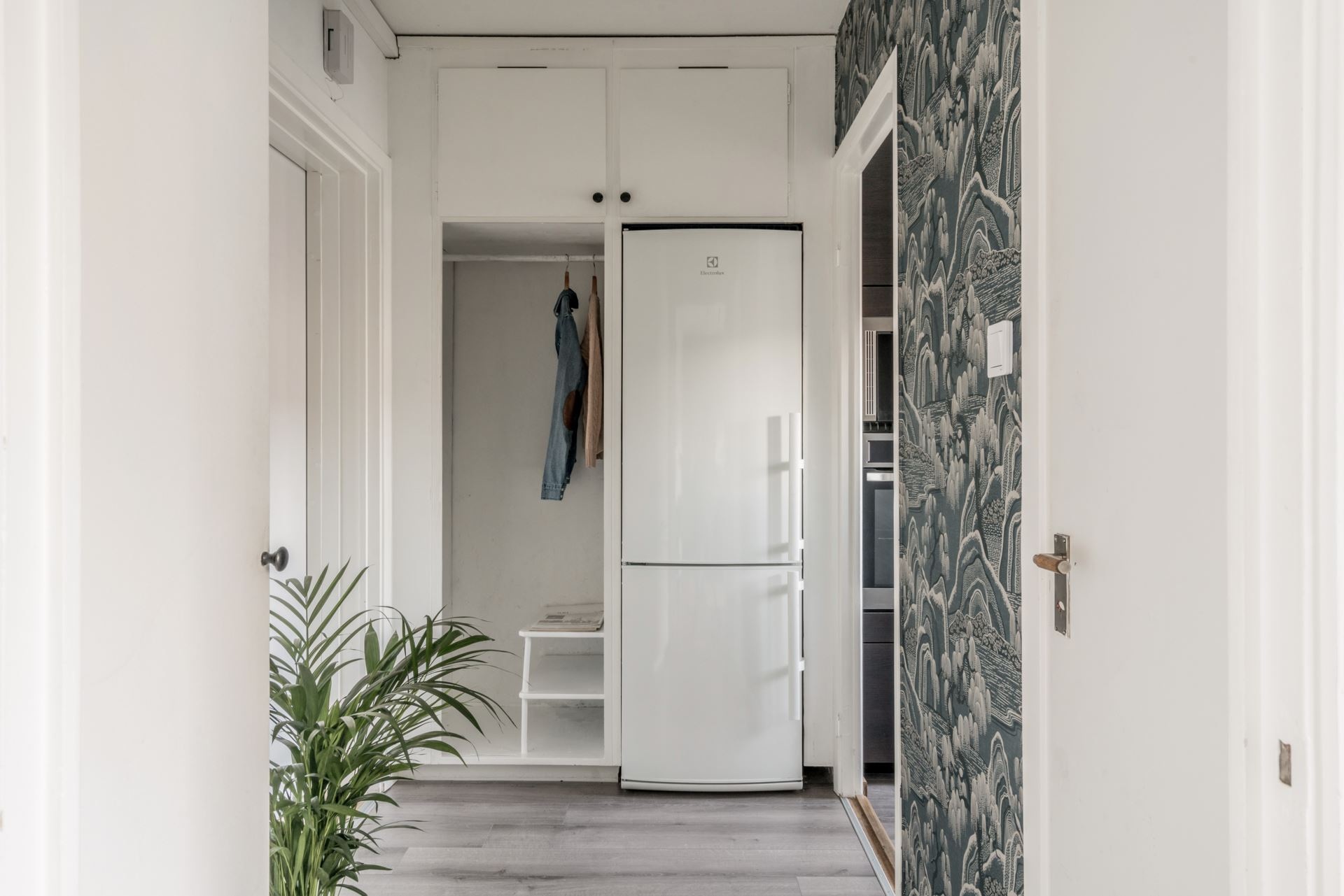 Egy stúdióban különösen érdekes kihívás színzónázást alkalmazni, hogy elkülönítsük egymástól a különböző funkciójú tereket. Ezt a megoldást alkalmazták a következő a 27 m²-es lakásban, ahol a nappali központi szerepet kap, míg az alvóterület szinte láthatatlanná válik. A nappaliban alkalmazott kék/zöld színek valódi figyelemfelkeltő elemként szerkezetet adnak az egyterű nappali-háló-étkező helyiségének. A színzónázás technikája még látványosabb akkor, ha a többi fal fehér, vagy semleges színű, ahogyan itt is látható.