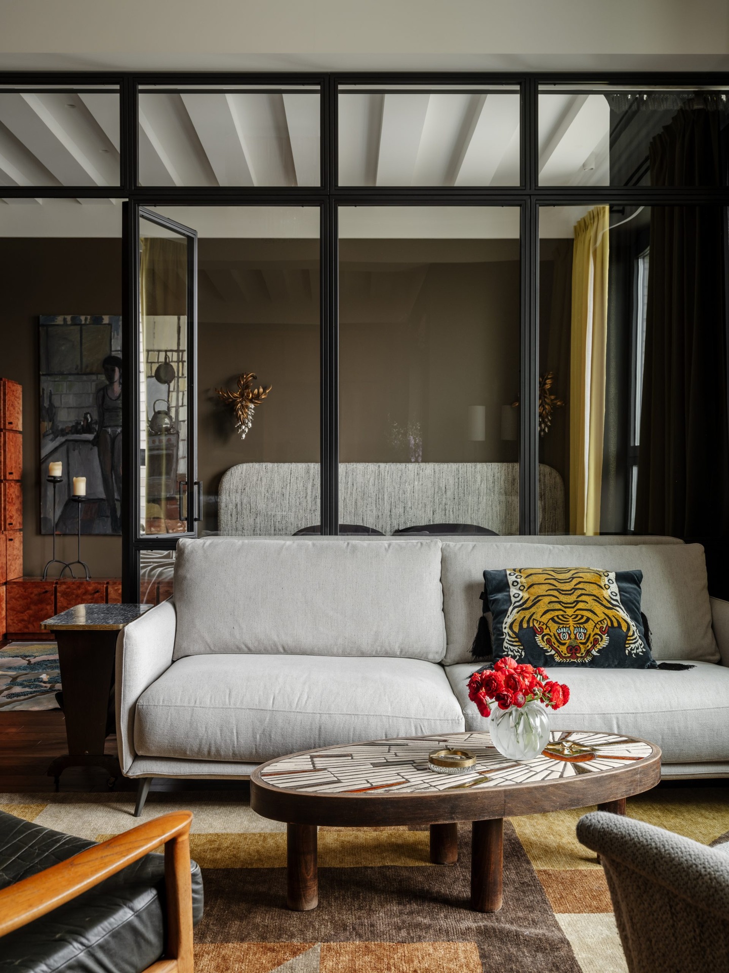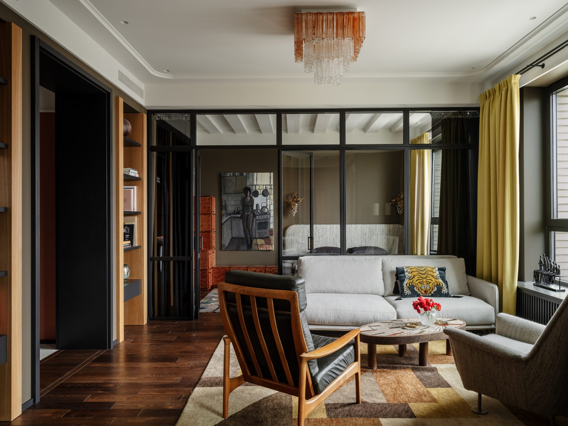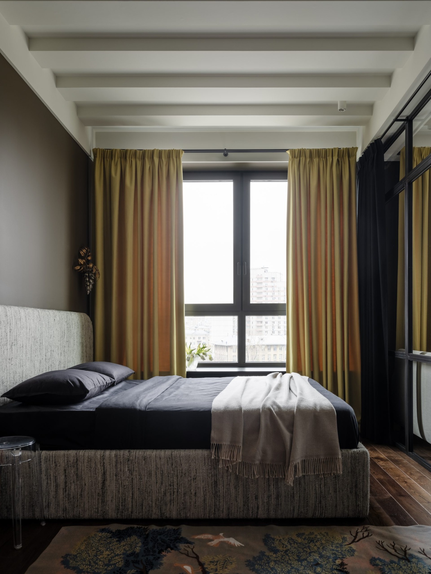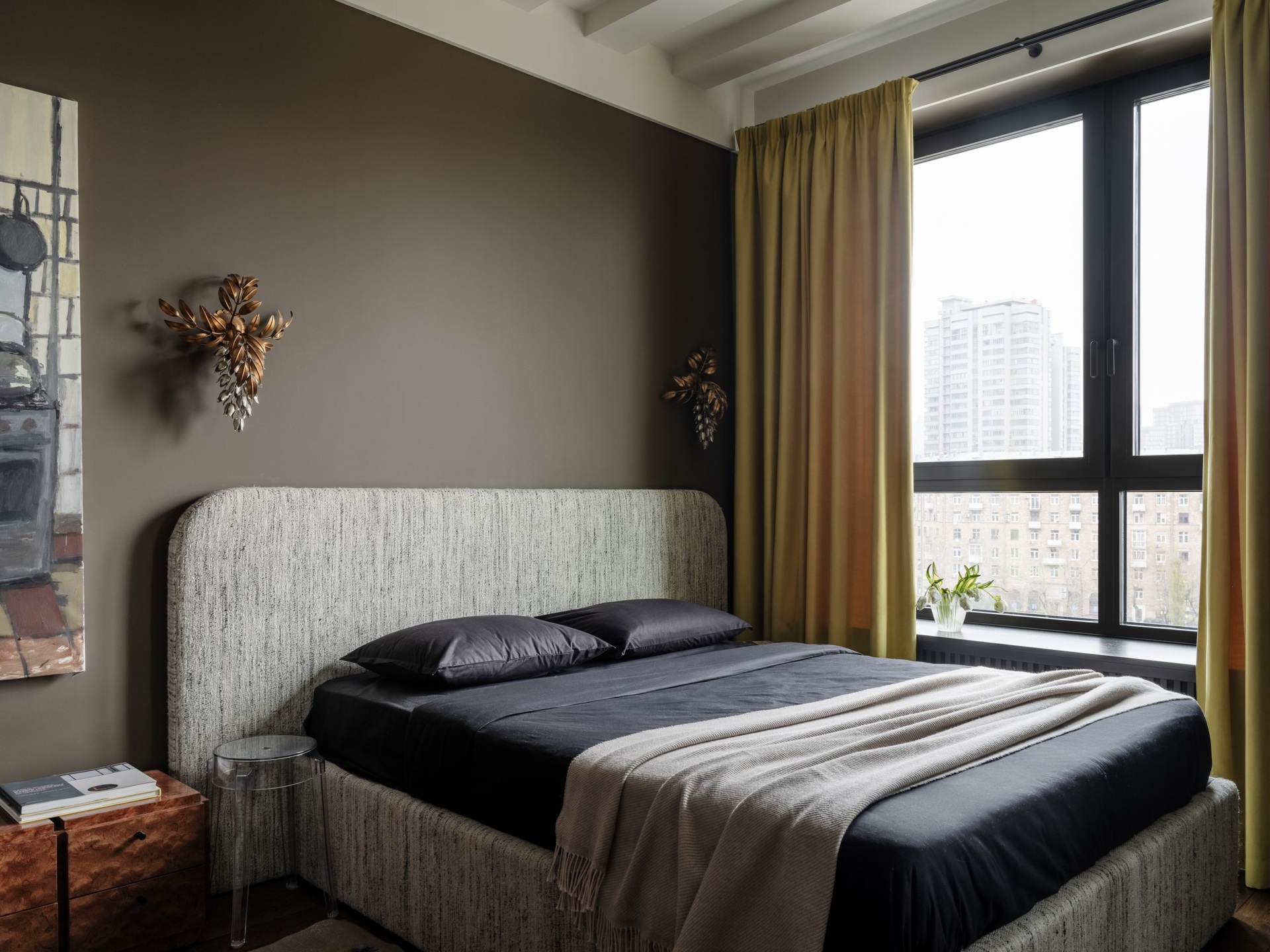 Ez a 68 m²-es lakás a férfias elegánanciát és az időtlen életstílust ünnepli. A nagy ablakokon át rengeteg természetes fény jut be a térbe, ezért nem féltek sötét színeket használni a berendezéshez. A tulajdonos nagy figyelmet fordított a kortárs dekoráció minden egyes részletére az egyedi vintage bútoroktól egészen az olyan anyagokig, mint például a bejáratnál található márványpadló. A lakás két fő részből áll: egy nappali-konyhából és egy hálószobából fürdőszoba kapcsolattal. Ezeket a tereket egy fekete acélból készült, üvegezett térelválasztó választja el, amely teljesen elhúzható függönyökkel is elzárható a nagyobb intimitás érdekében. A színpaletta klasszikusan fehér a mennyezeteknél, de egy meleg fahéjszín kiegészíti, hogy valódi személyiséget adjon a helyiségeknek.