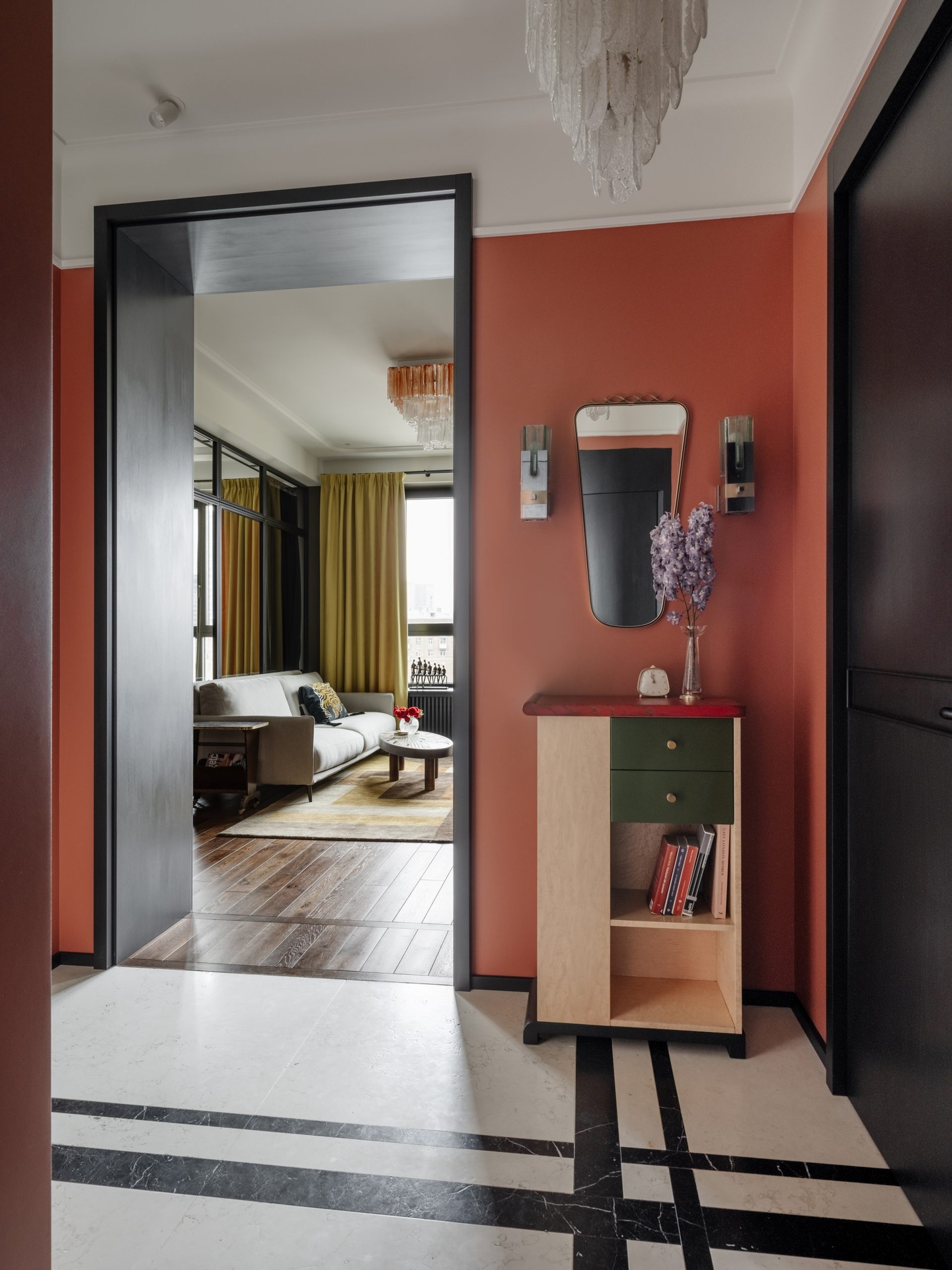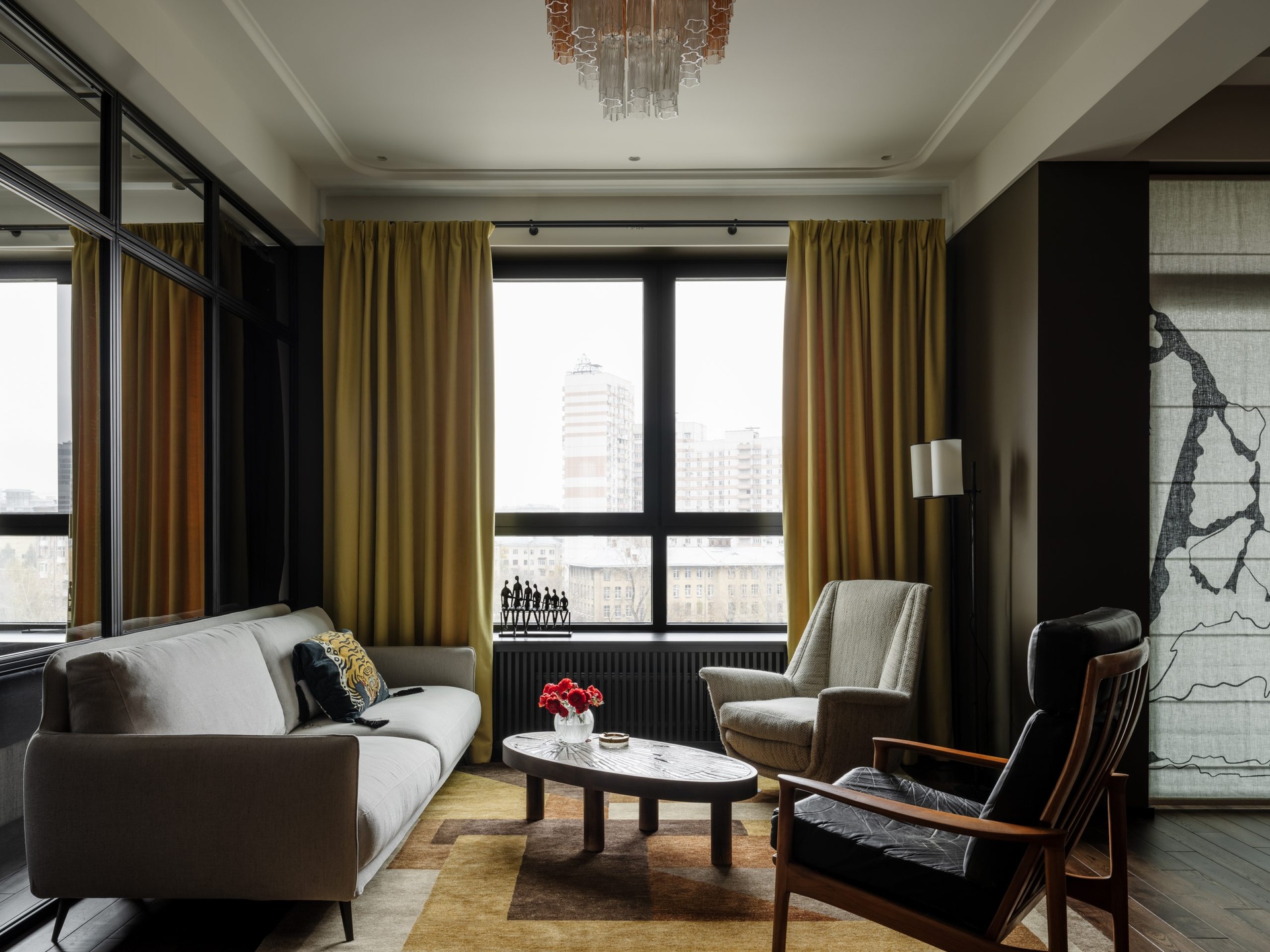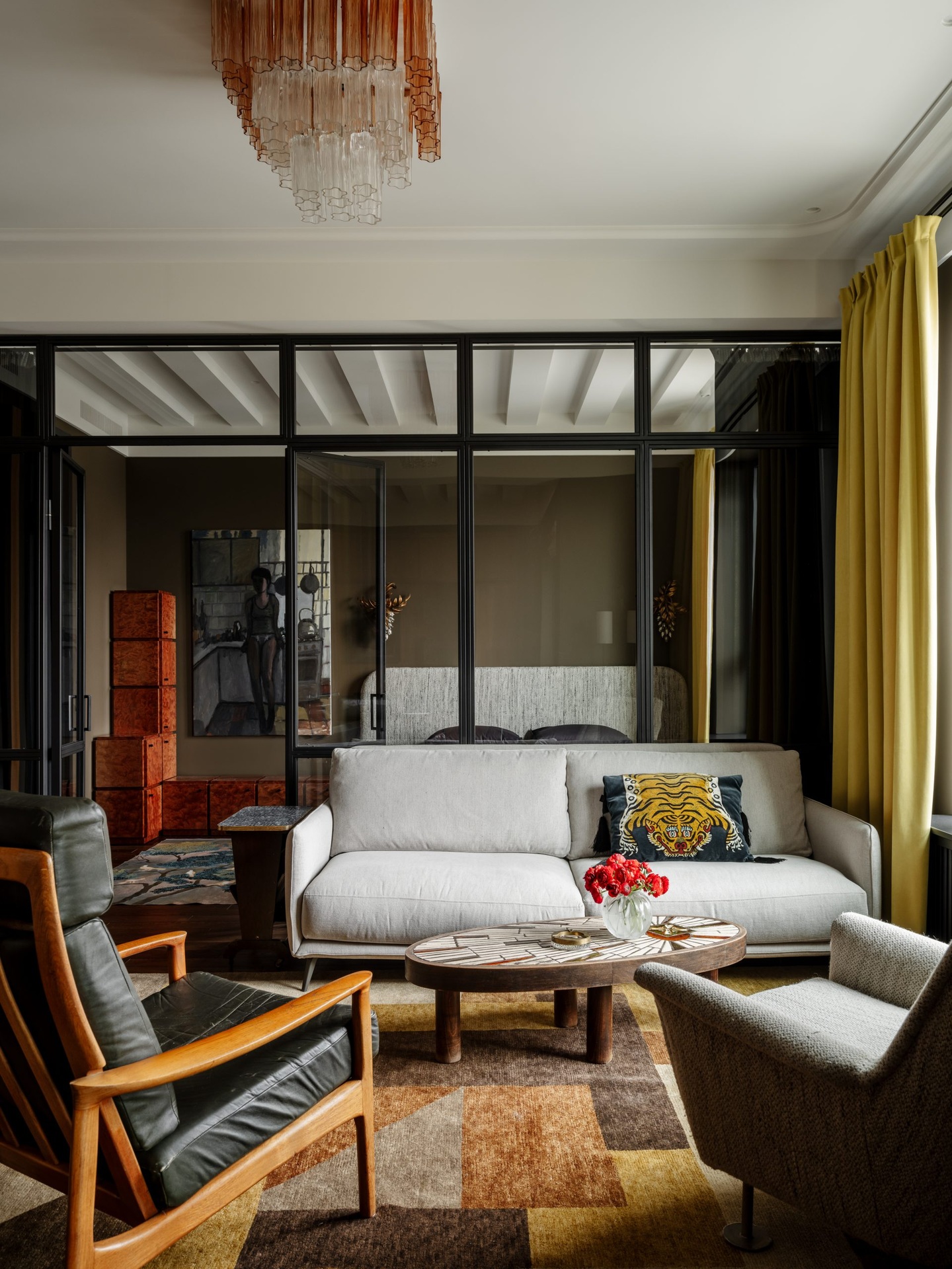 Ez a 68 m²-es lakás a férfias elegánanciát és az időtlen életstílust ünnepli. A nagy ablakokon át rengeteg természetes fény jut be a térbe, ezért nem féltek sötét színeket használni a berendezéshez. A tulajdonos nagy figyelmet fordított a kortárs dekoráció minden egyes részletére az egyedi vintage bútoroktól egészen az olyan anyagokig, mint például a bejáratnál található márványpadló. A lakás két fő részből áll: egy nappali-konyhából és egy hálószobából fürdőszoba kapcsolattal. Ezeket a tereket egy fekete acélból készült, üvegezett térelválasztó választja el, amely teljesen elhúzható függönyökkel is elzárható a nagyobb intimitás érdekében. A színpaletta klasszikusan fehér a mennyezeteknél, de egy meleg fahéjszín kiegészíti, hogy valódi személyiséget adjon a helyiségeknek.